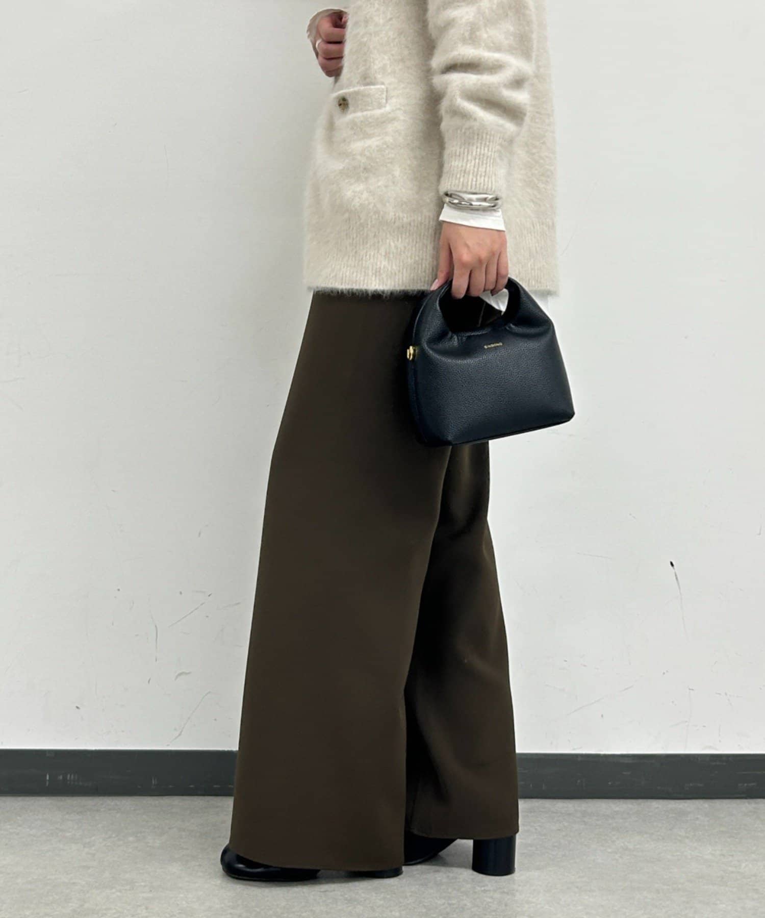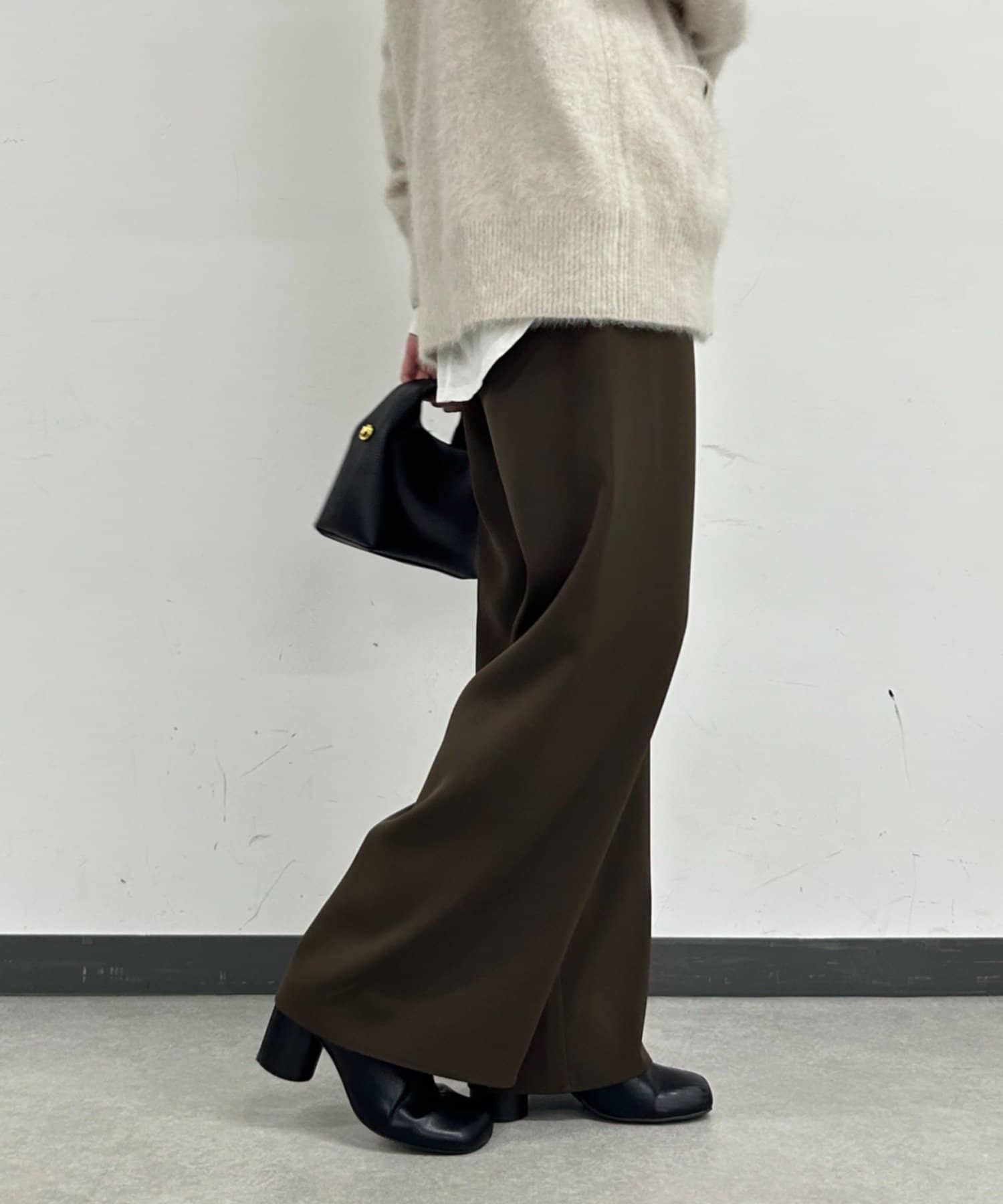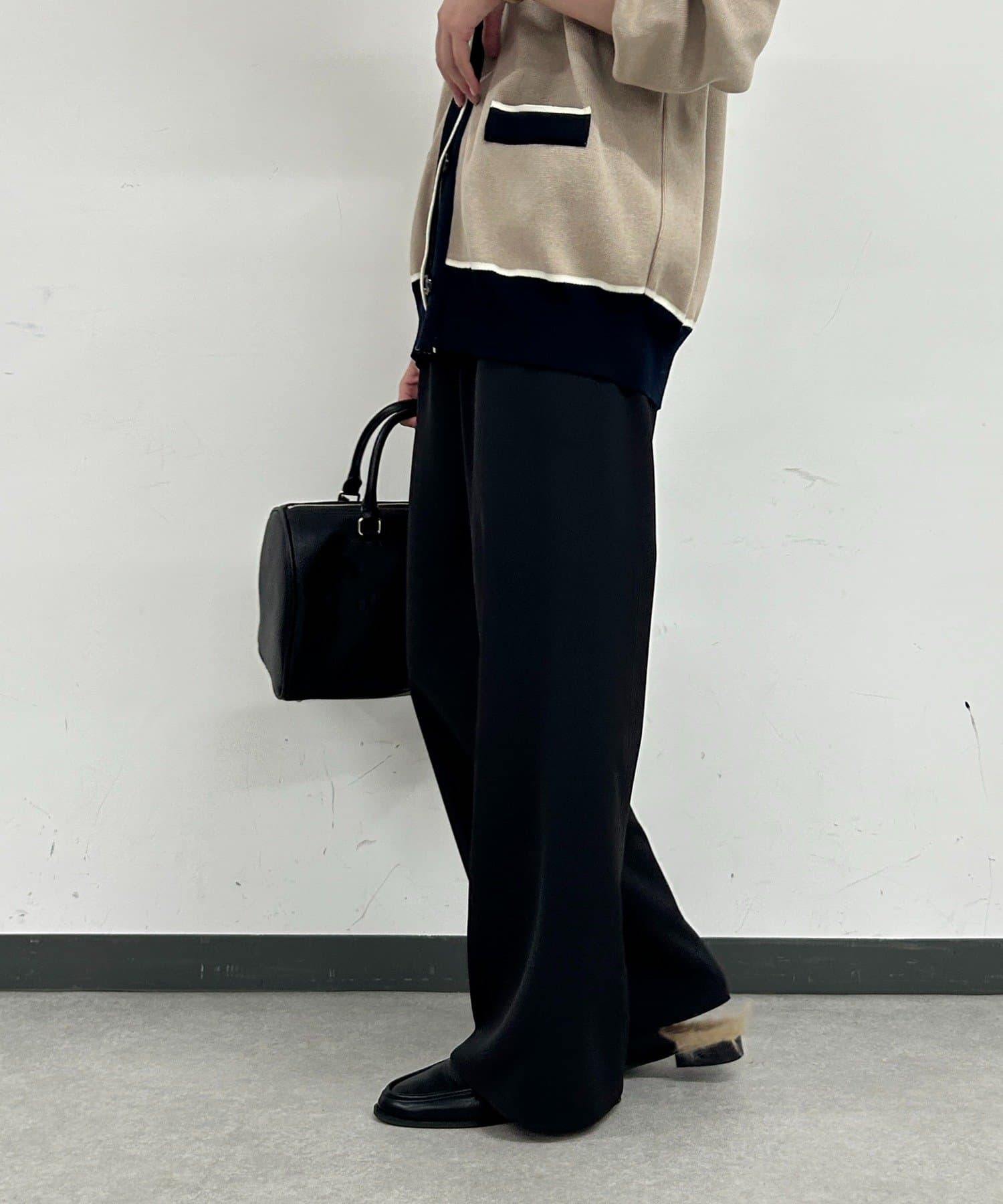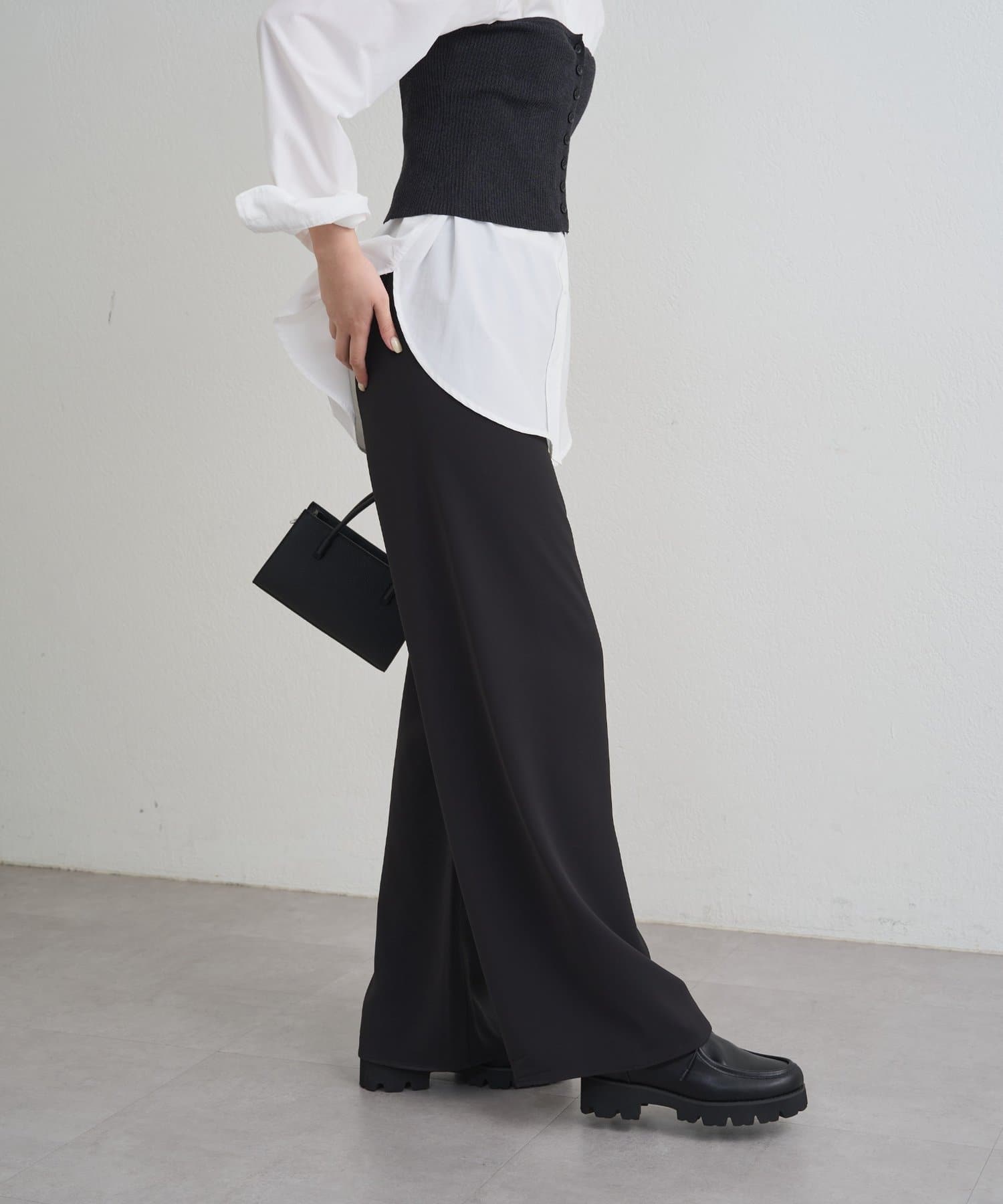 ストンと落ちるワイドシルエットが、気になるラインをカバーしつつ、スタイルアップ効果も。
