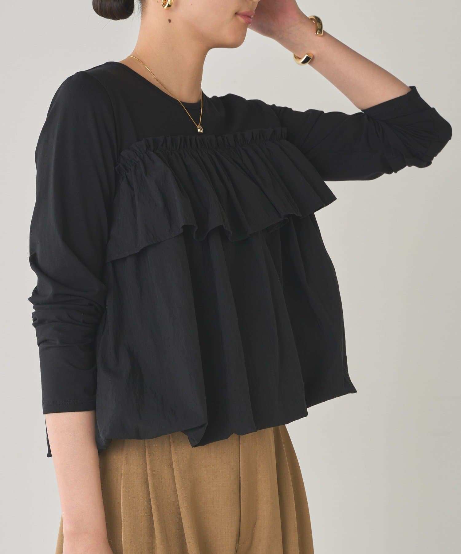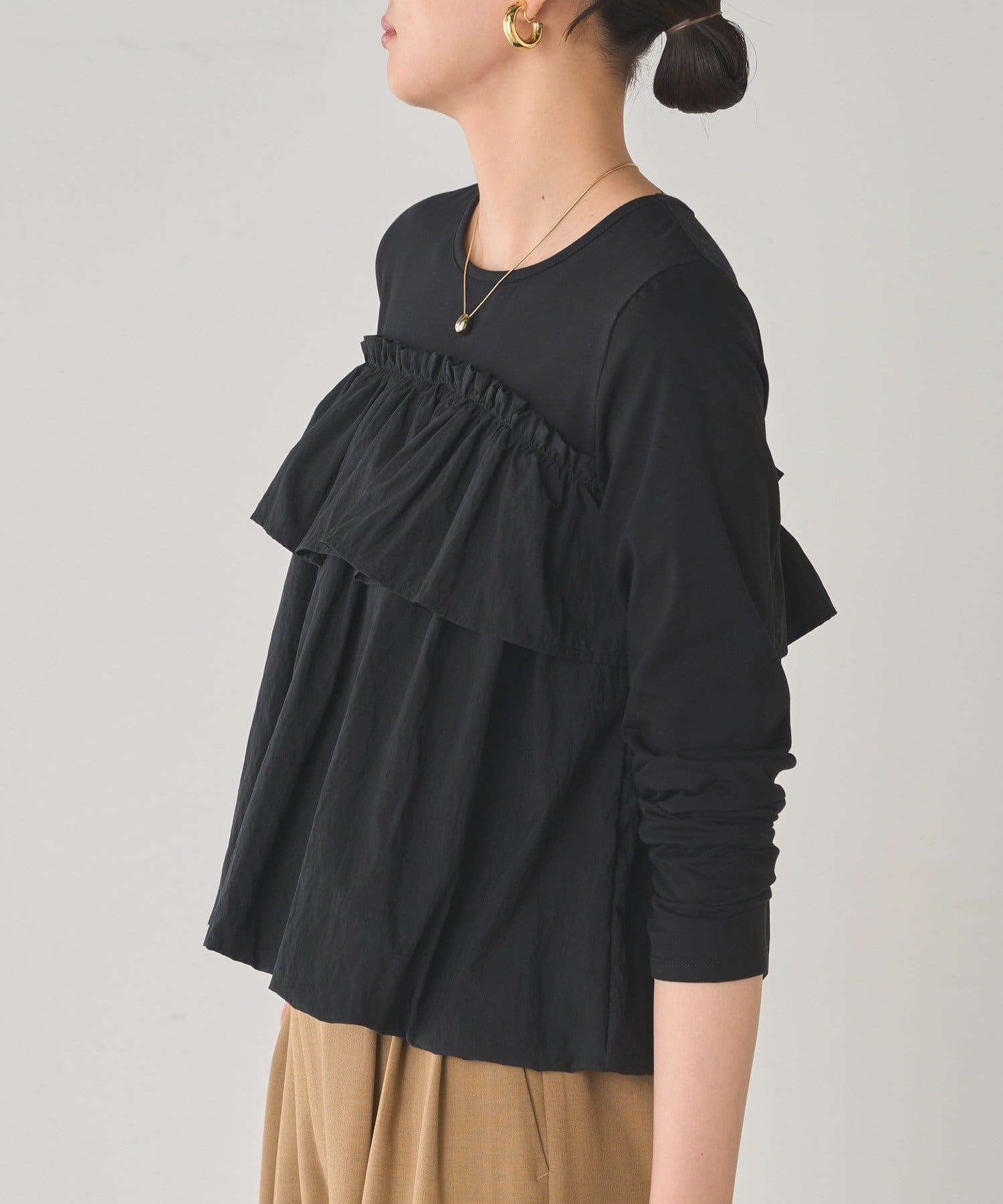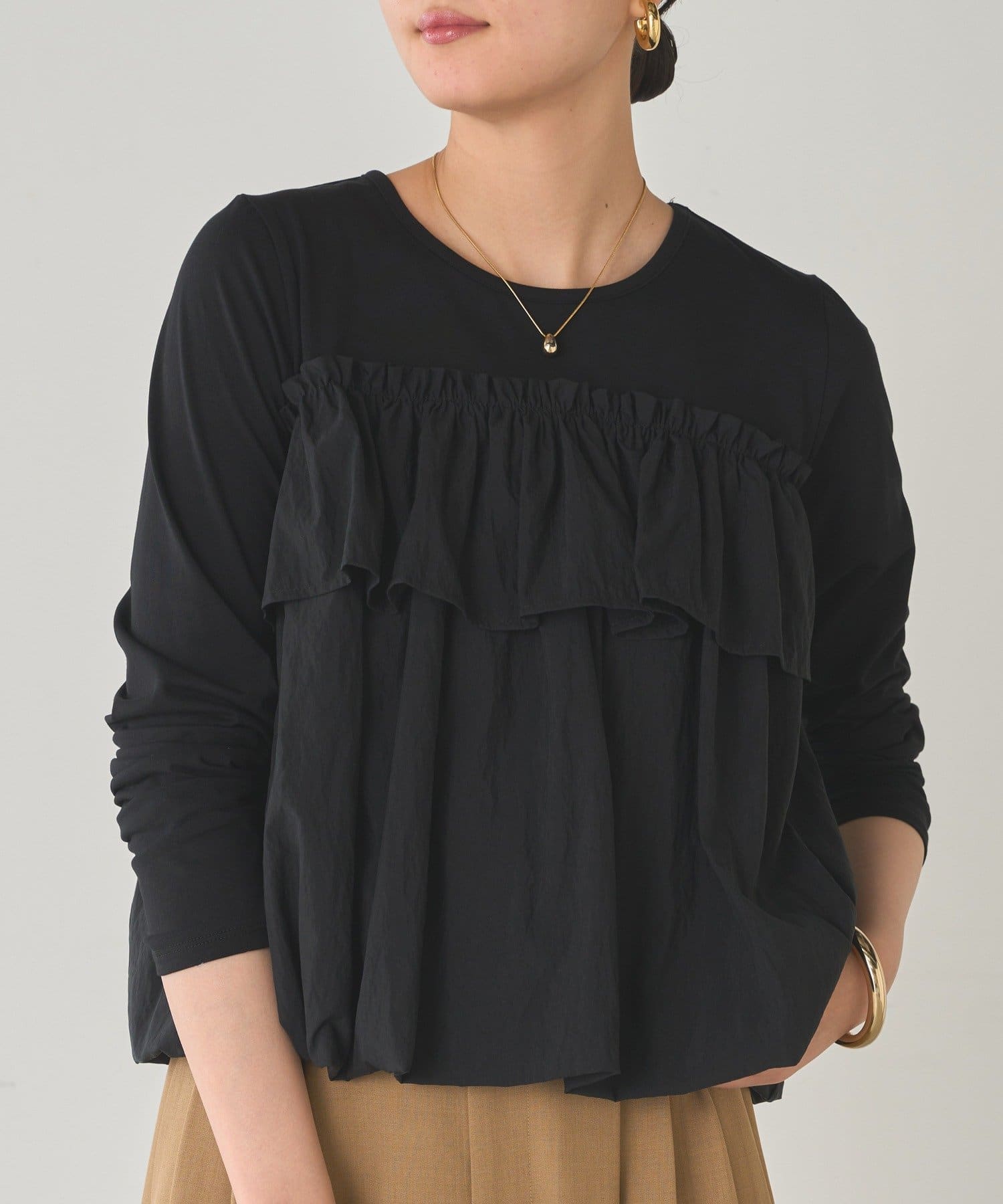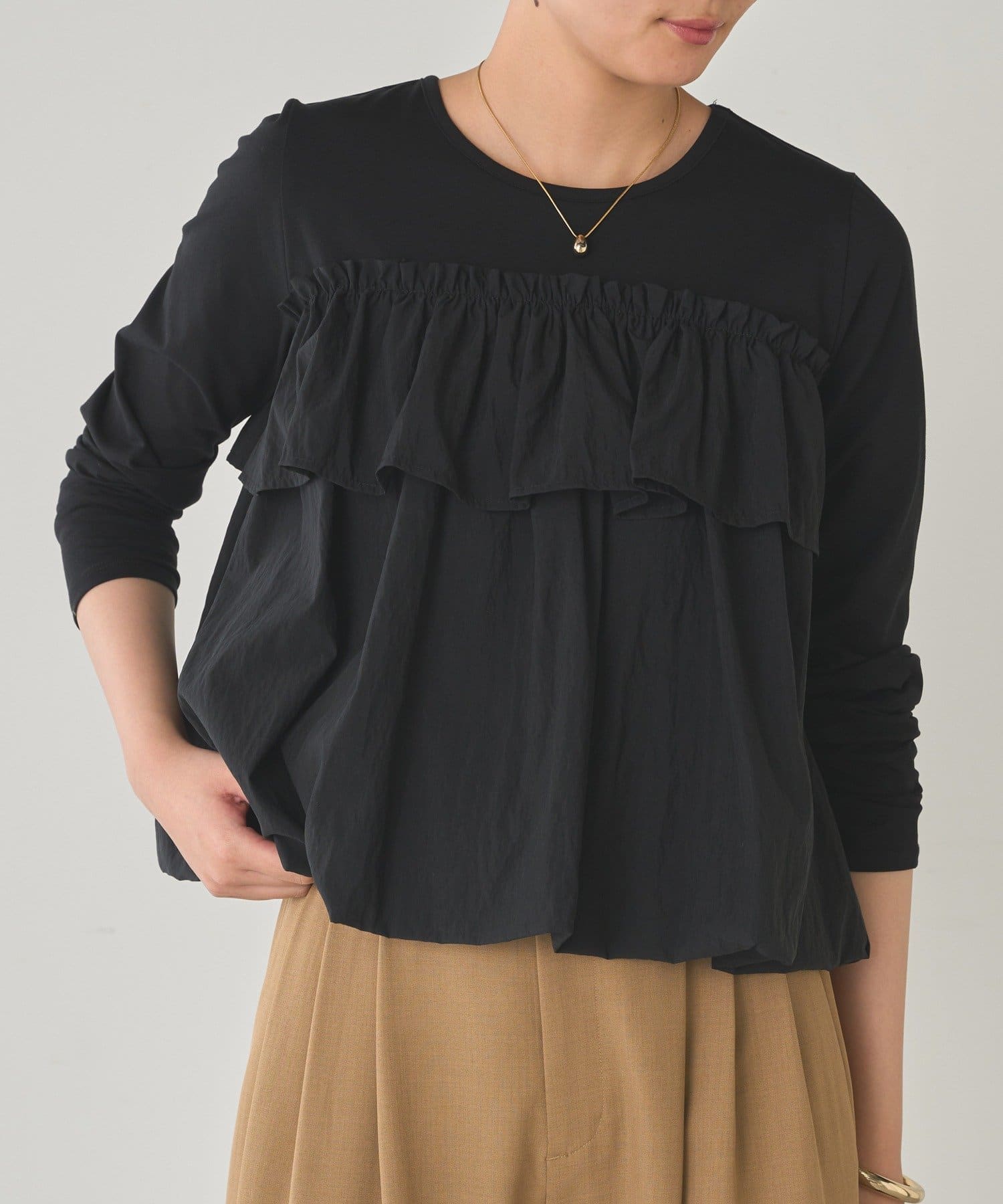 ベーシックな長袖トップスに、目を引くフリルデザイン。