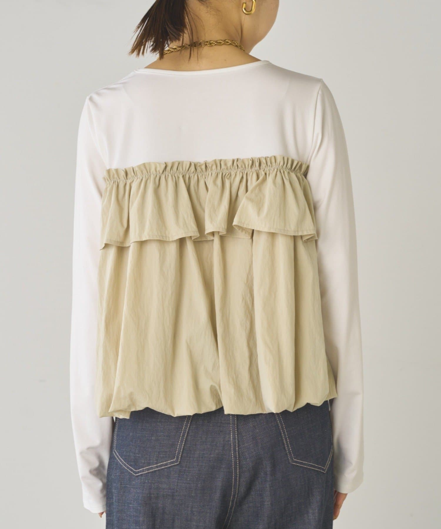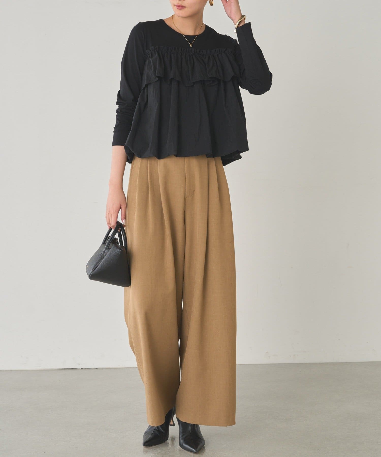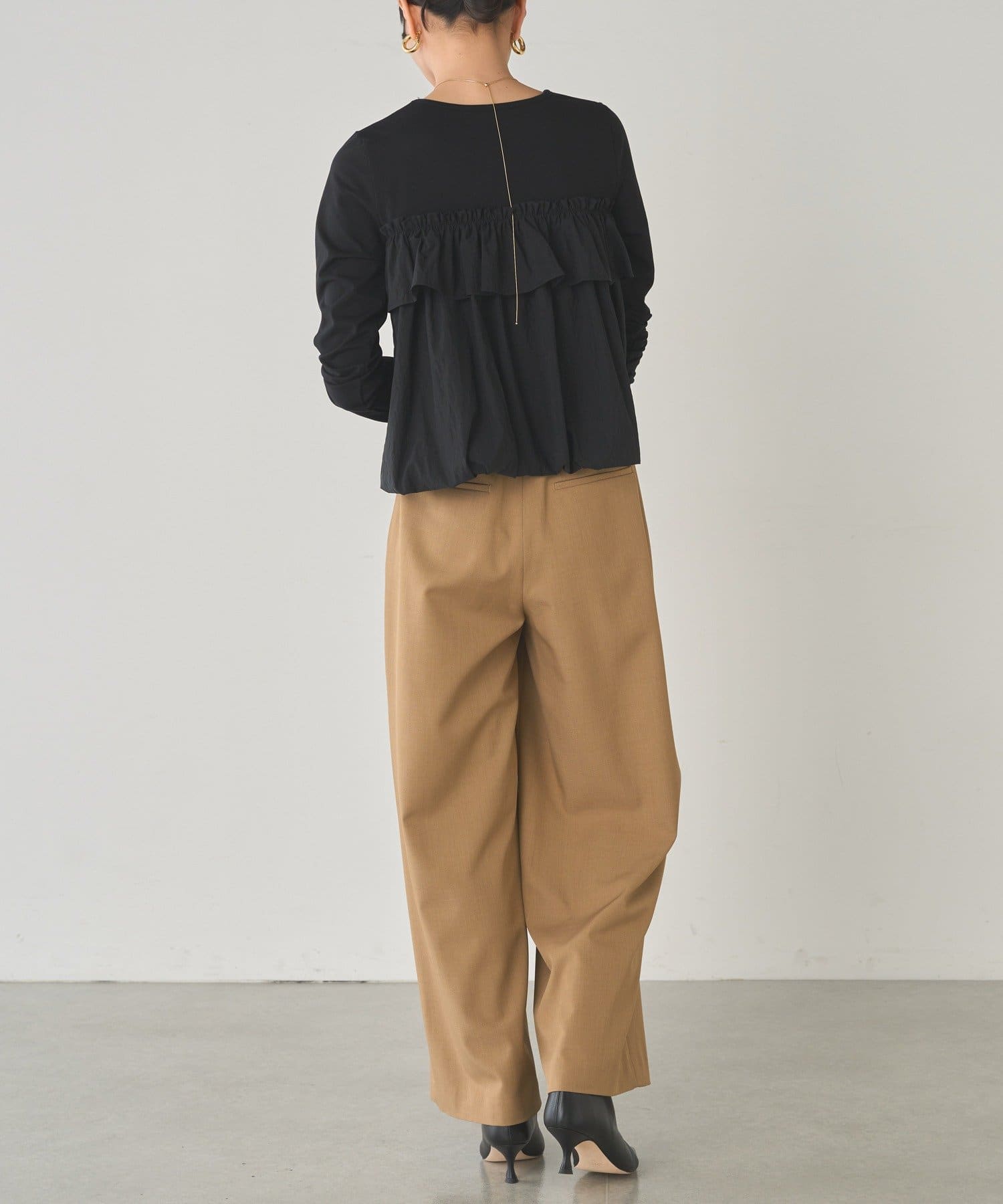 ベーシックな長袖トップスに、目を引くフリルデザイン。