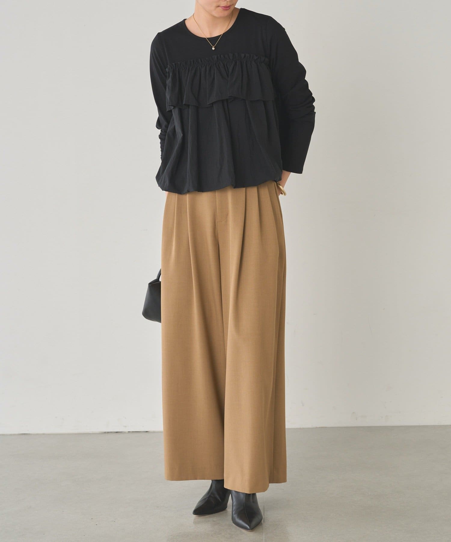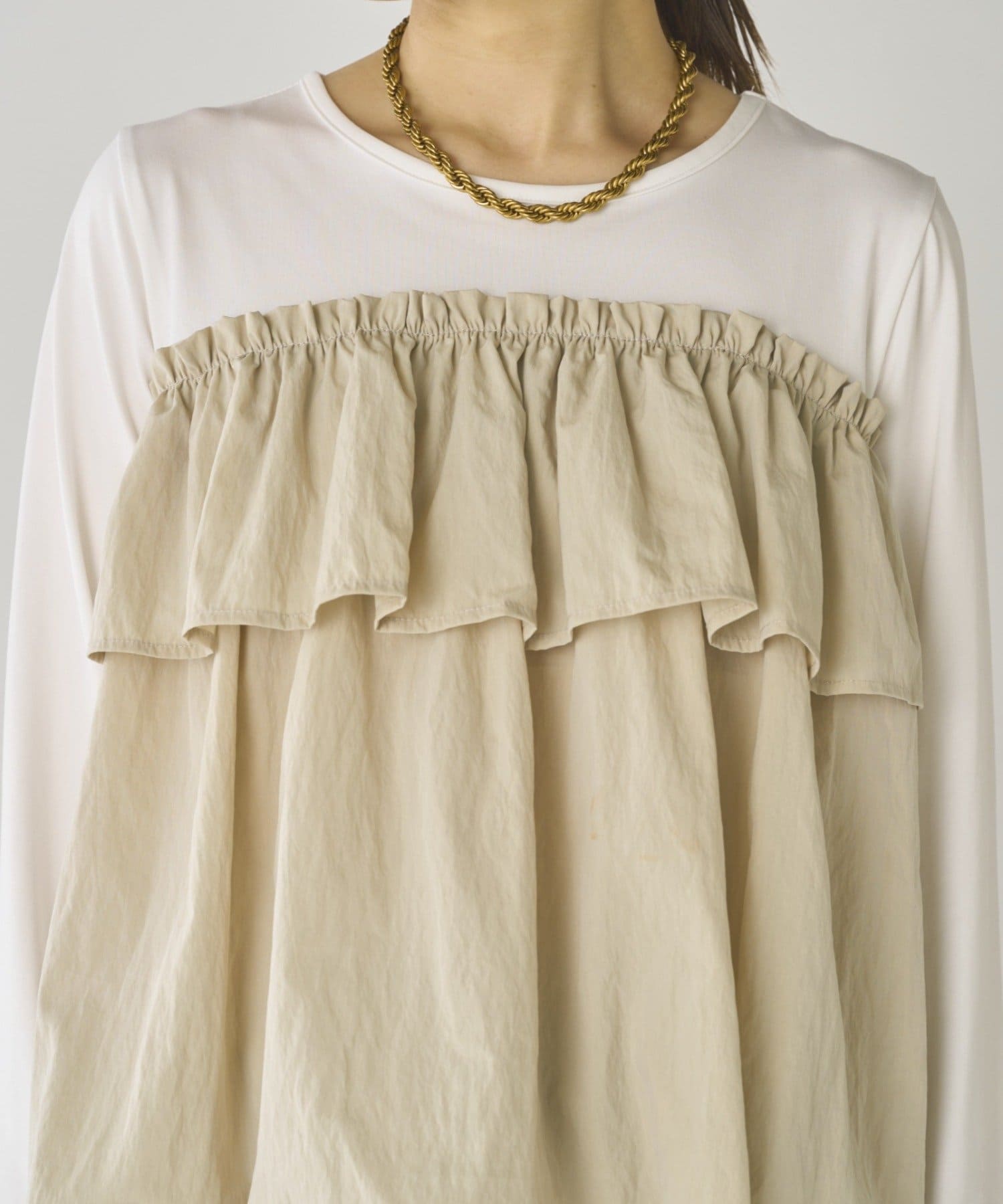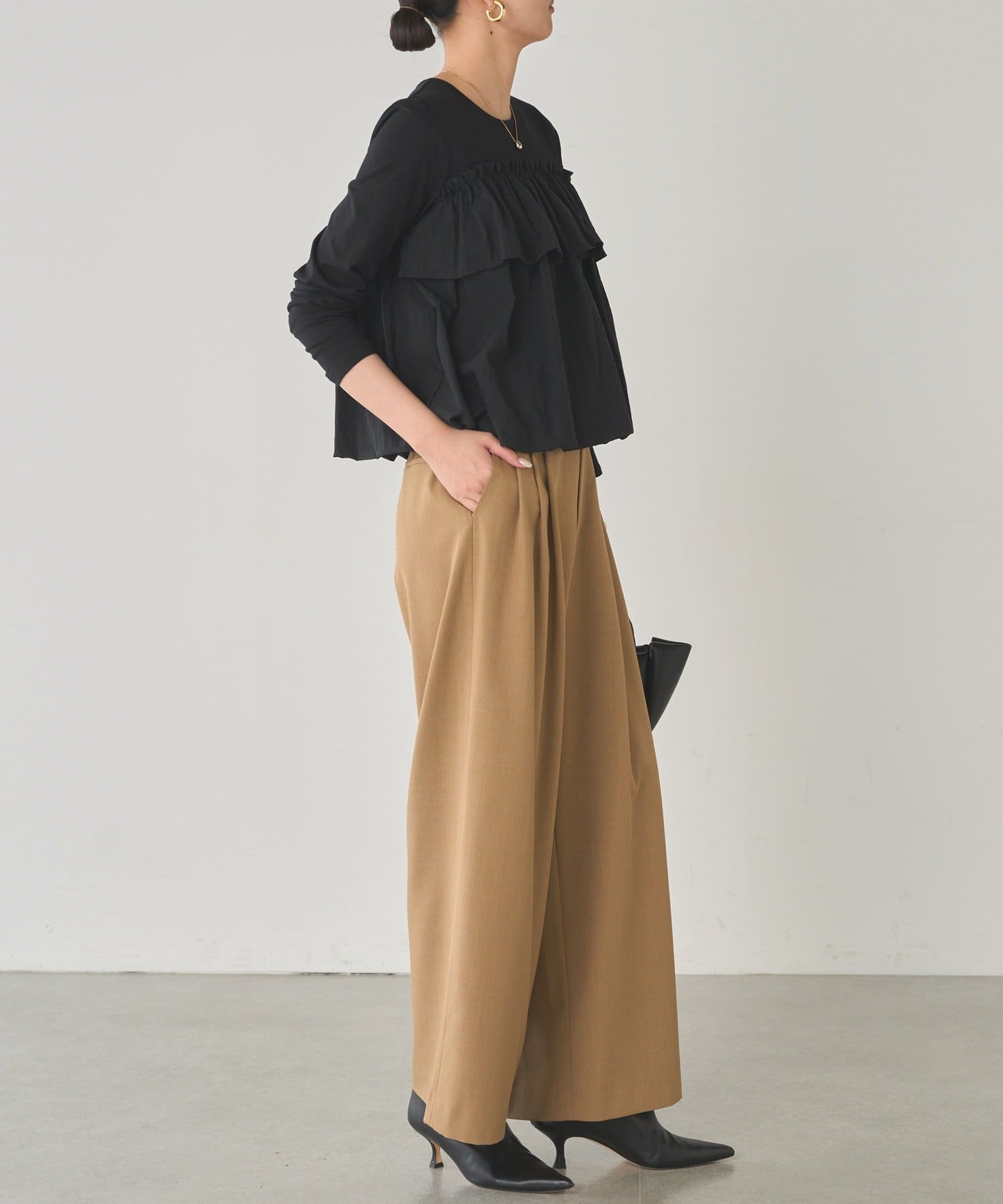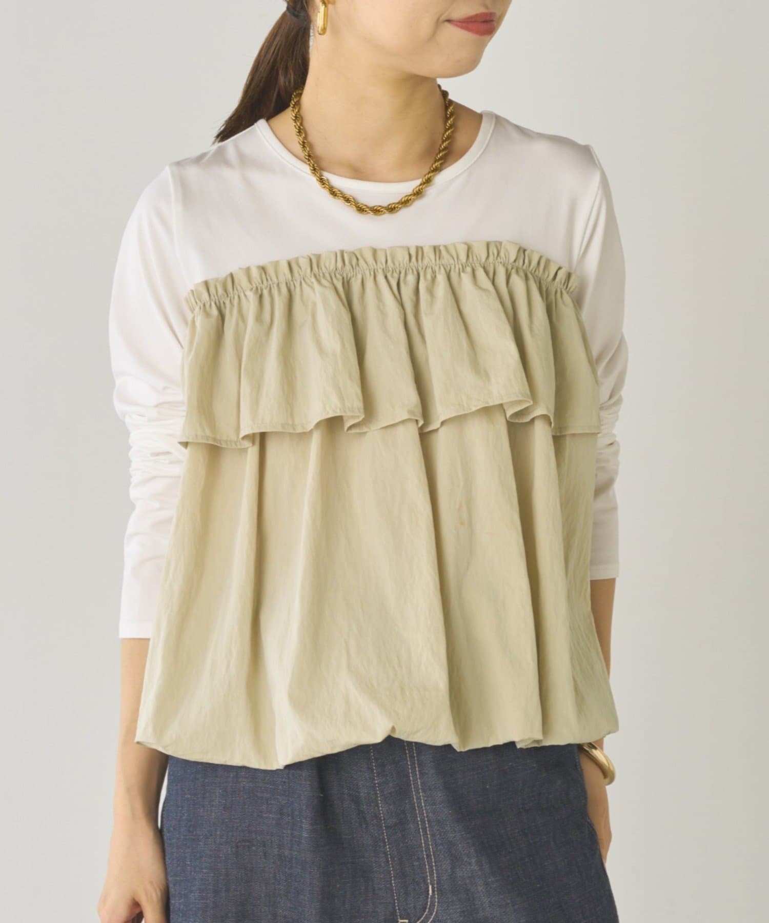 ベーシックな長袖トップスに、目を引くフリルデザイン。
