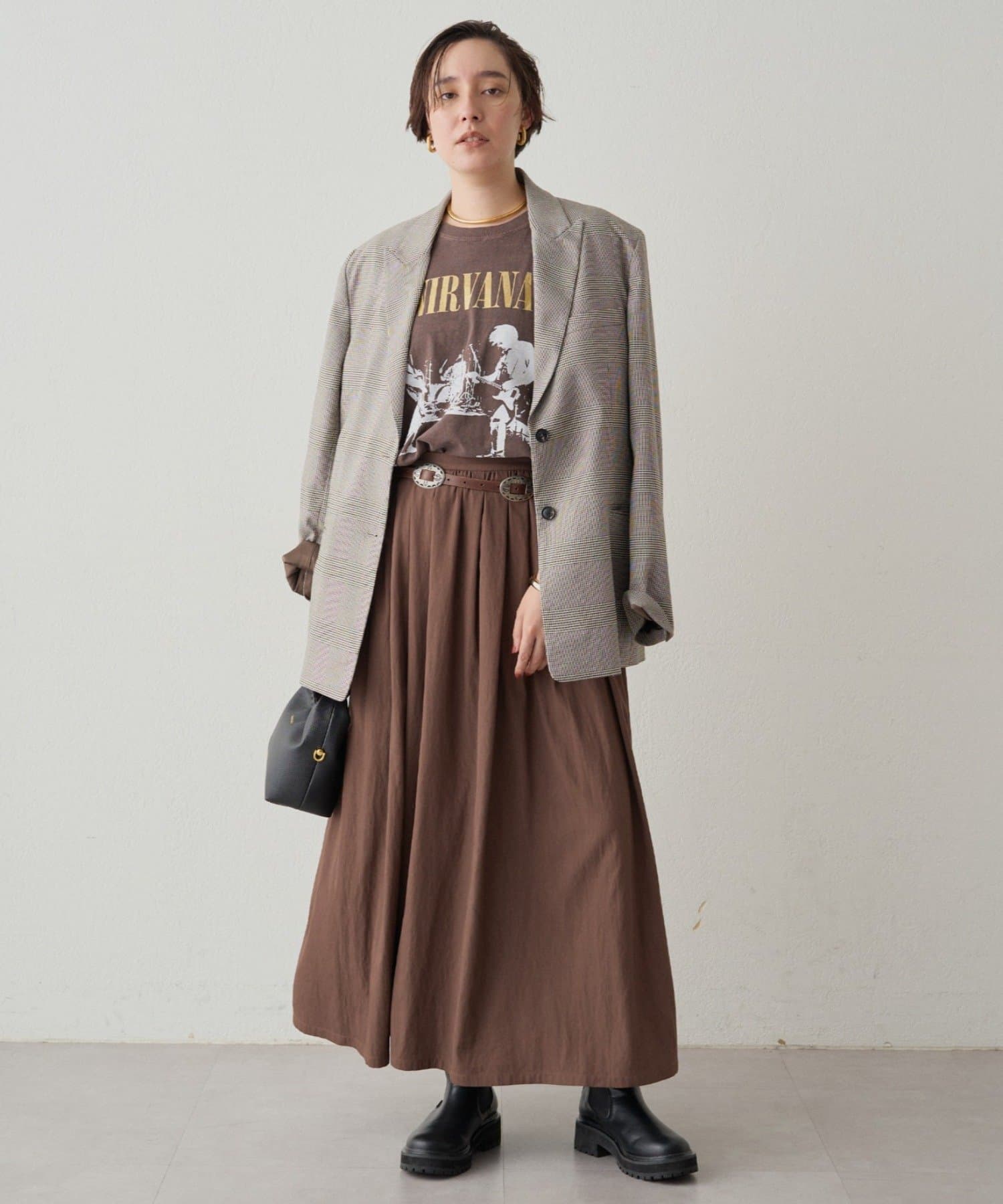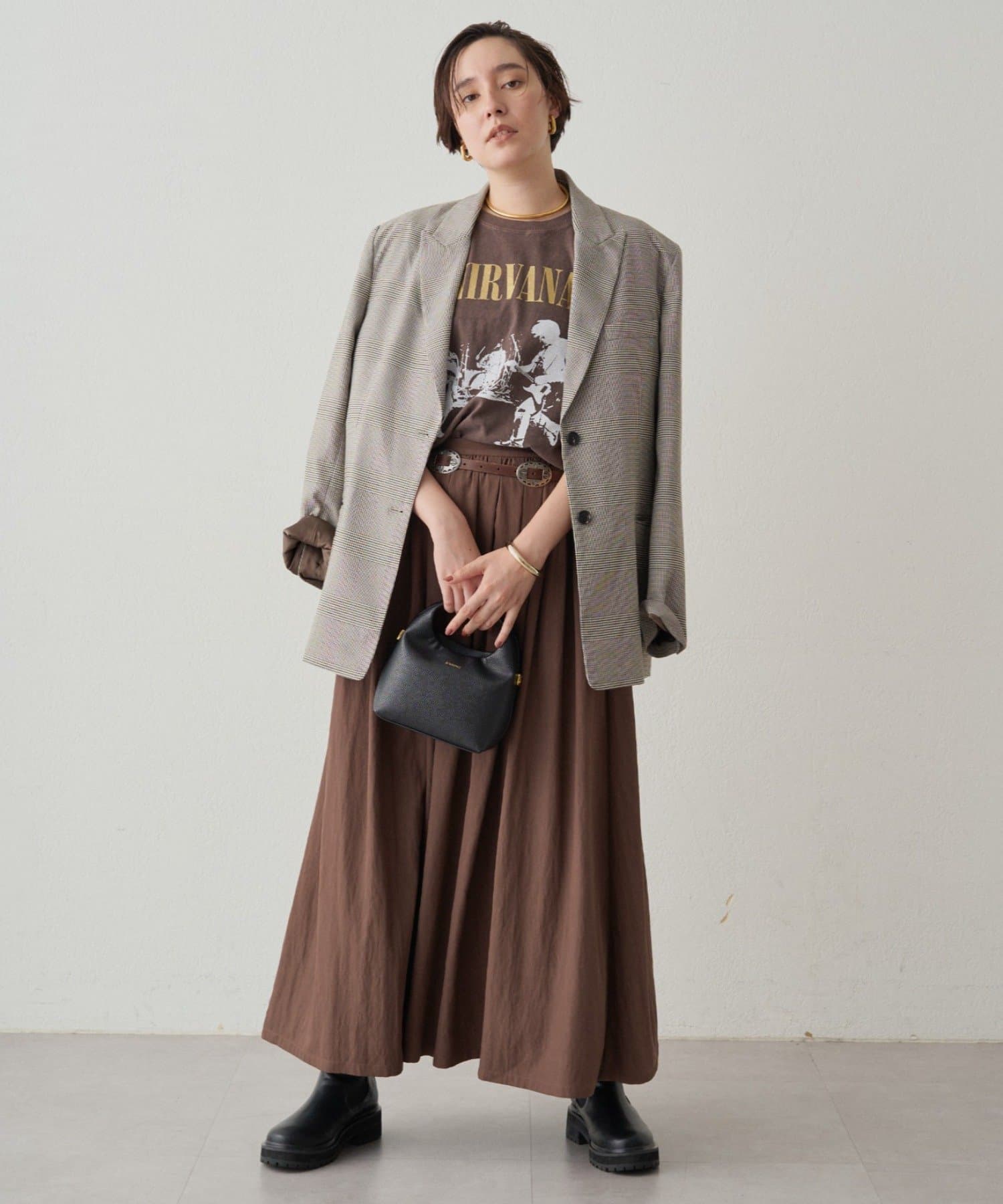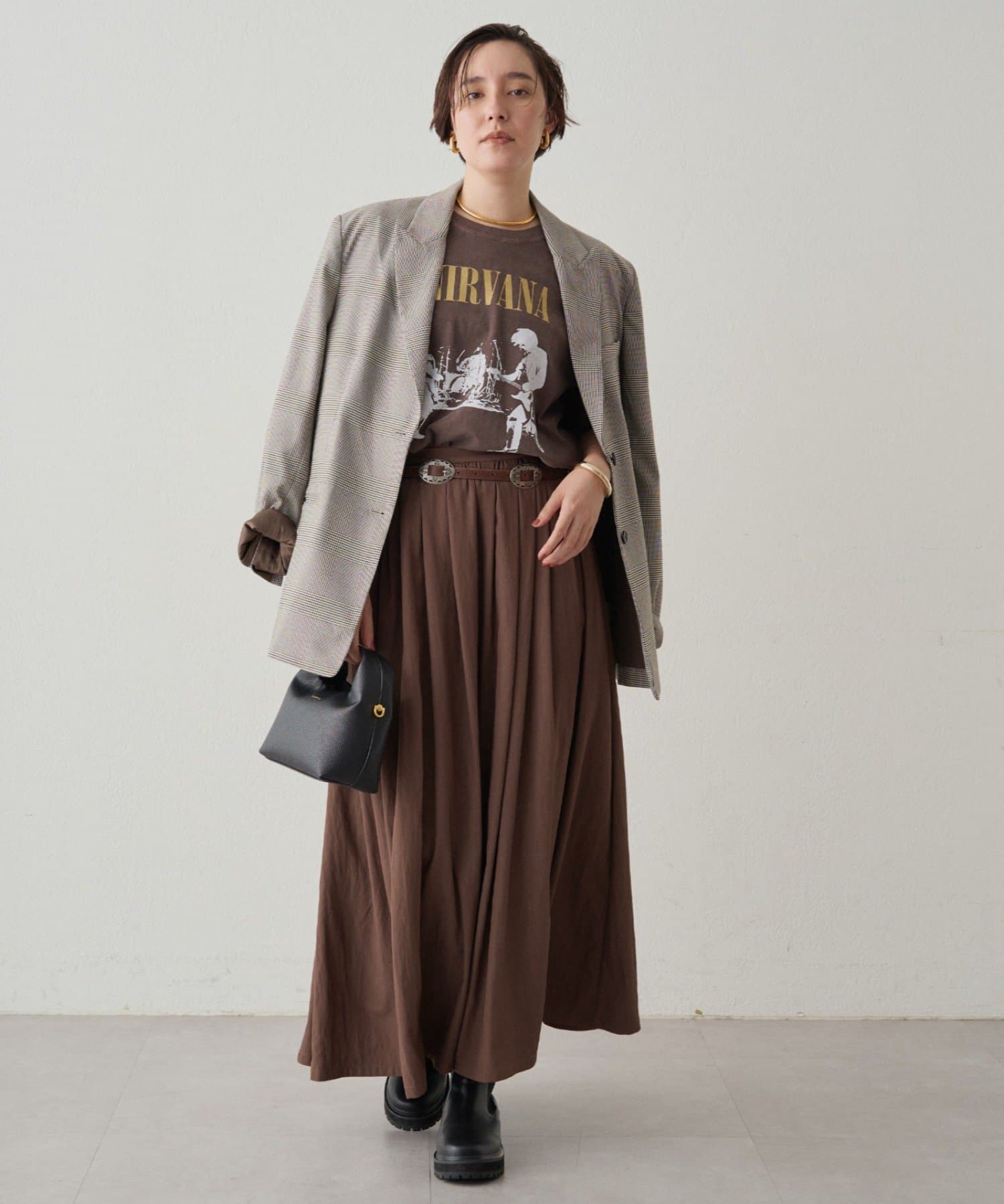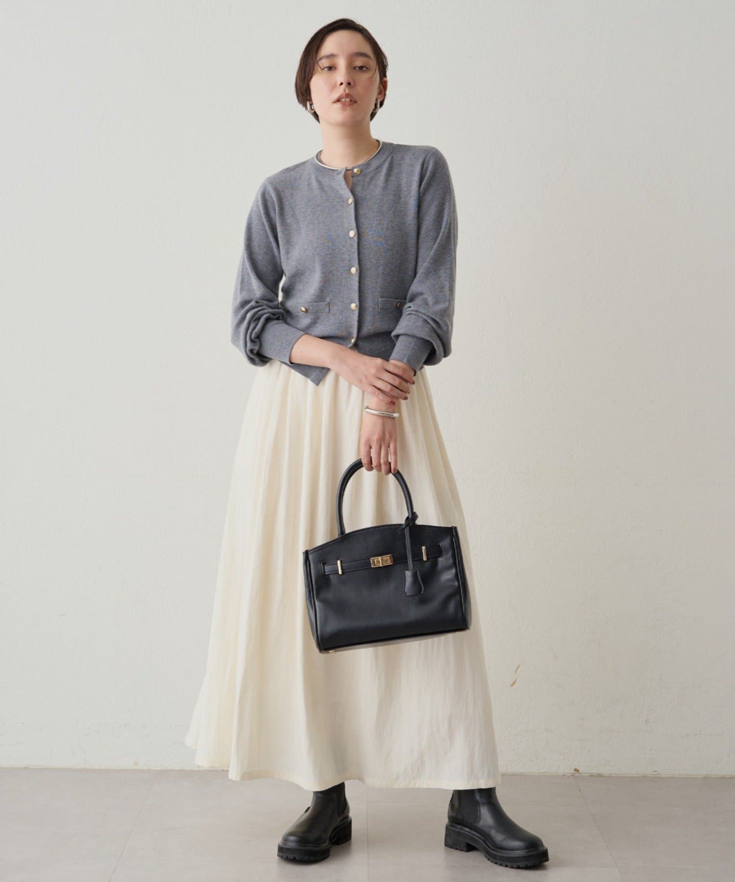 シンプルなデザインだからこそ、小物で個性を演出するのがおすすめ。