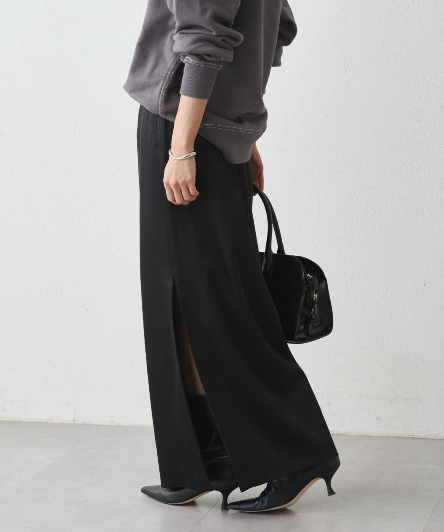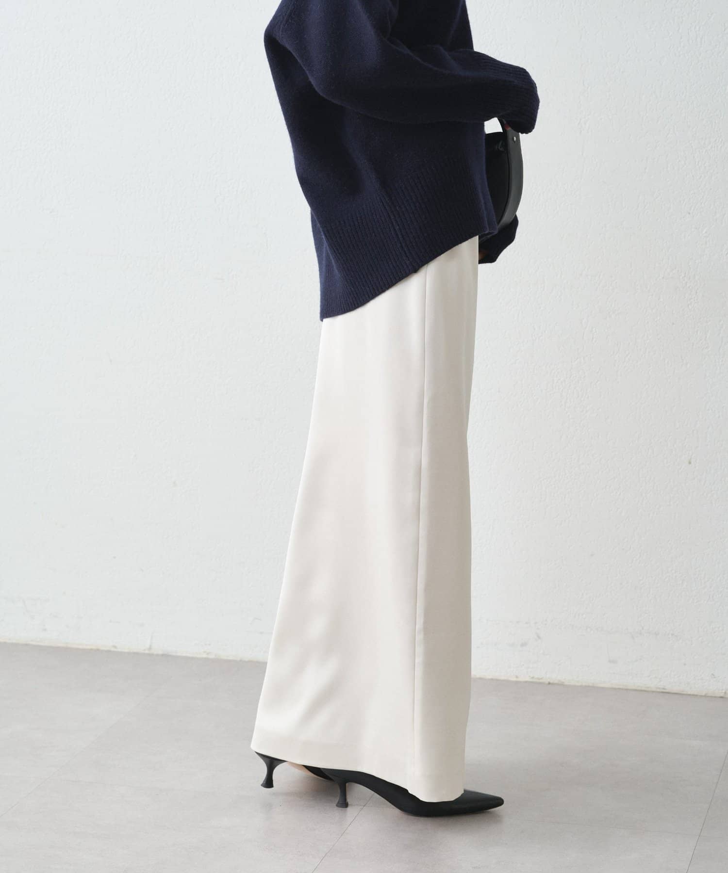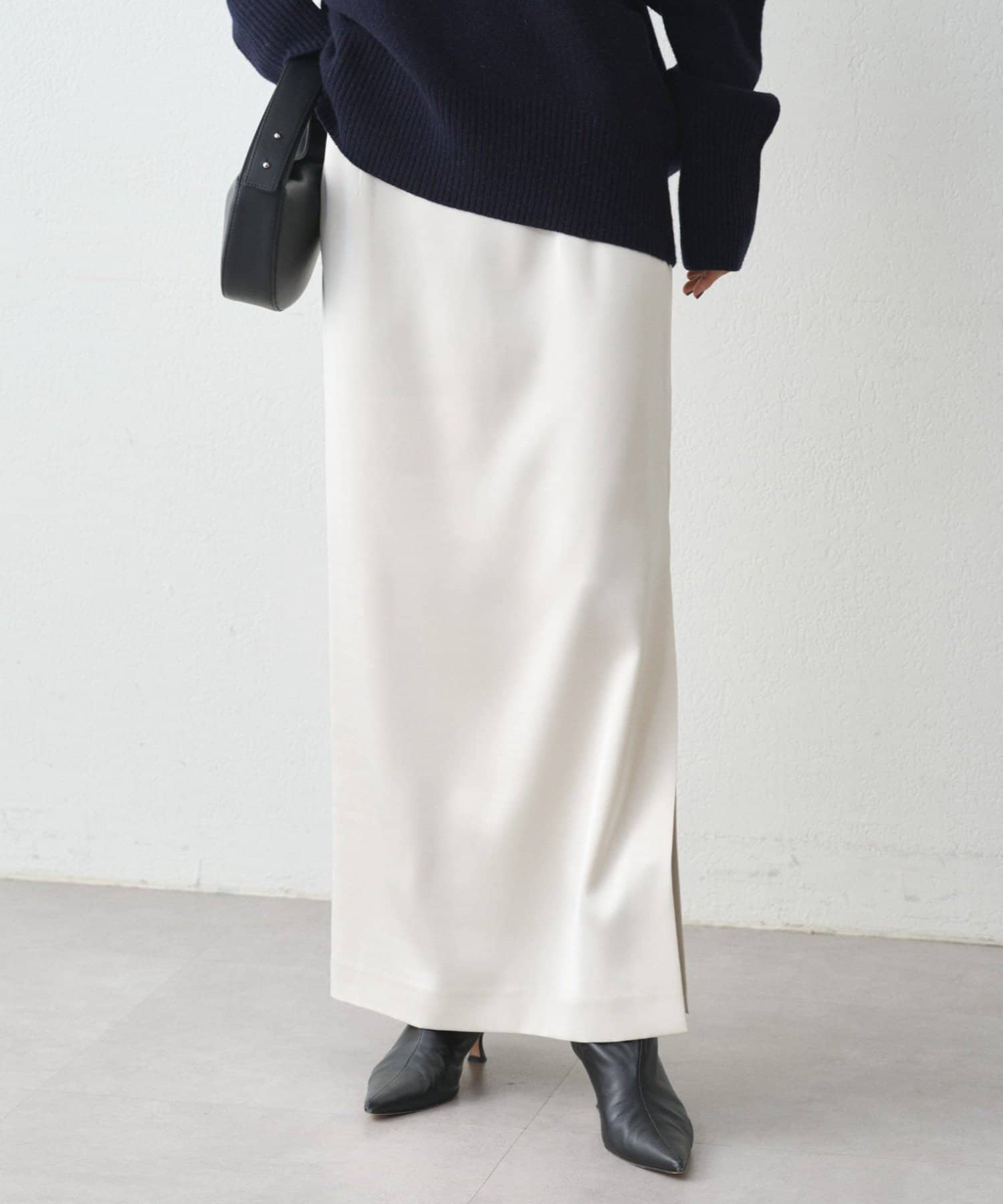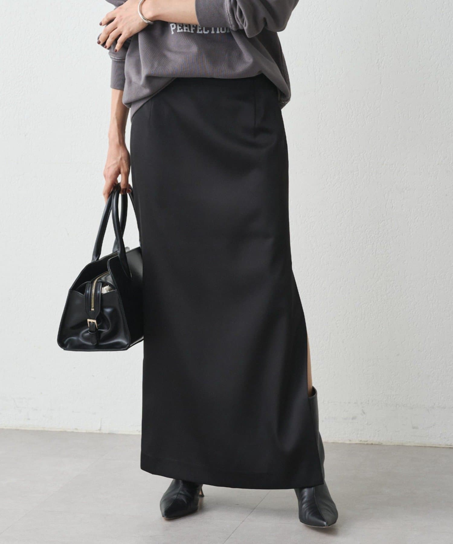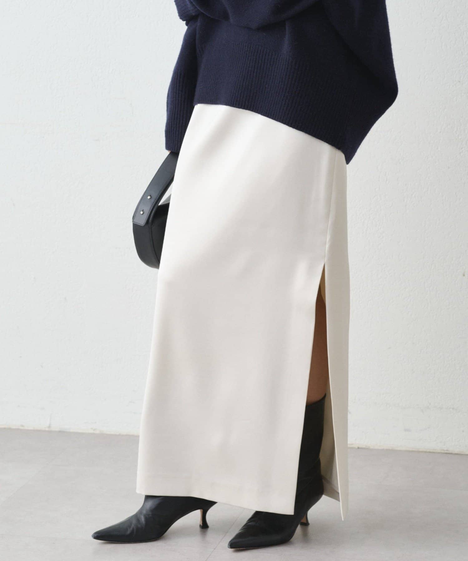 歩くたびに優雅な揺れ感を生み出す、スリットサテンタイトスカート