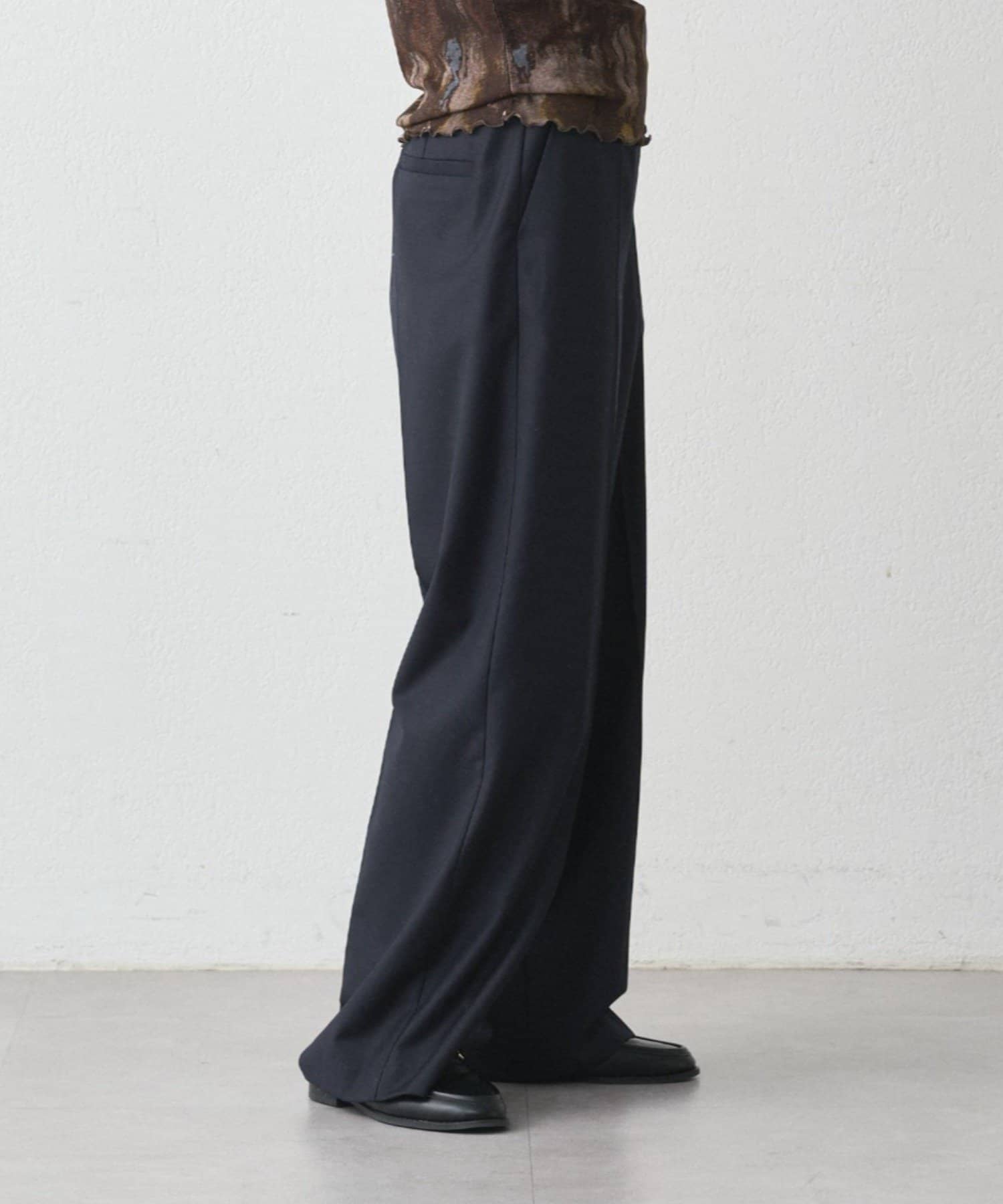 一見シンプルながらも、アシンメトリーなウエストデザインが目を引くワイドパンツ。