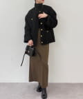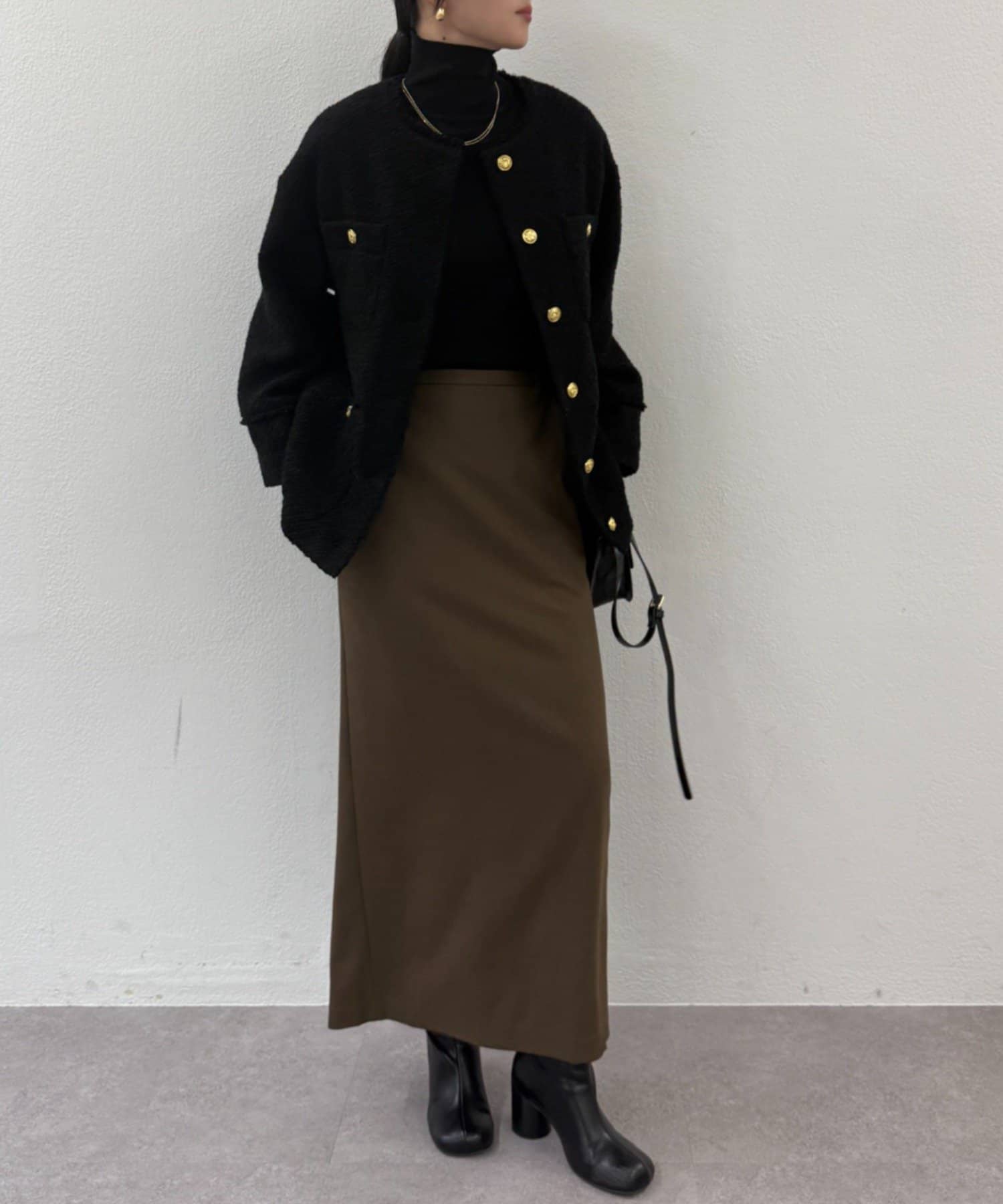 落ち着いたツイード素材とゴールドボタンの組み合わせが、洗練された大人の女性らしさを引き立てます。