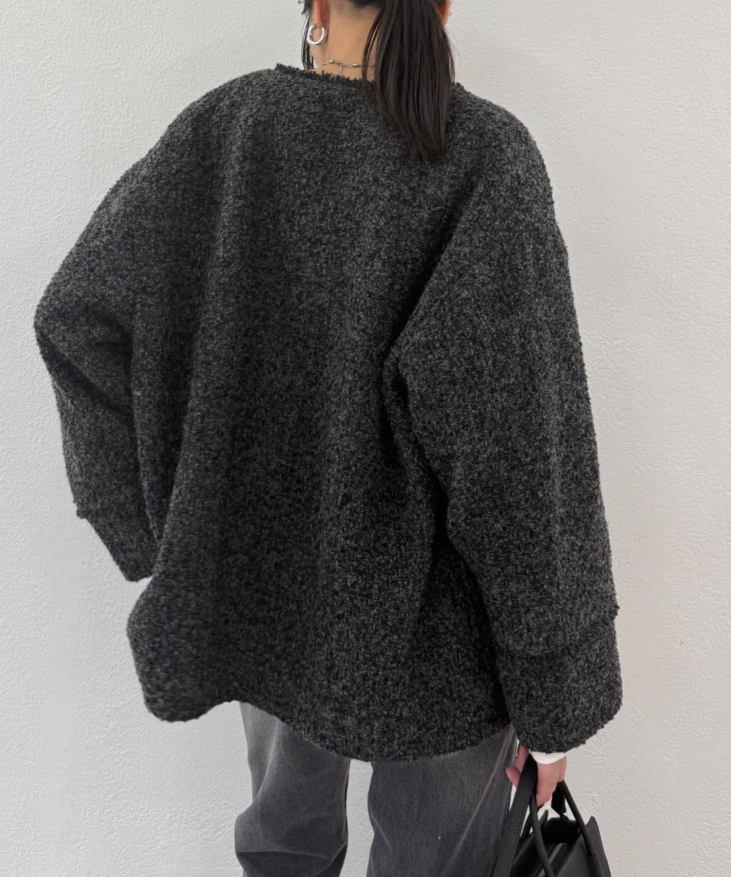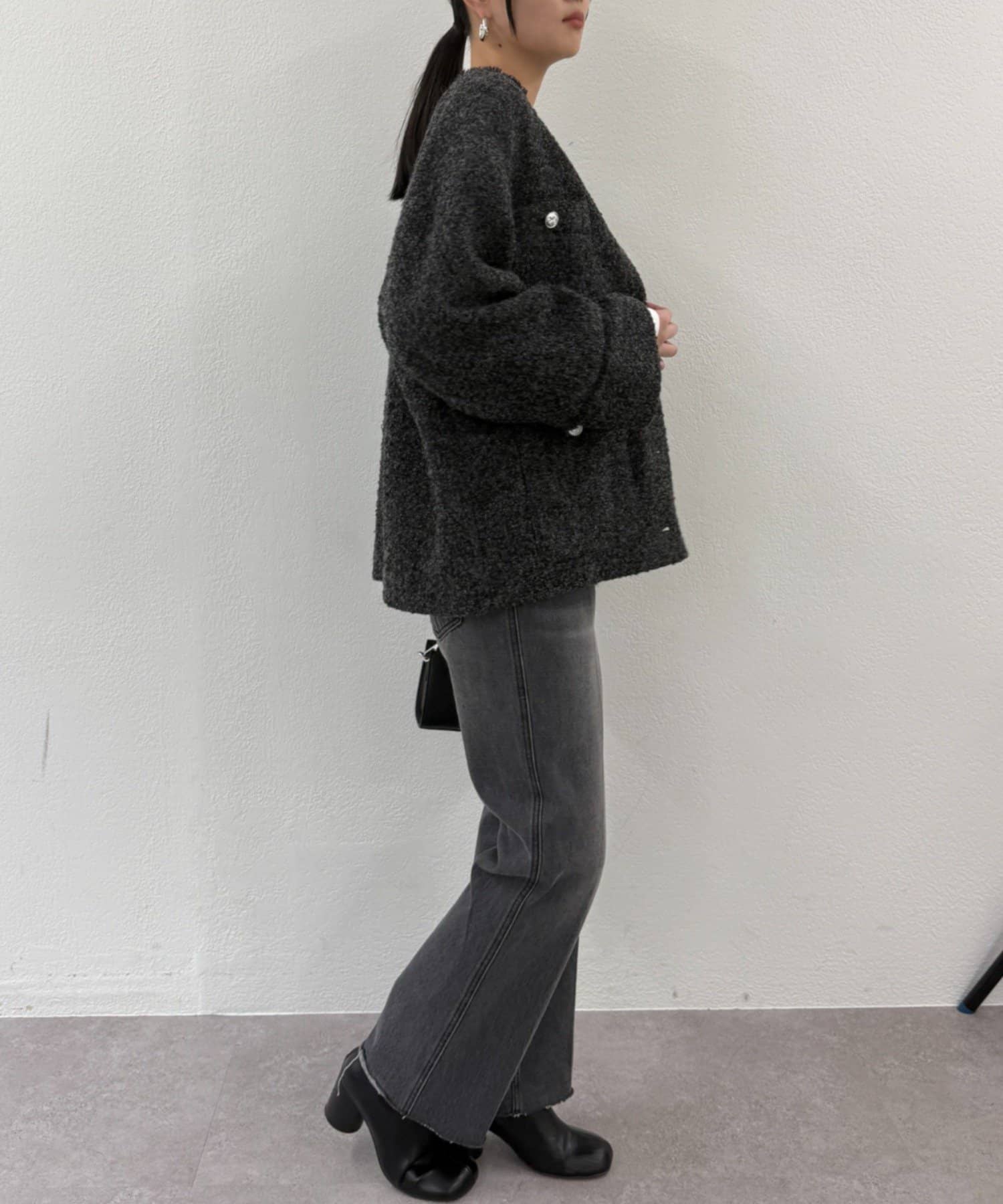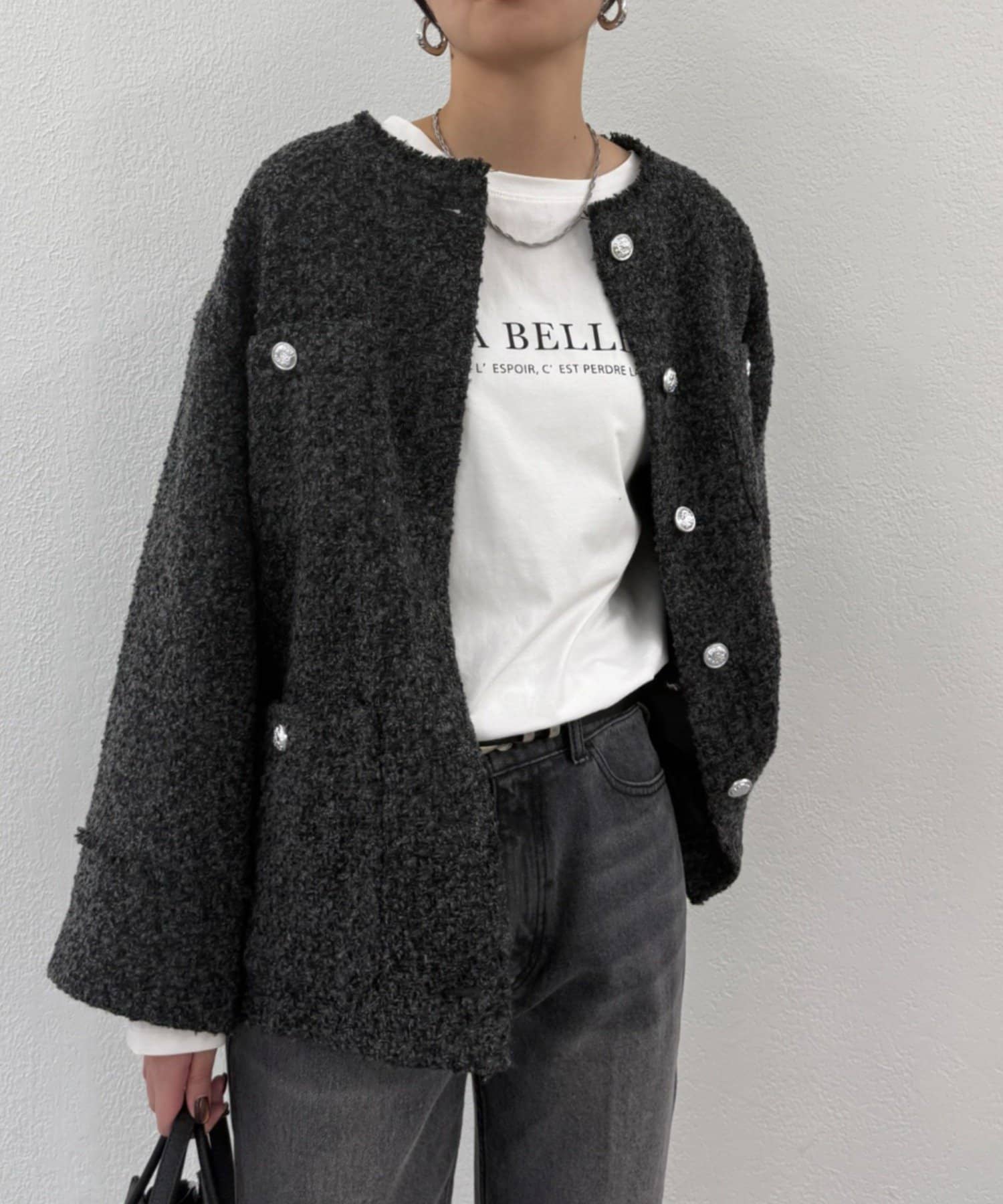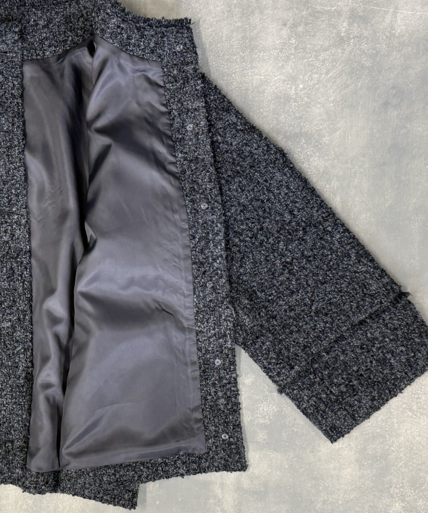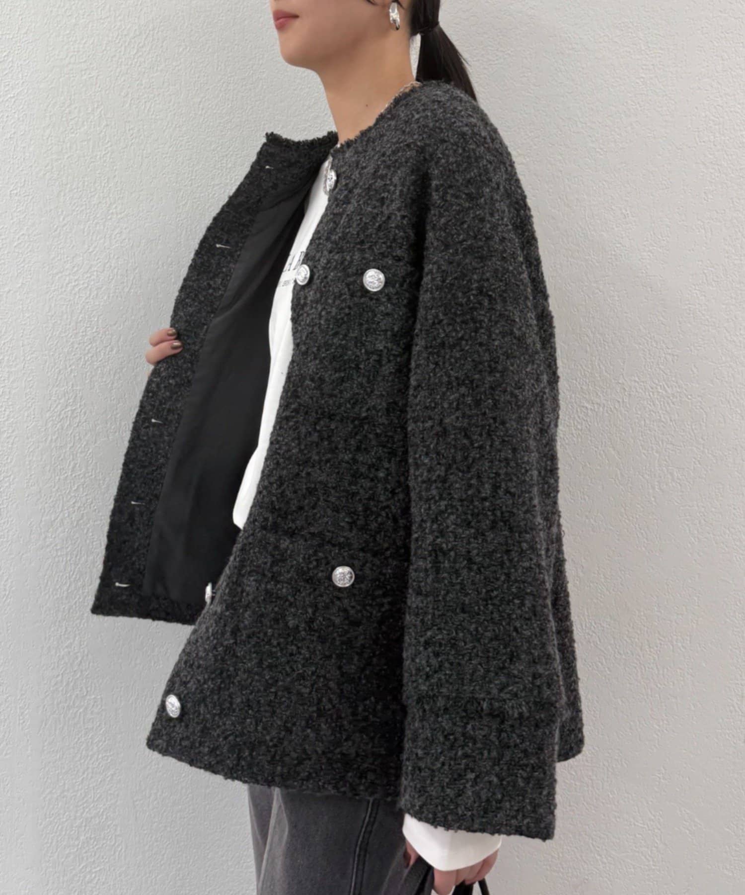 表面感のあるツイード生地に、上品な輝きを放つゴールドボタンをあしらい、存在感と高級感を演出しました。