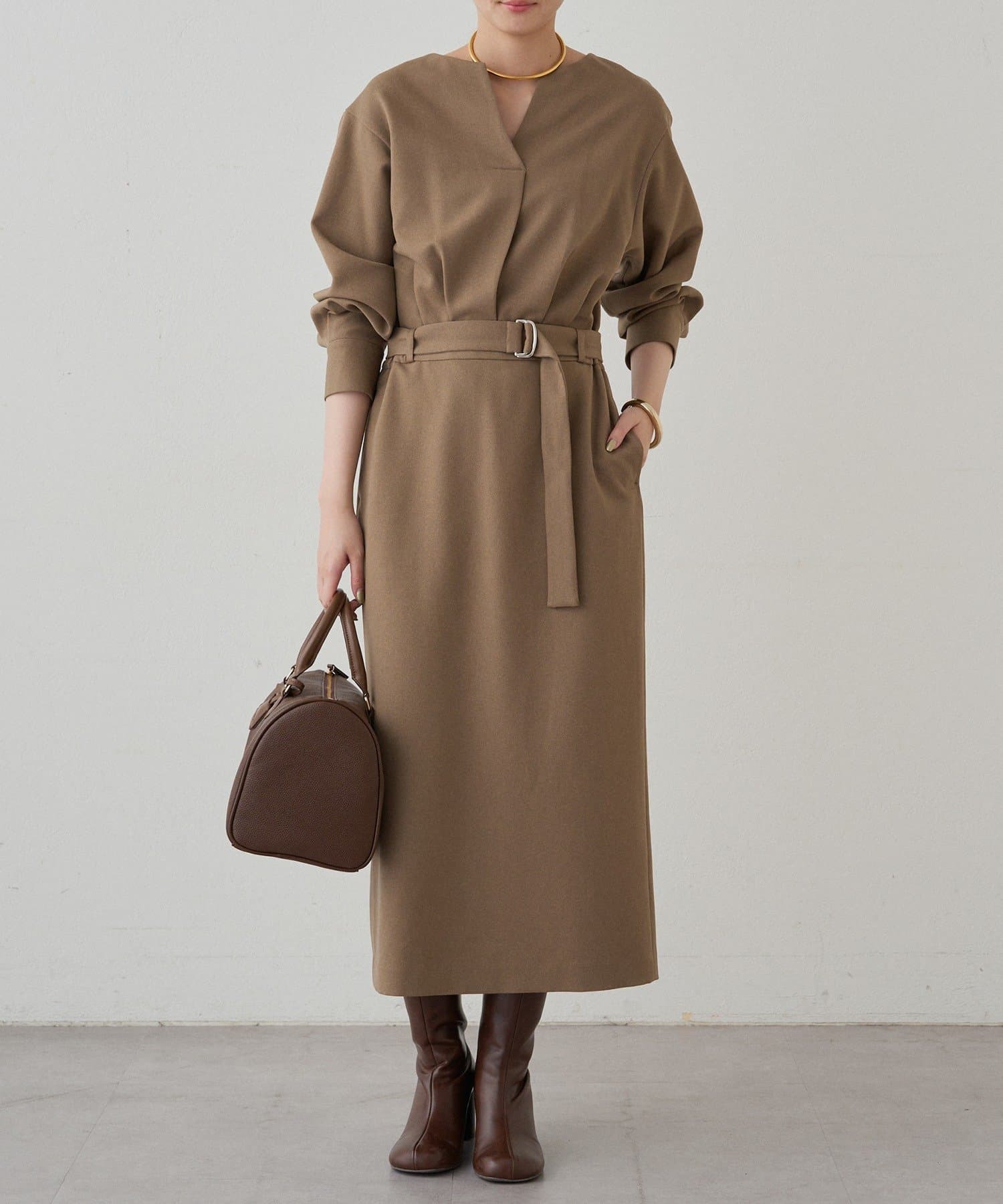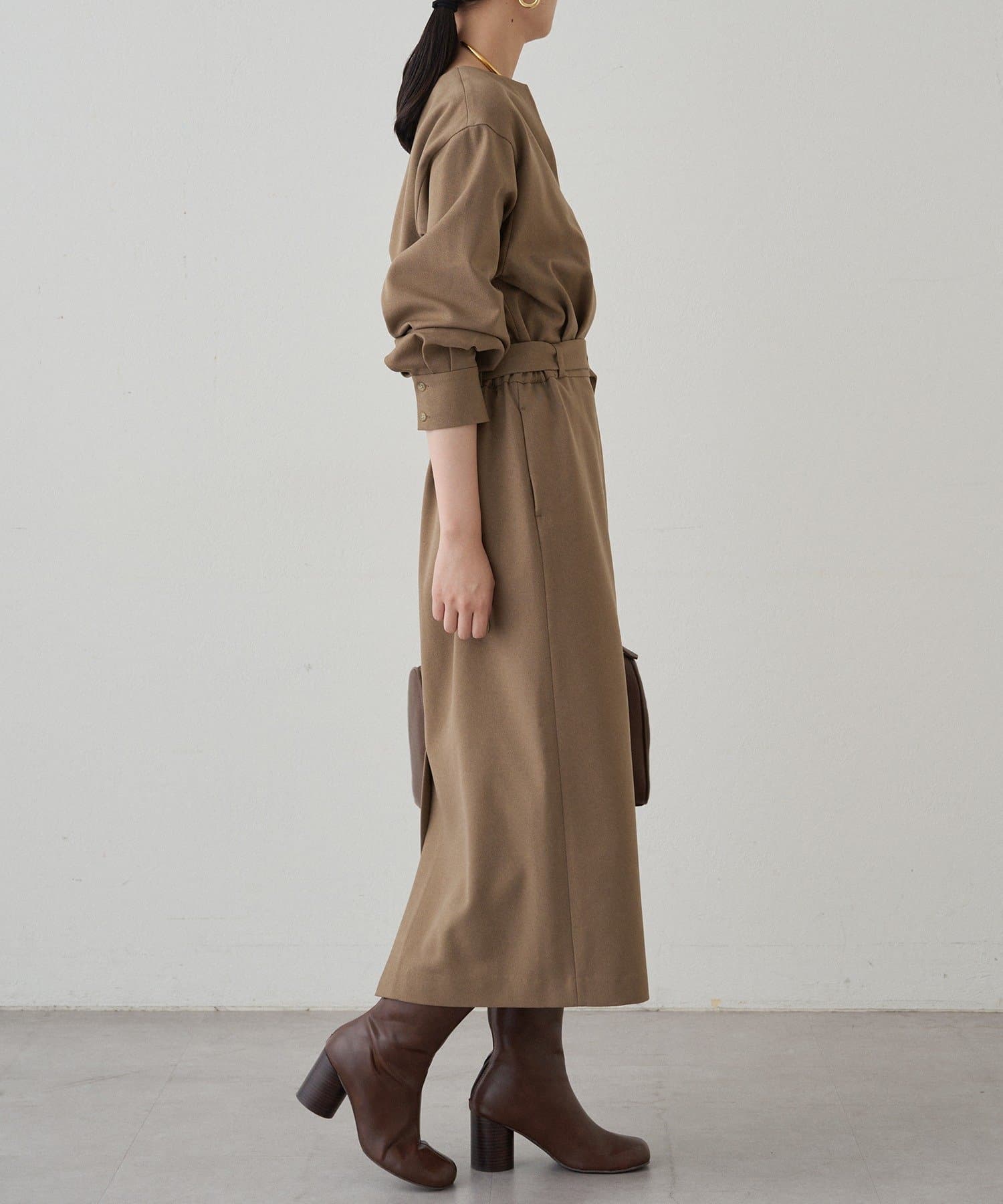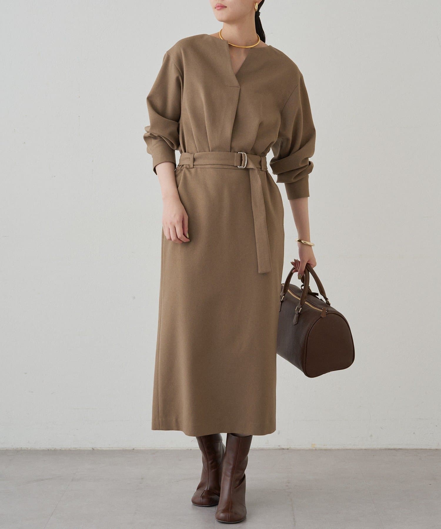 一枚で着るだけでスタイリングが完成するワンピースは、足元はブーツで秋らしく、パンプスで上品に。