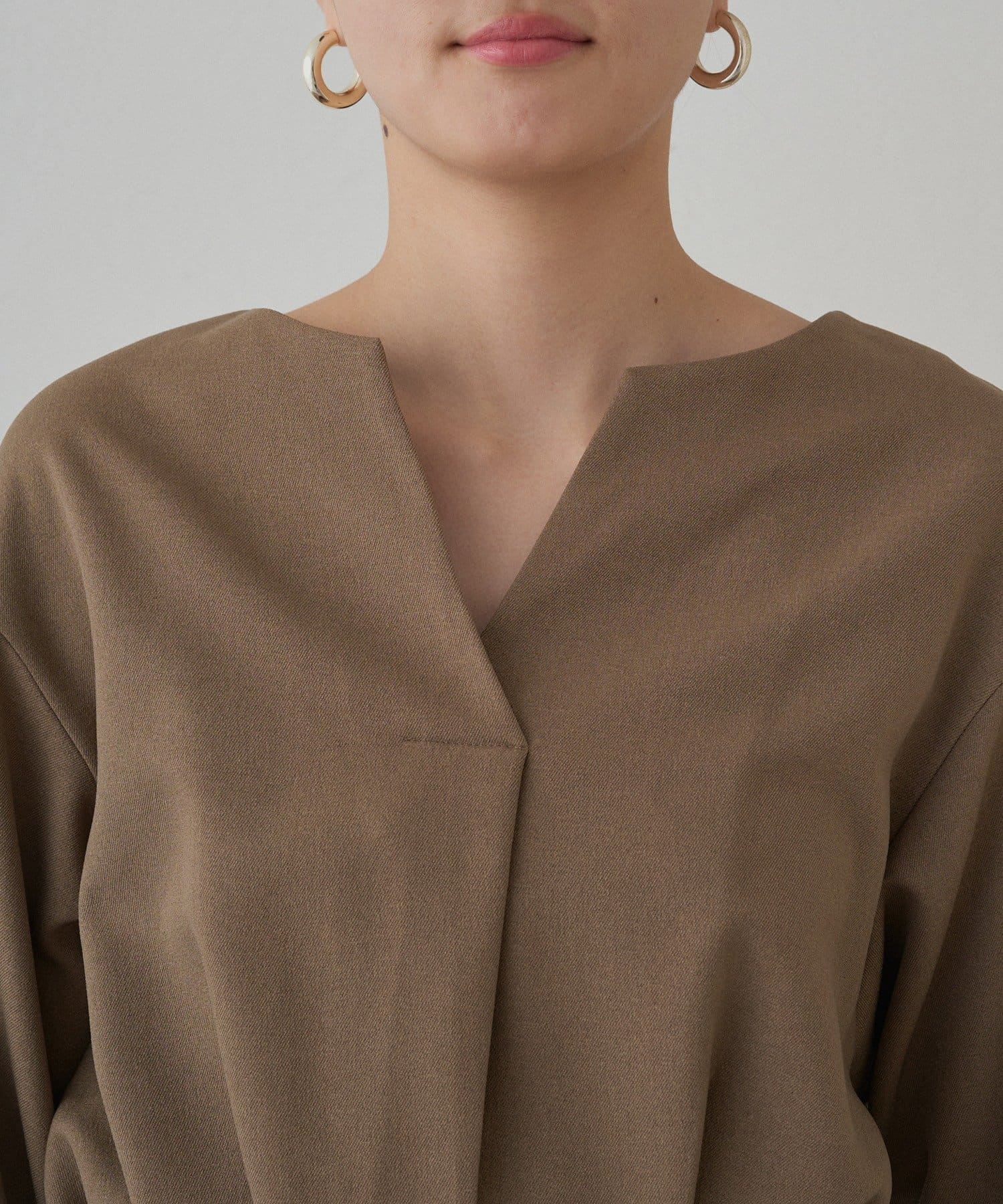 深めのVネックがデコルテを美しく見せ、女性らしさを引き立てます。