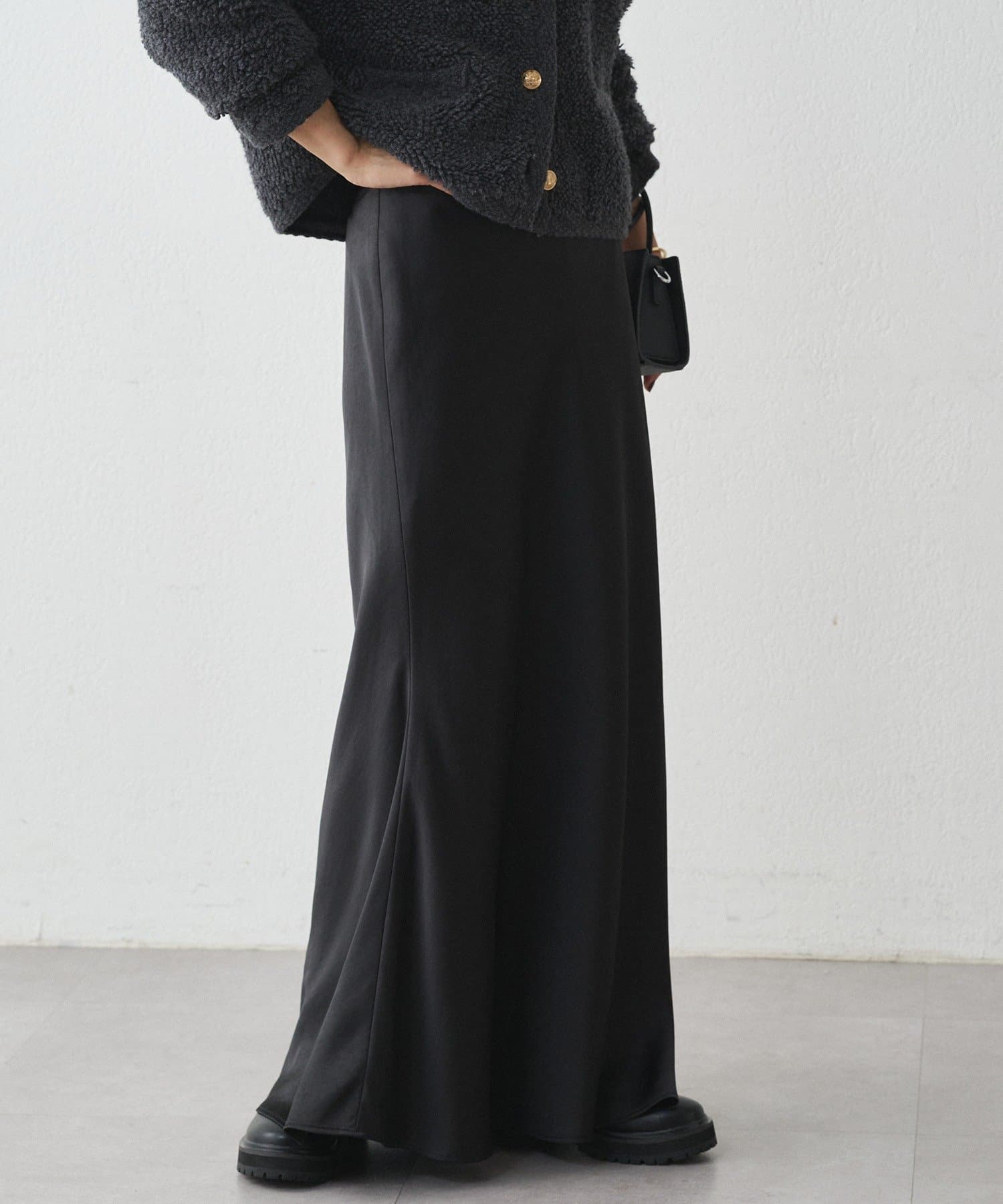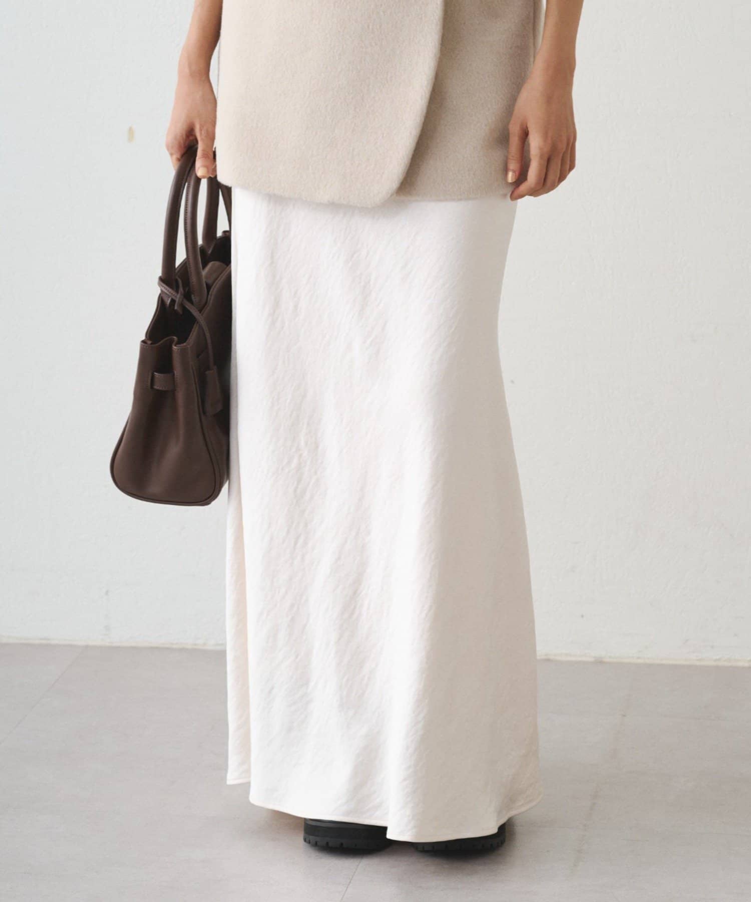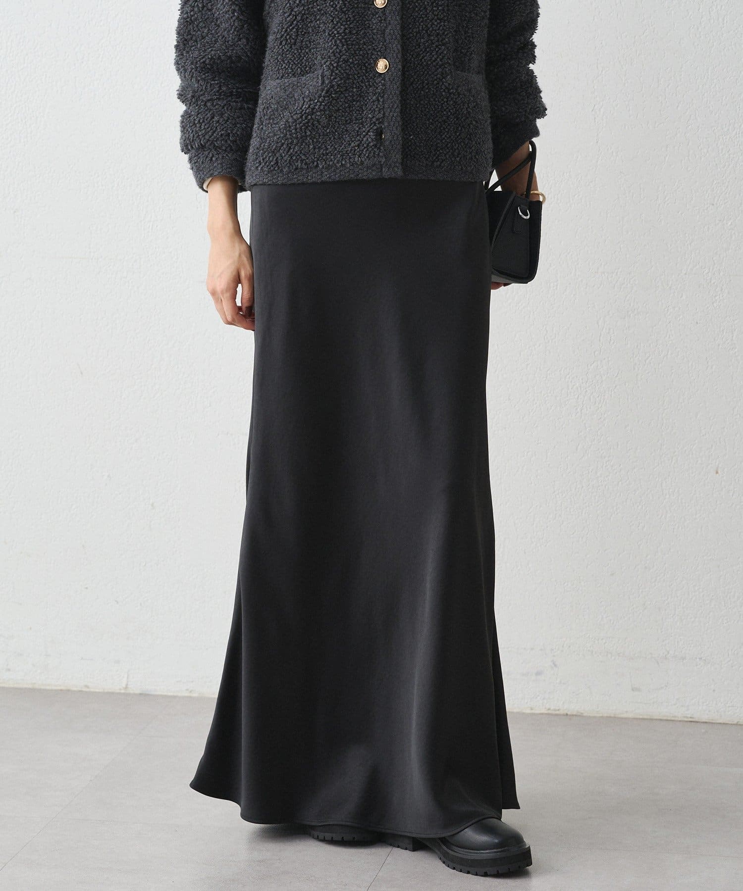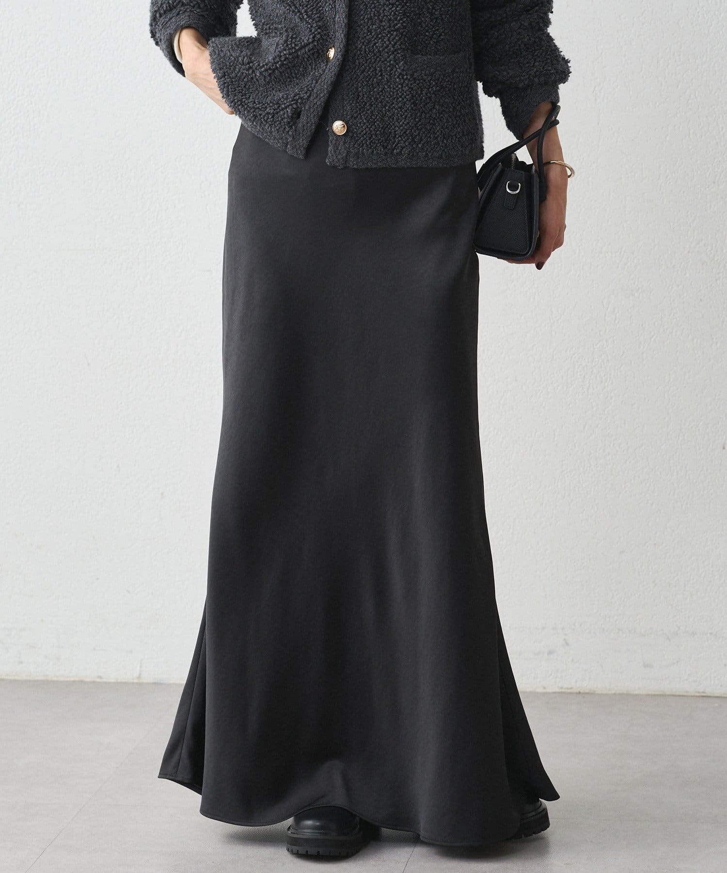 まるで光をまとうように、艶めくサテン生地を使用したロングスカート。