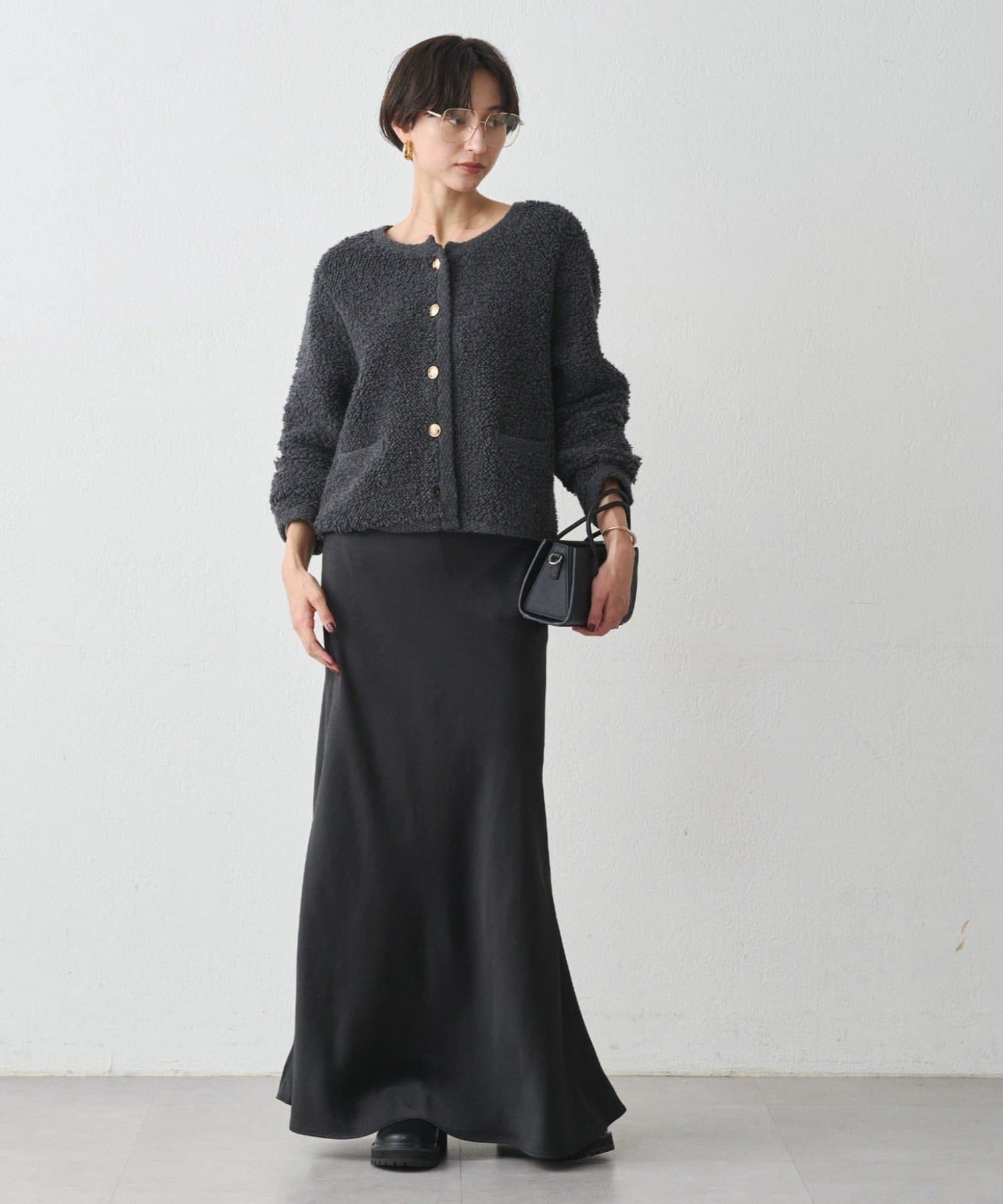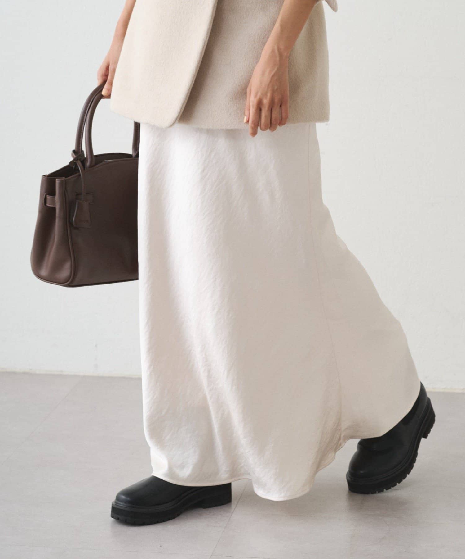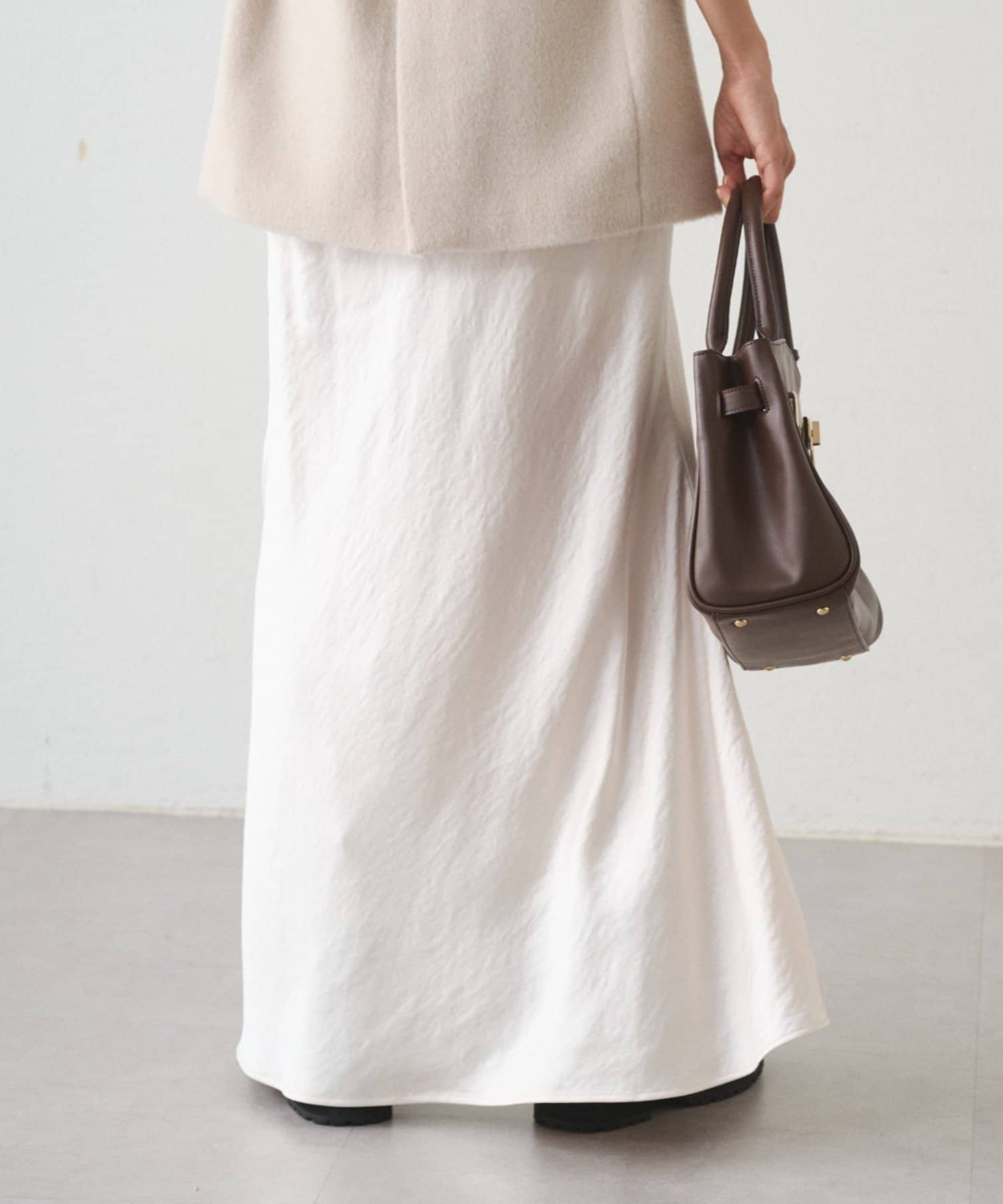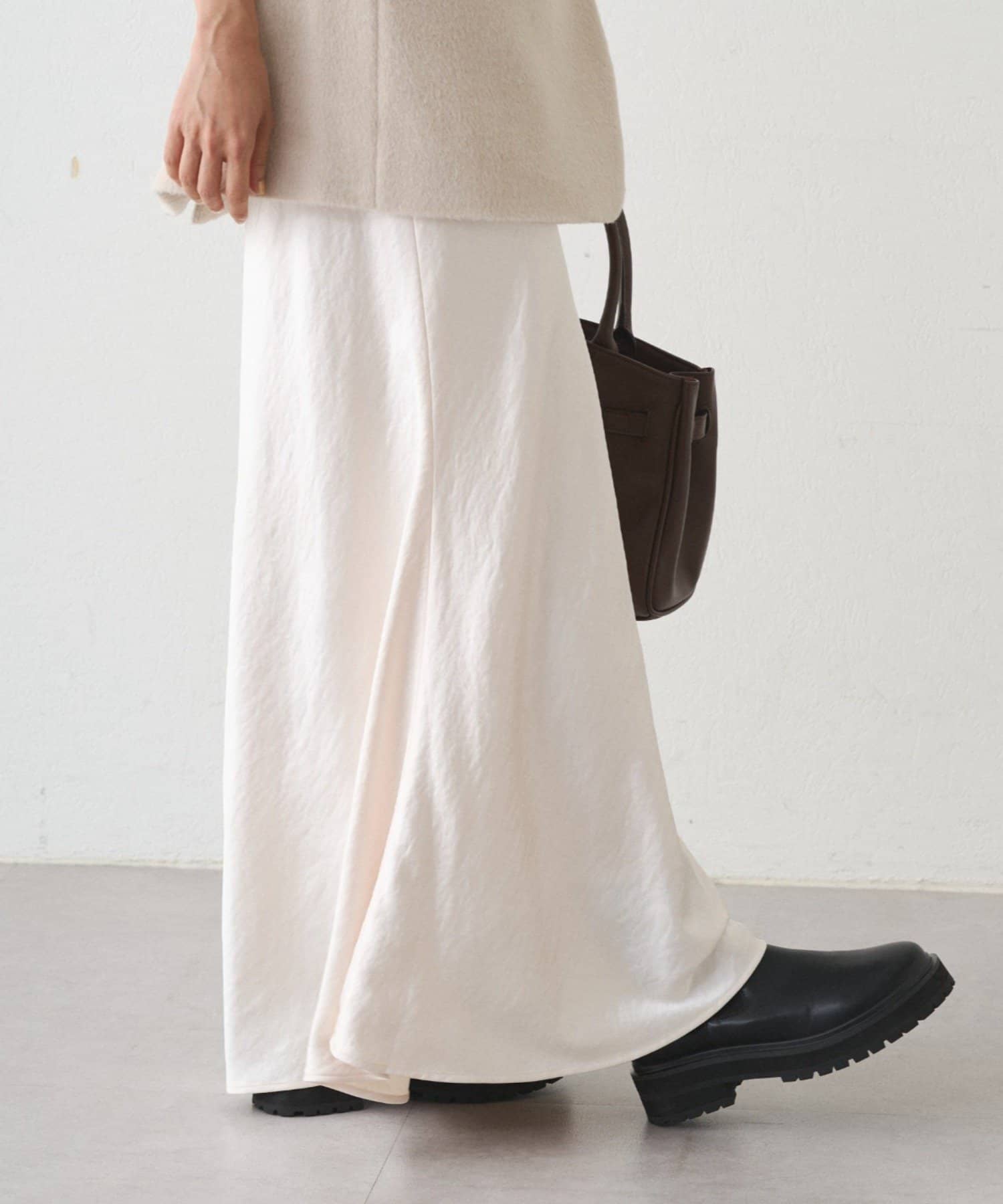 まるで光をまとうように、艶めくサテン生地を使用したロングスカート。
