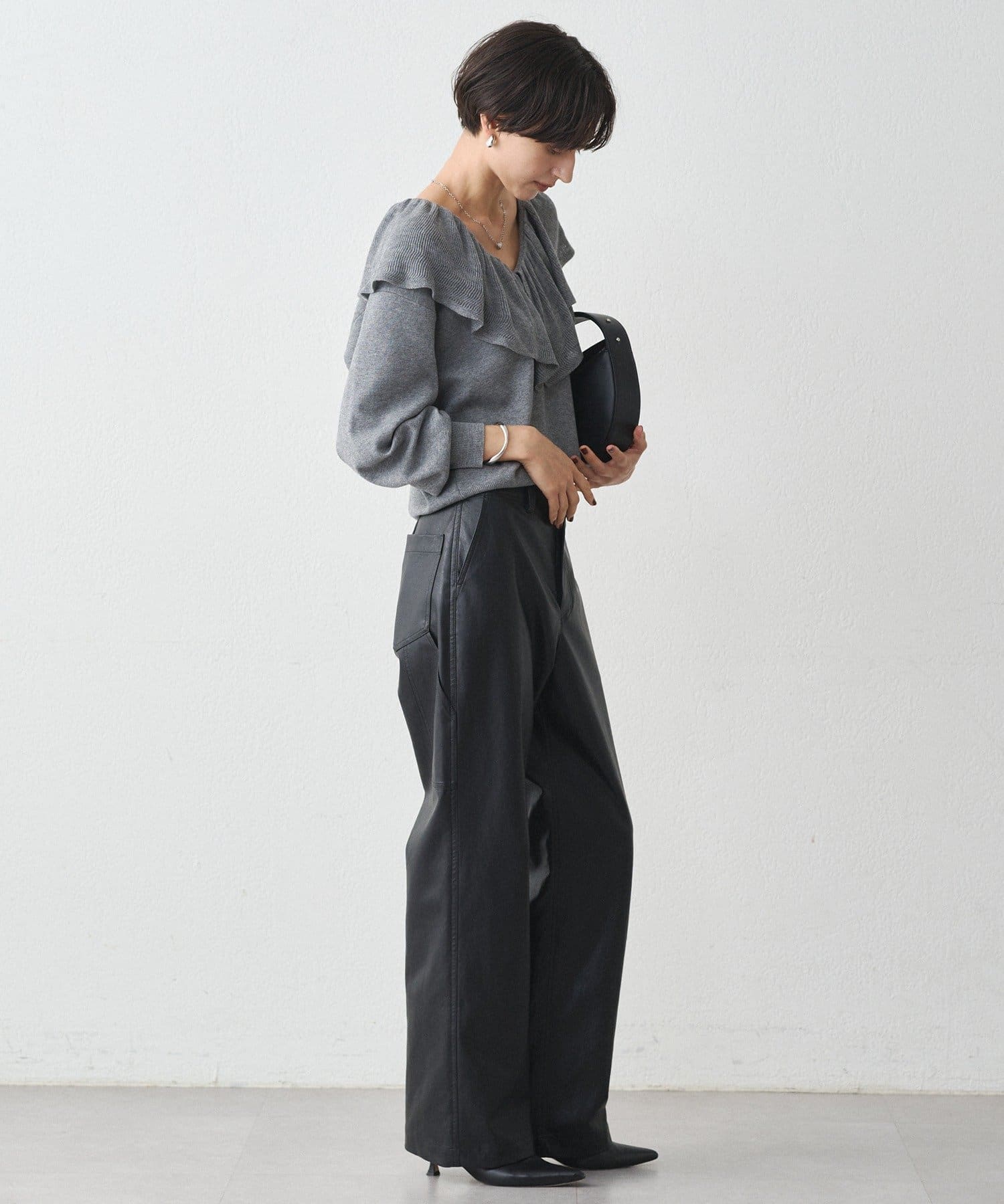 シンプルなニットやブラウスと合わせれば、素材のコントラストが際立ち、洗練された印象に。