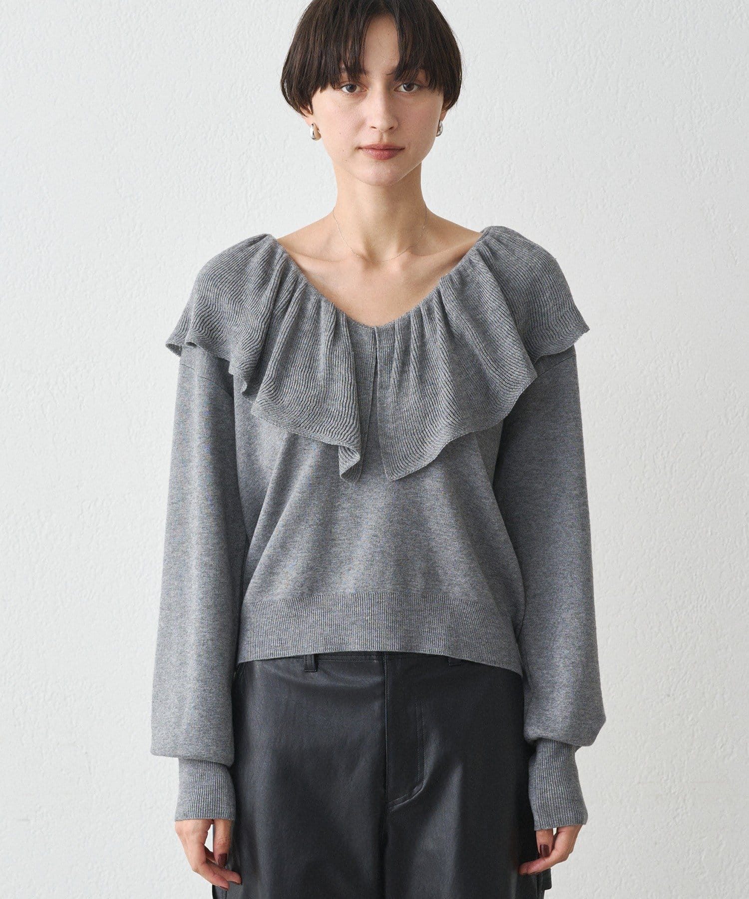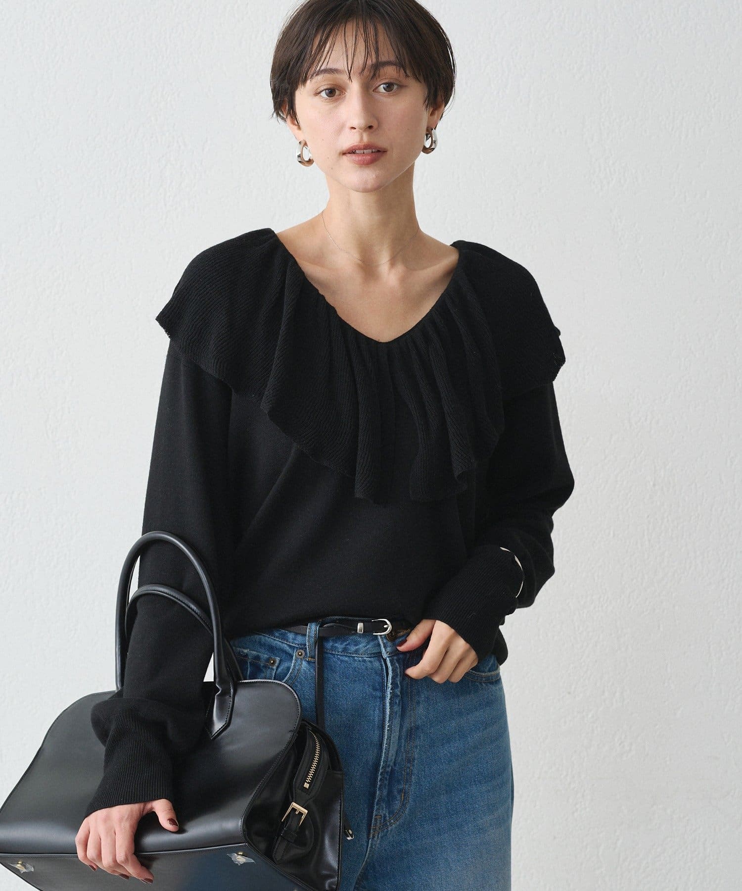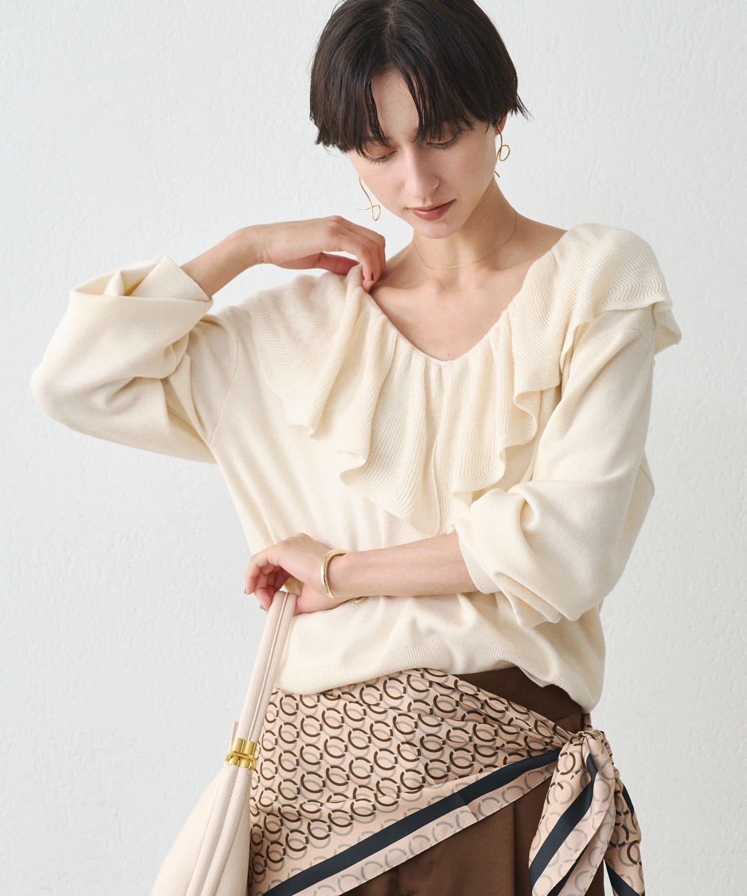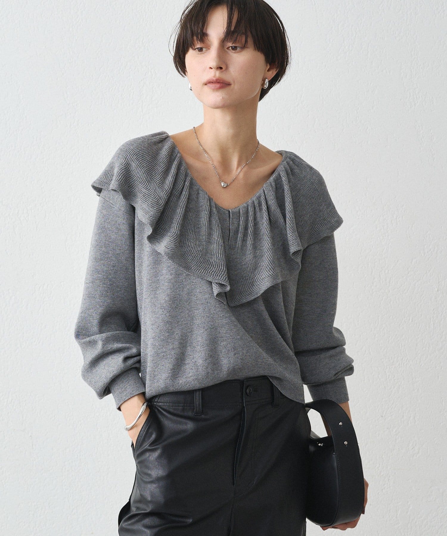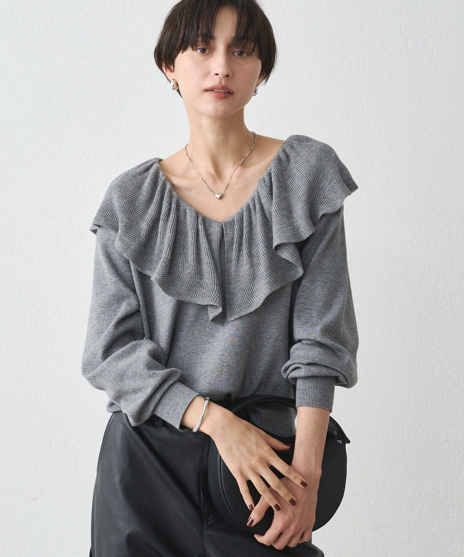 華奢見えするVネックデザインと、ボリュームのあるフリルで華やかさも演出。