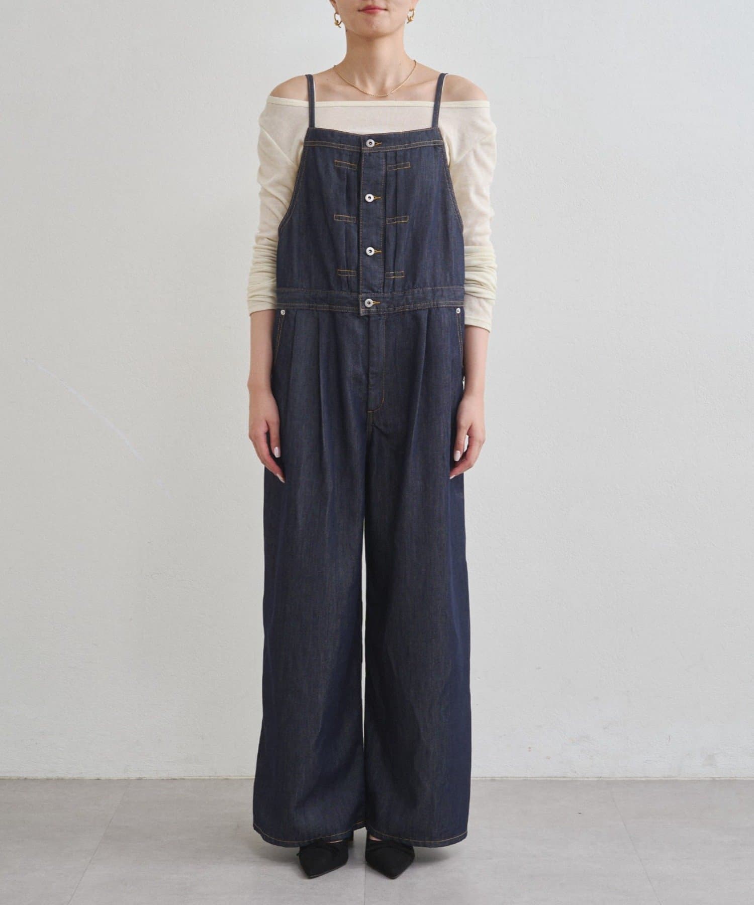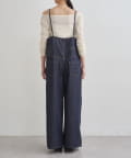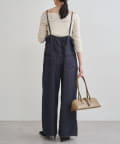 2タックでパンツは太めのシルエットですが、細く華奢な肩ひもで女っぽさをプラス。