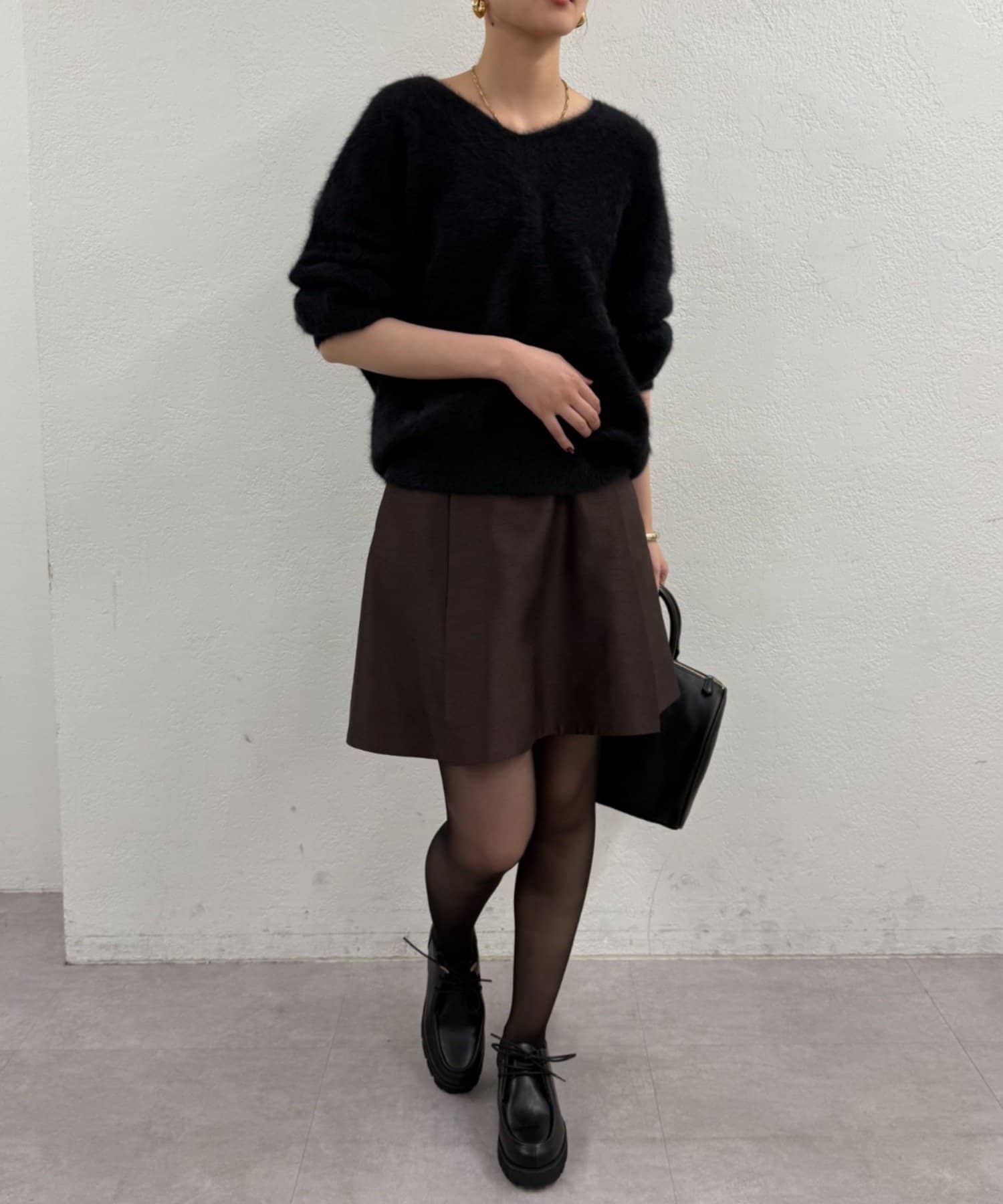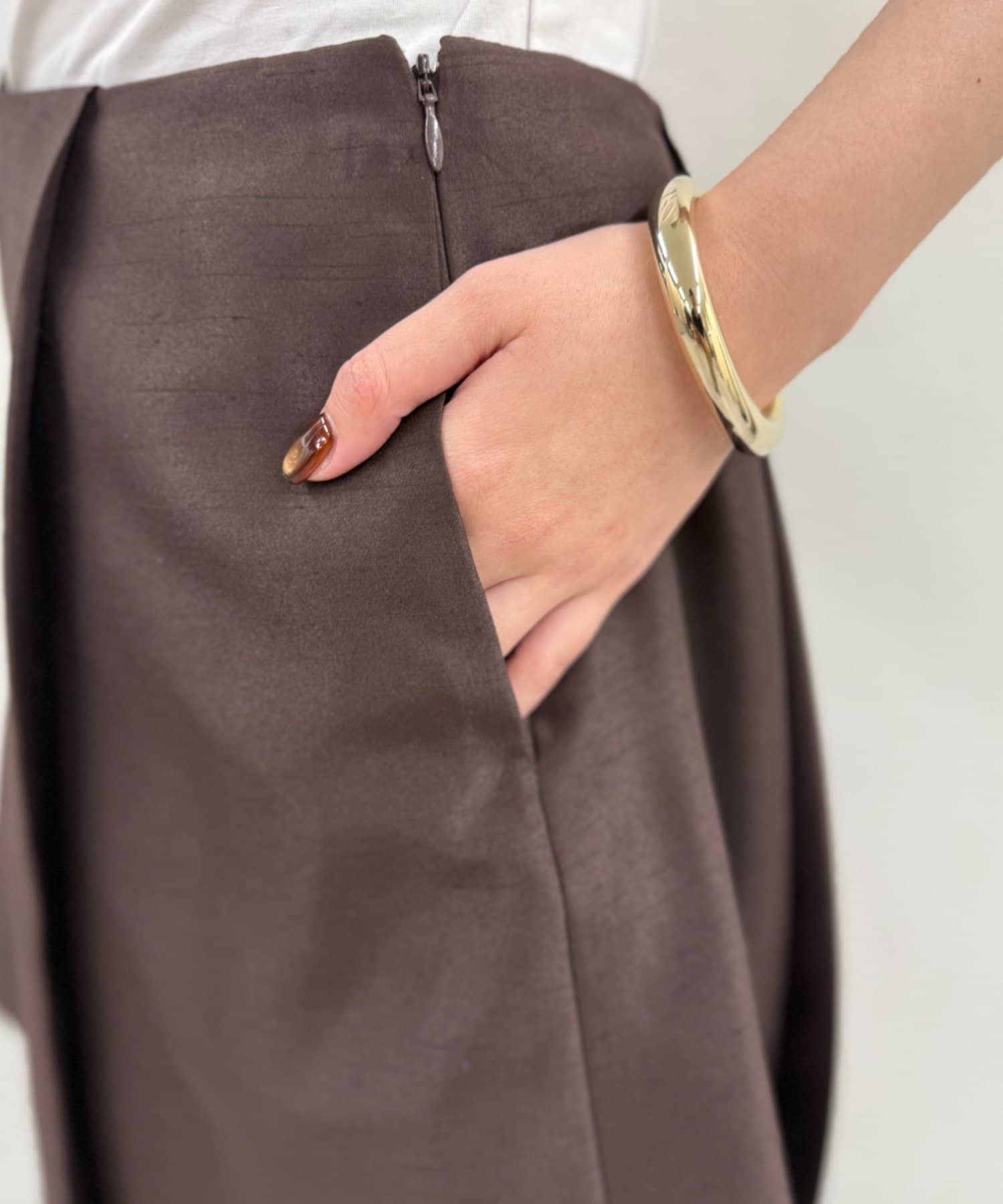 上品な光沢感があり、シンプルながらも洗練された印象に。ブラウスでフェミニンに、ニットで大人カジュアルにと、幅広いコーデを楽しめます。