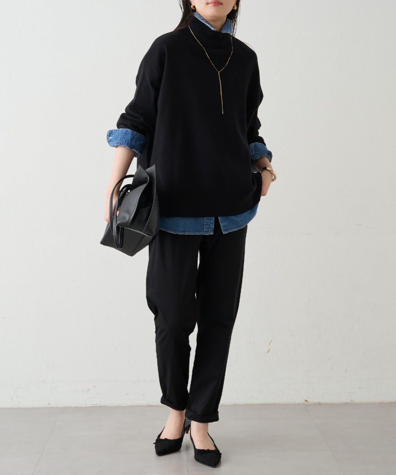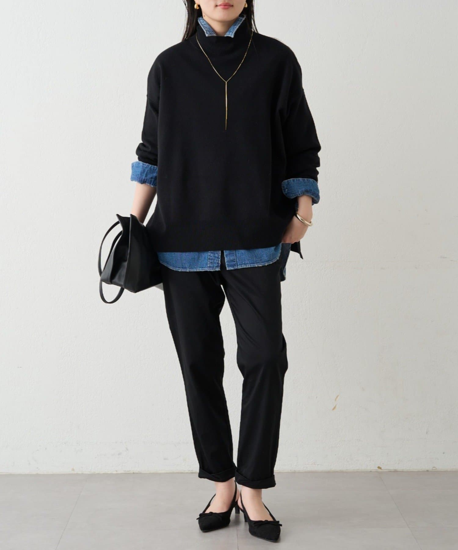シンプルで、どんなボトムスとも合わせやすいハイネックニット。