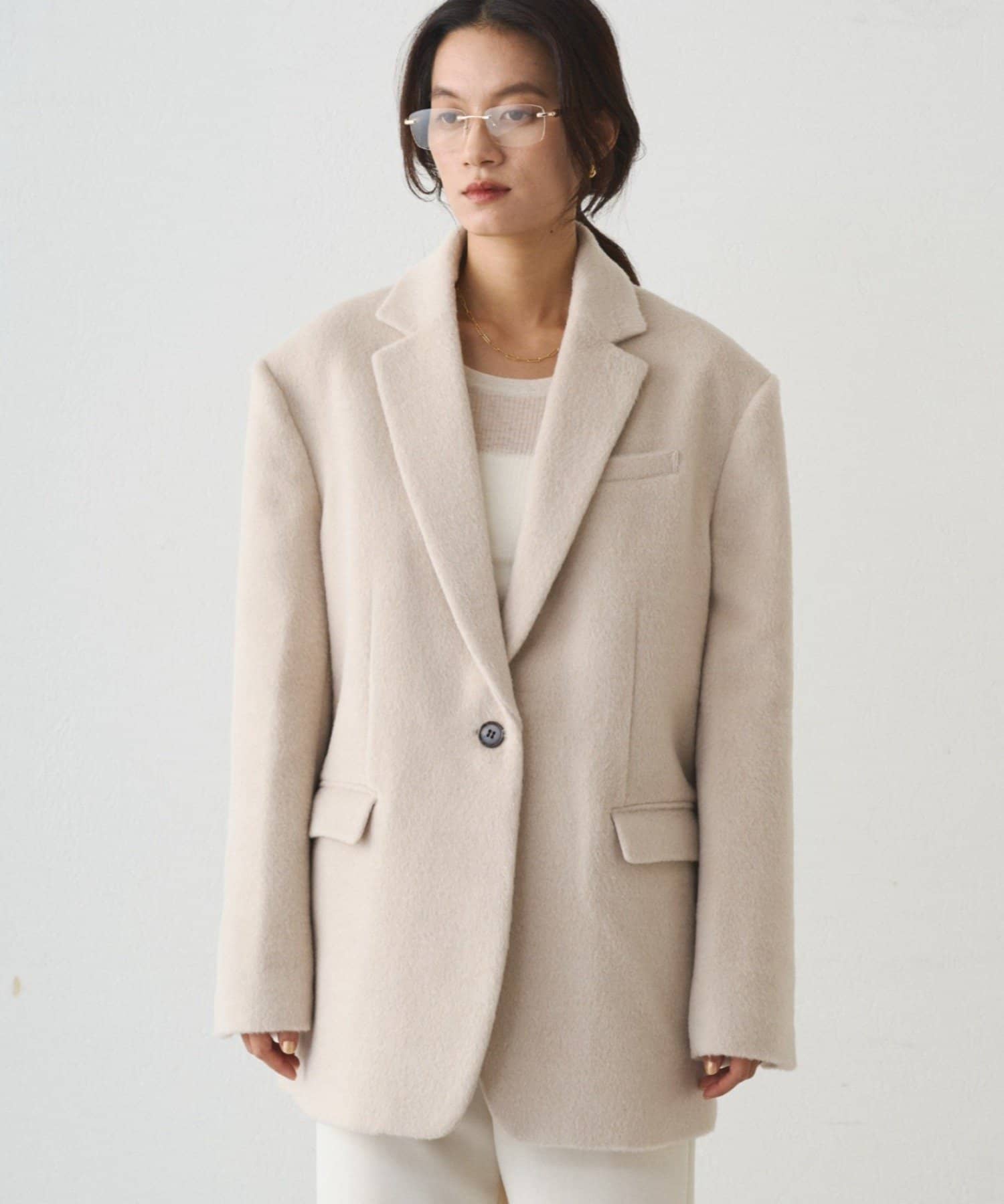 少しBIGサイズなシンプルなテーラードジャケット型で、フロントはシングルの1つボタン仕様で、すっきりとさせました。
