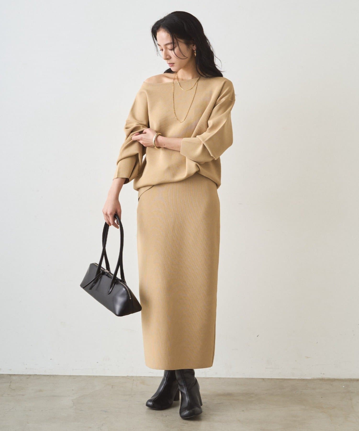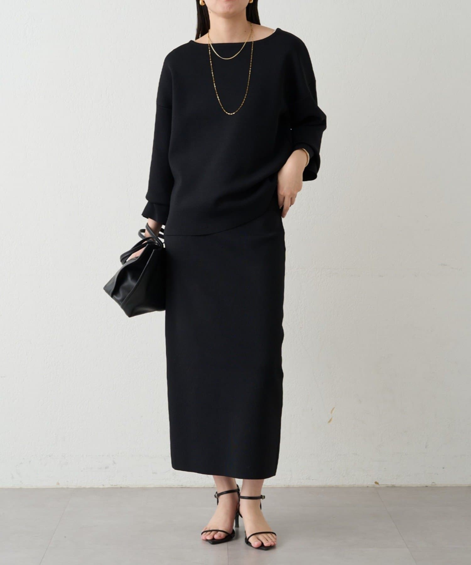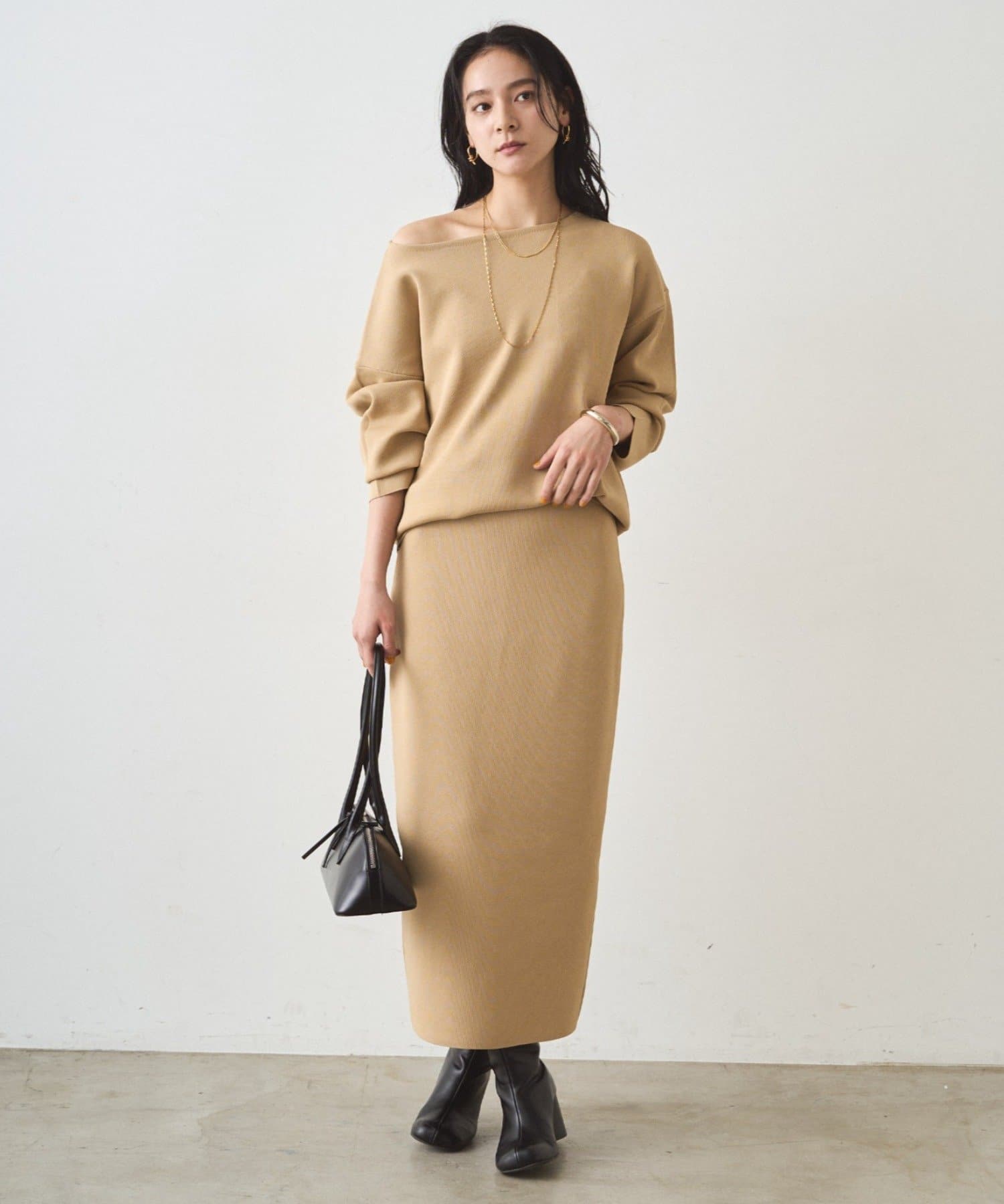 総シリーズのスムースボートネックニットとのセットアップもおすすめです。