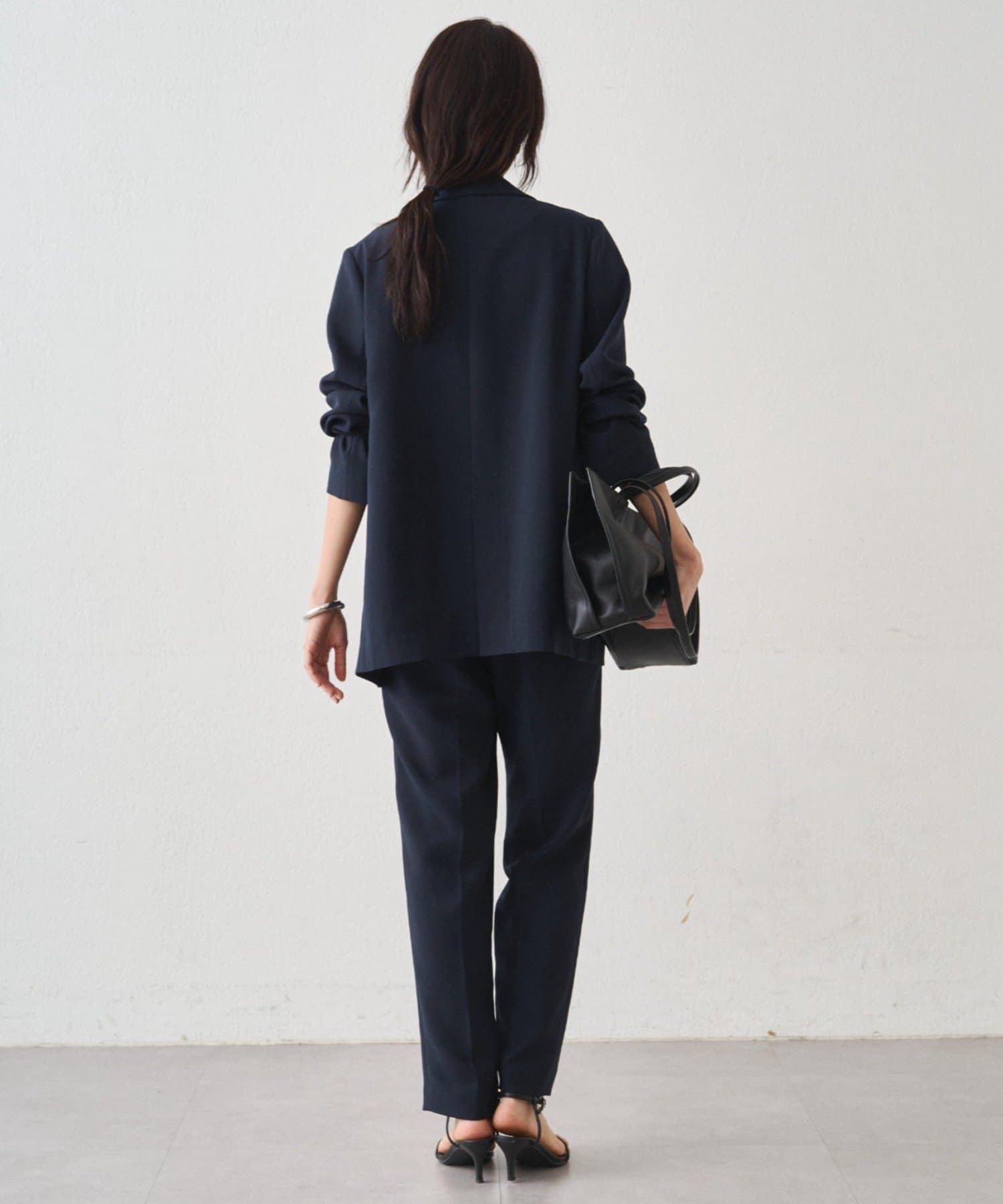 程よい落ち感と上品な光沢が特徴のダブルクロス素材を使用しているので、カジュアルになりすぎず、きちんと感を演出します。シワになりにくいのも嬉しいポイントです。