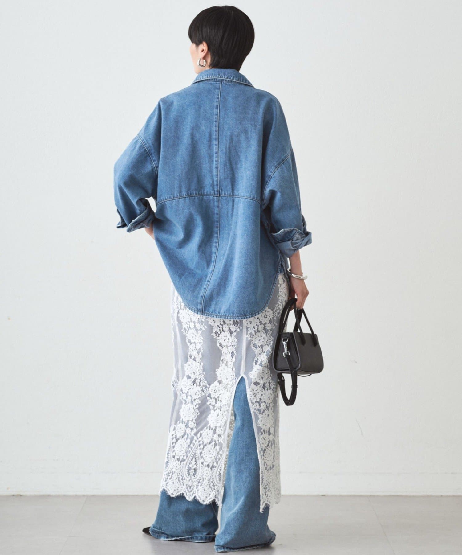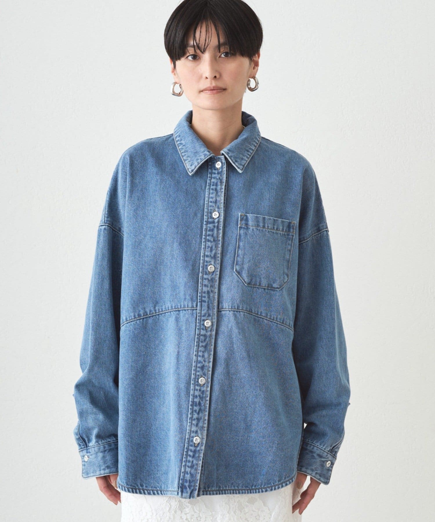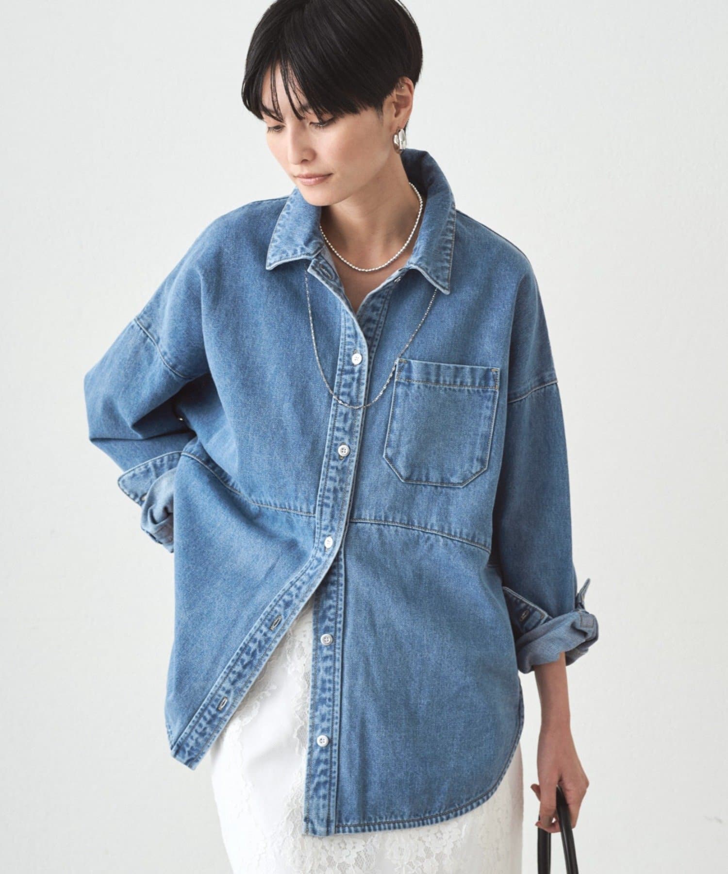 カジュアルなデザインのデニムシャツは、女性らしいアイテムに合わせるとバランスよく着られます。