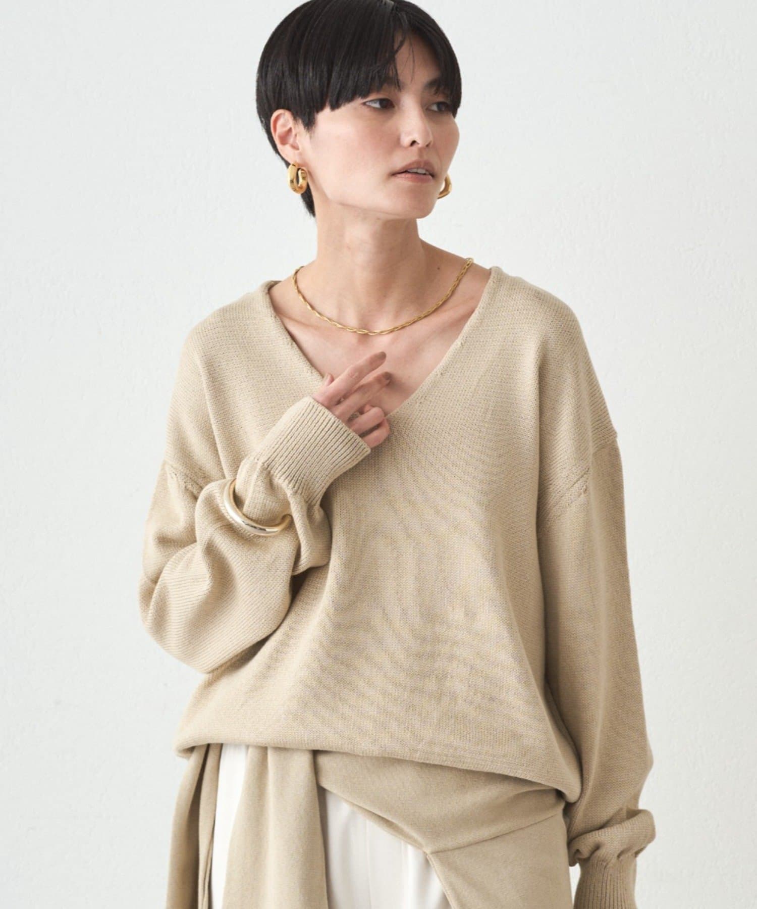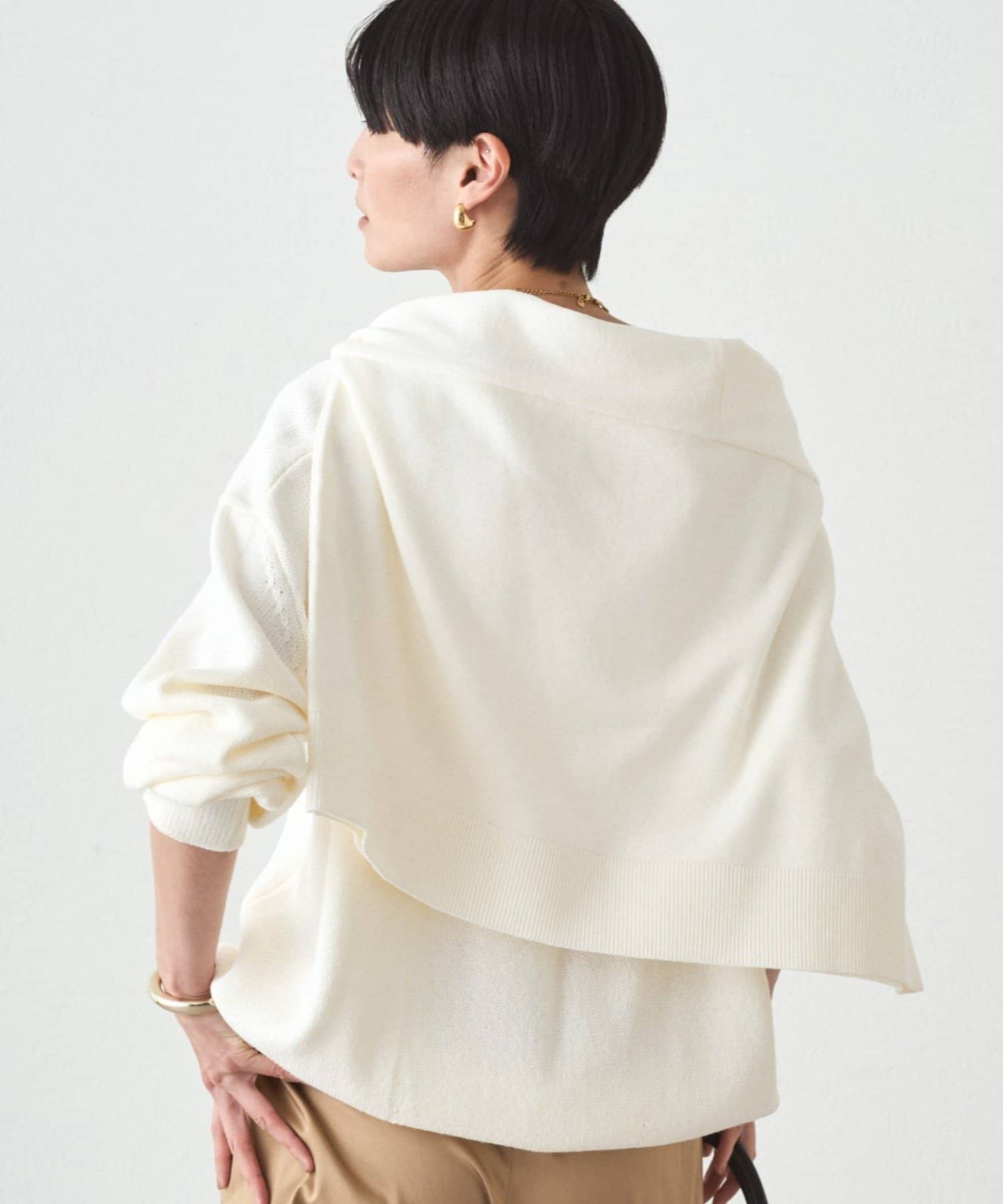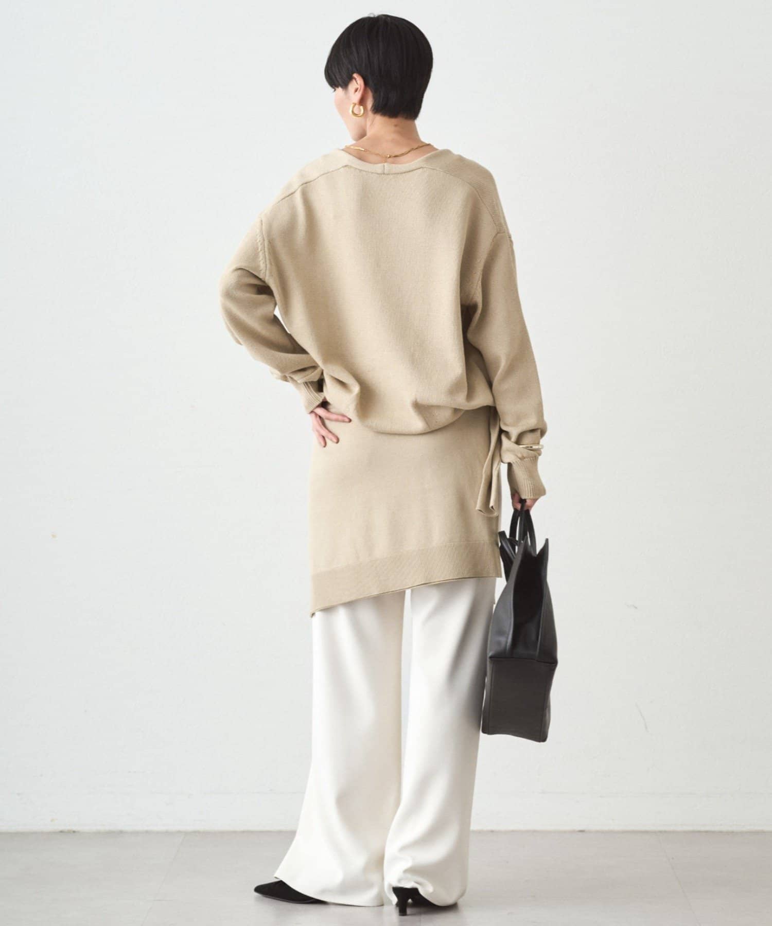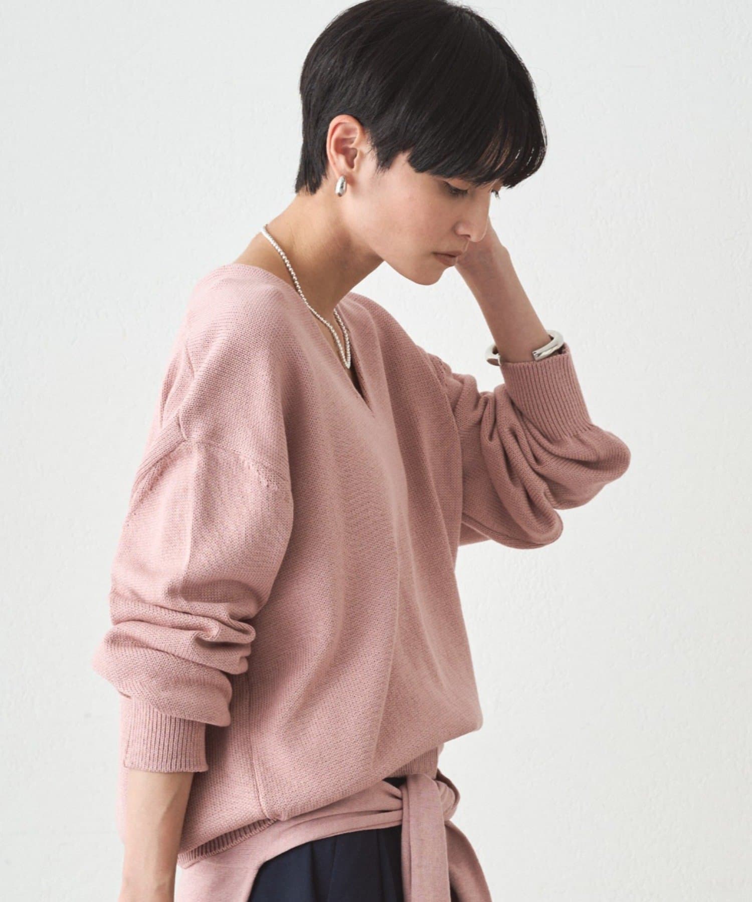 肩掛けニットと同素材で仕立てたVネックニット