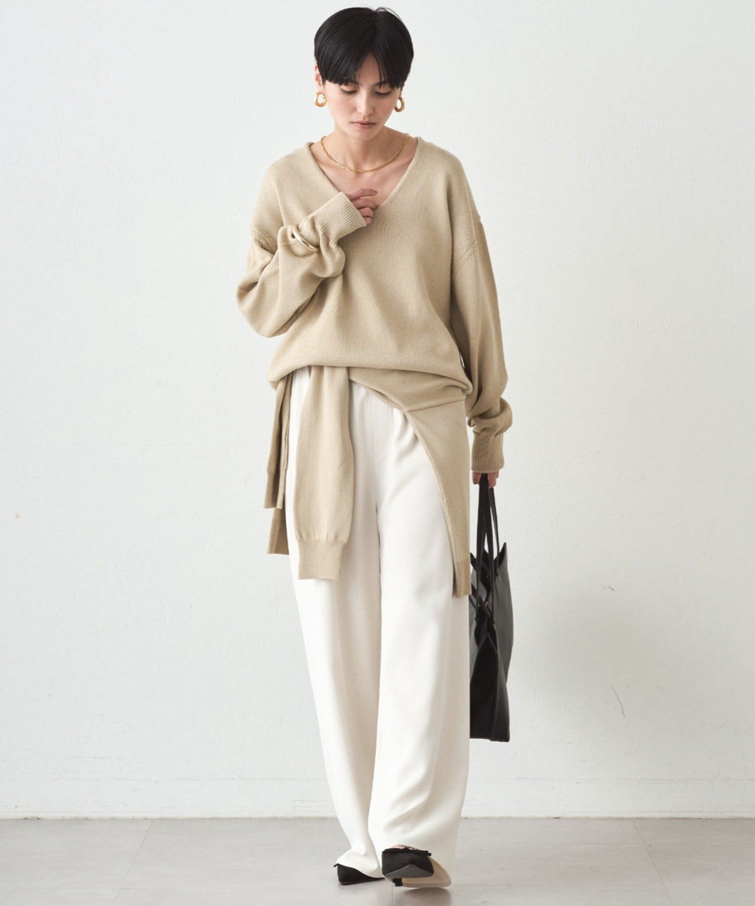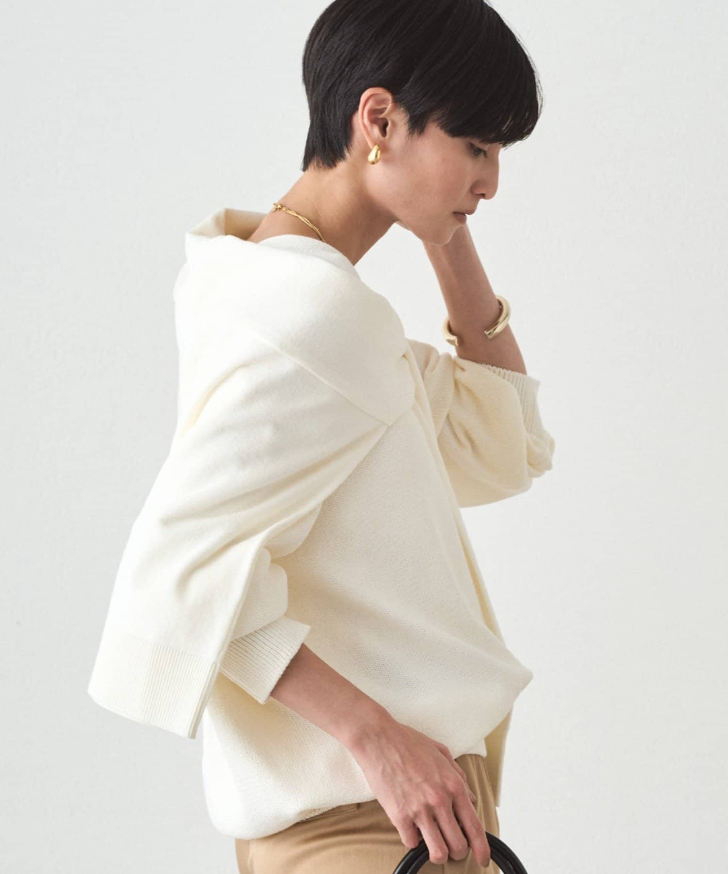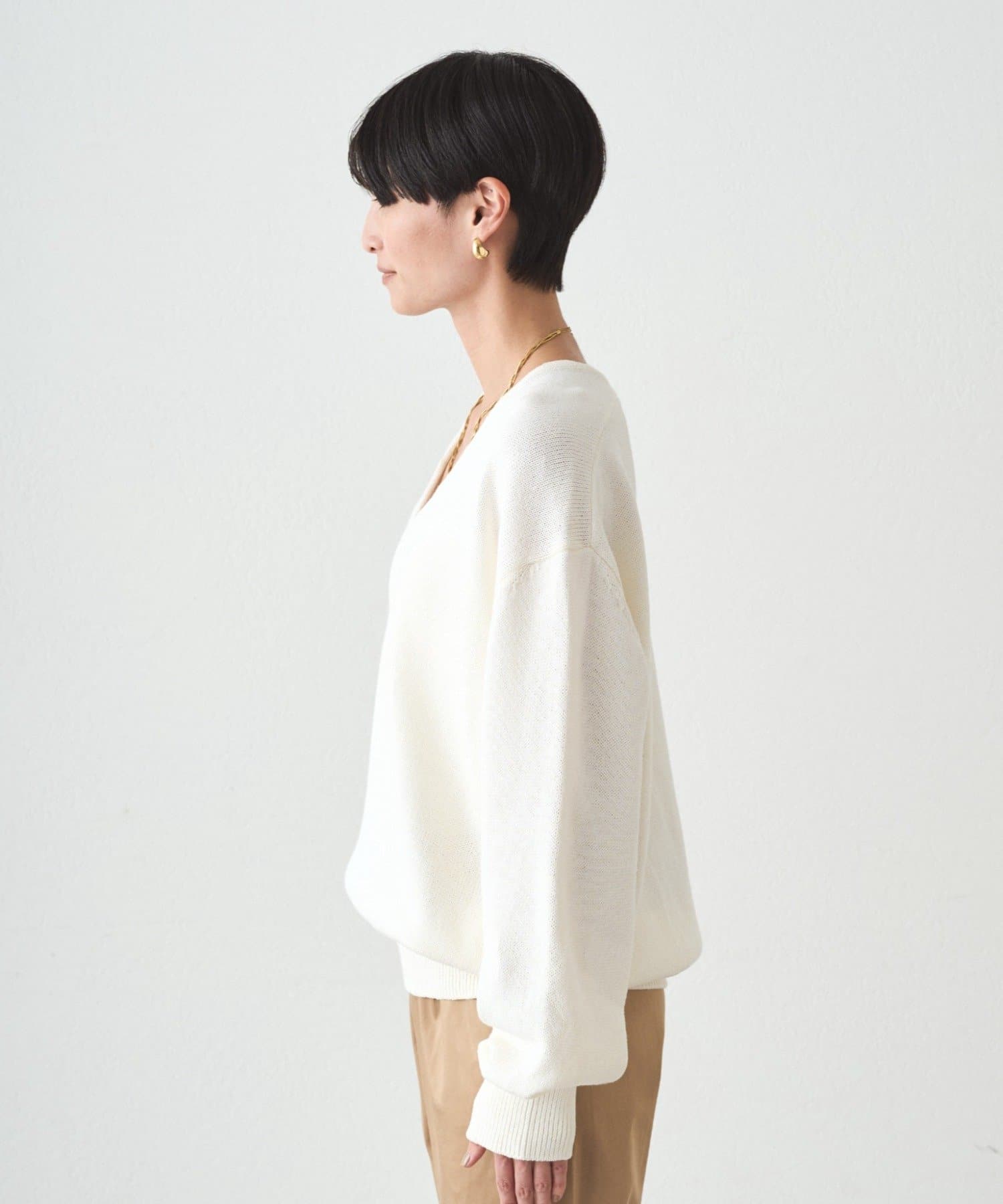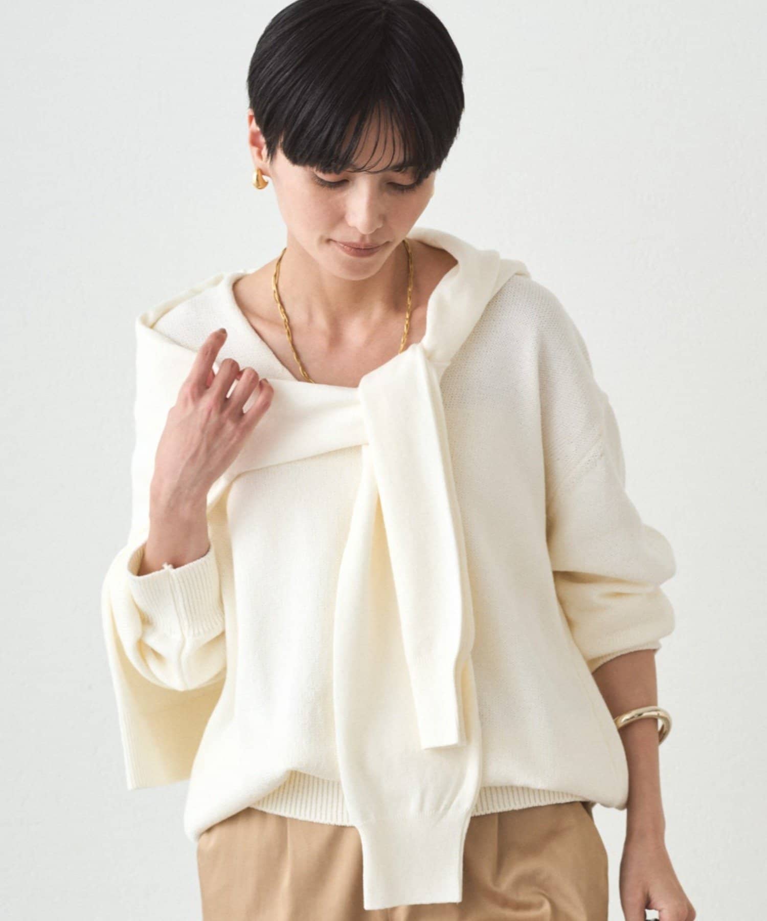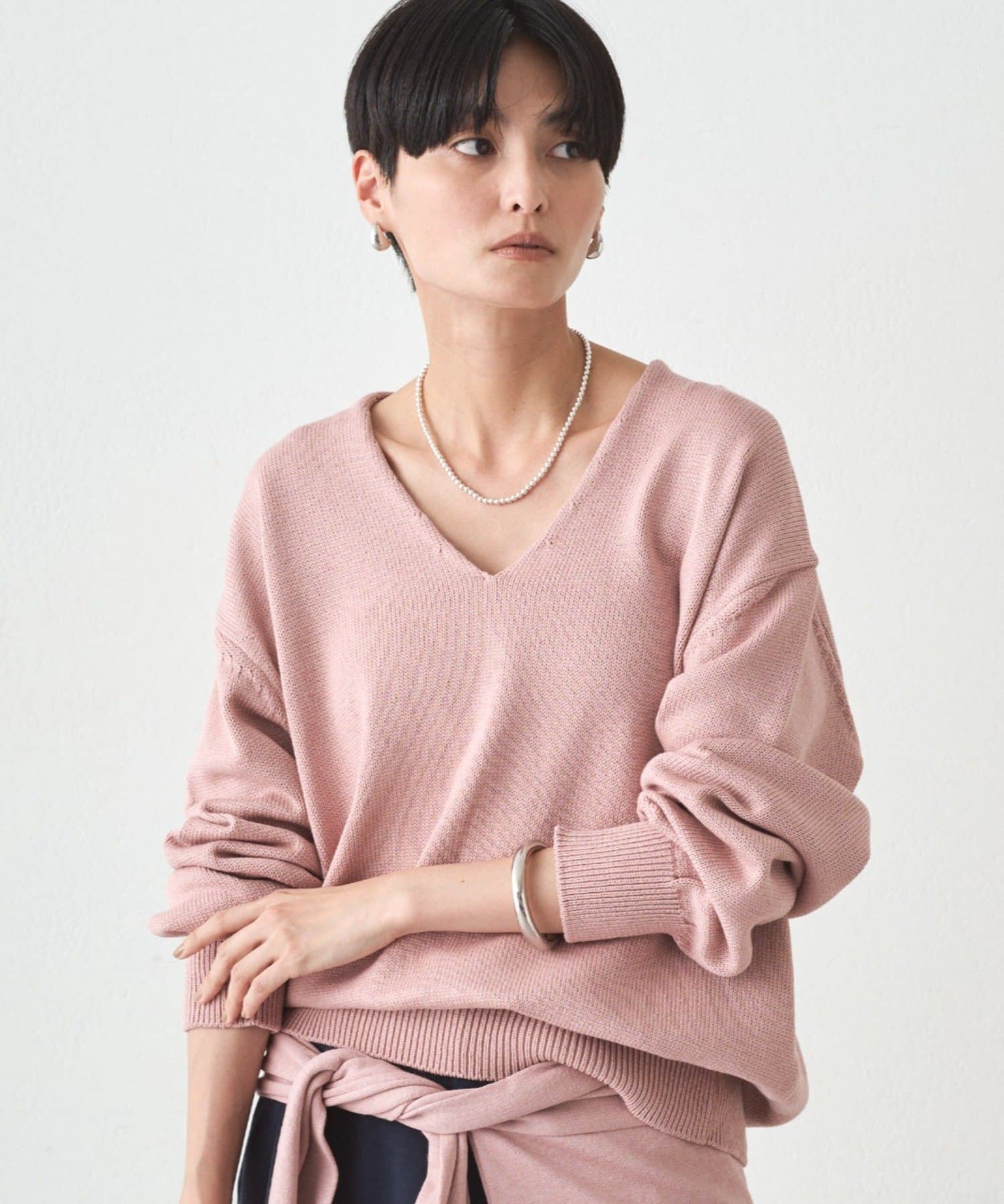 肩掛けニットと同素材で仕立てたVネックニット