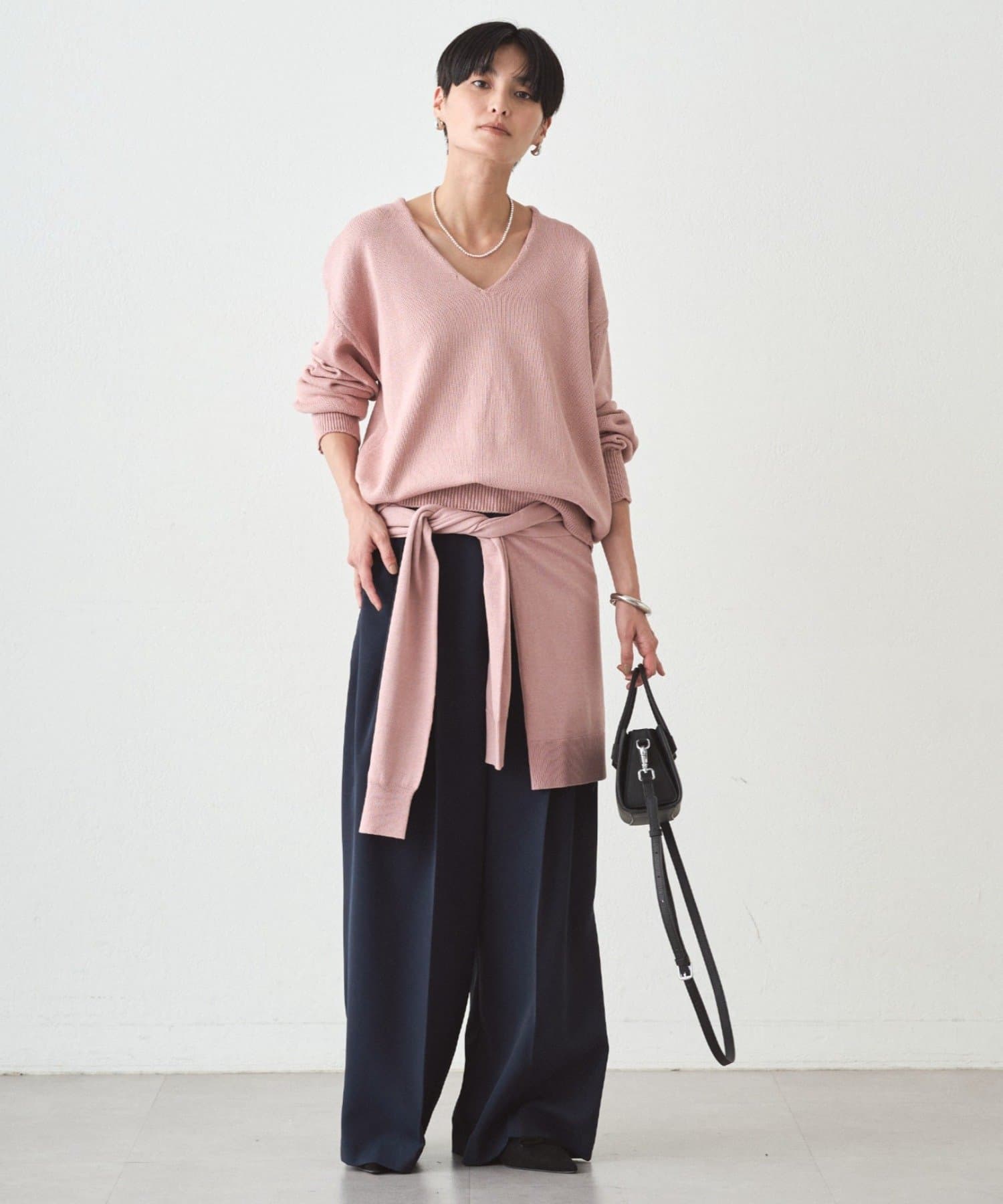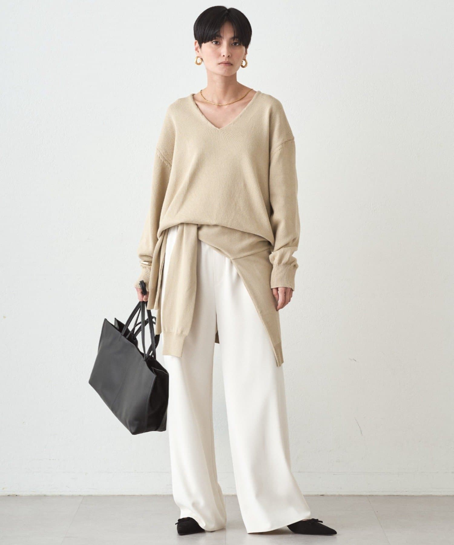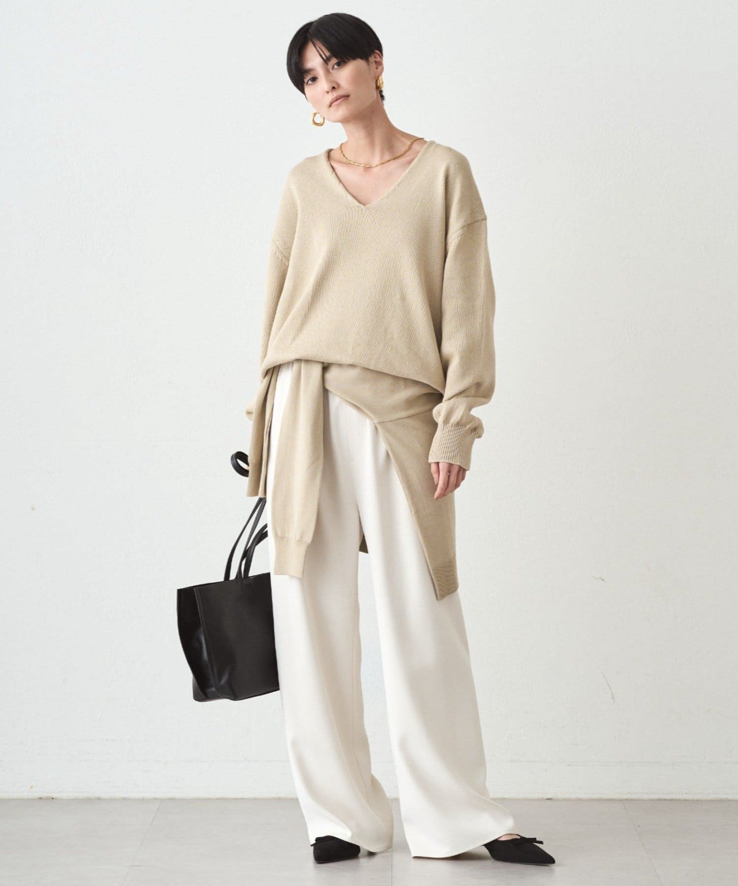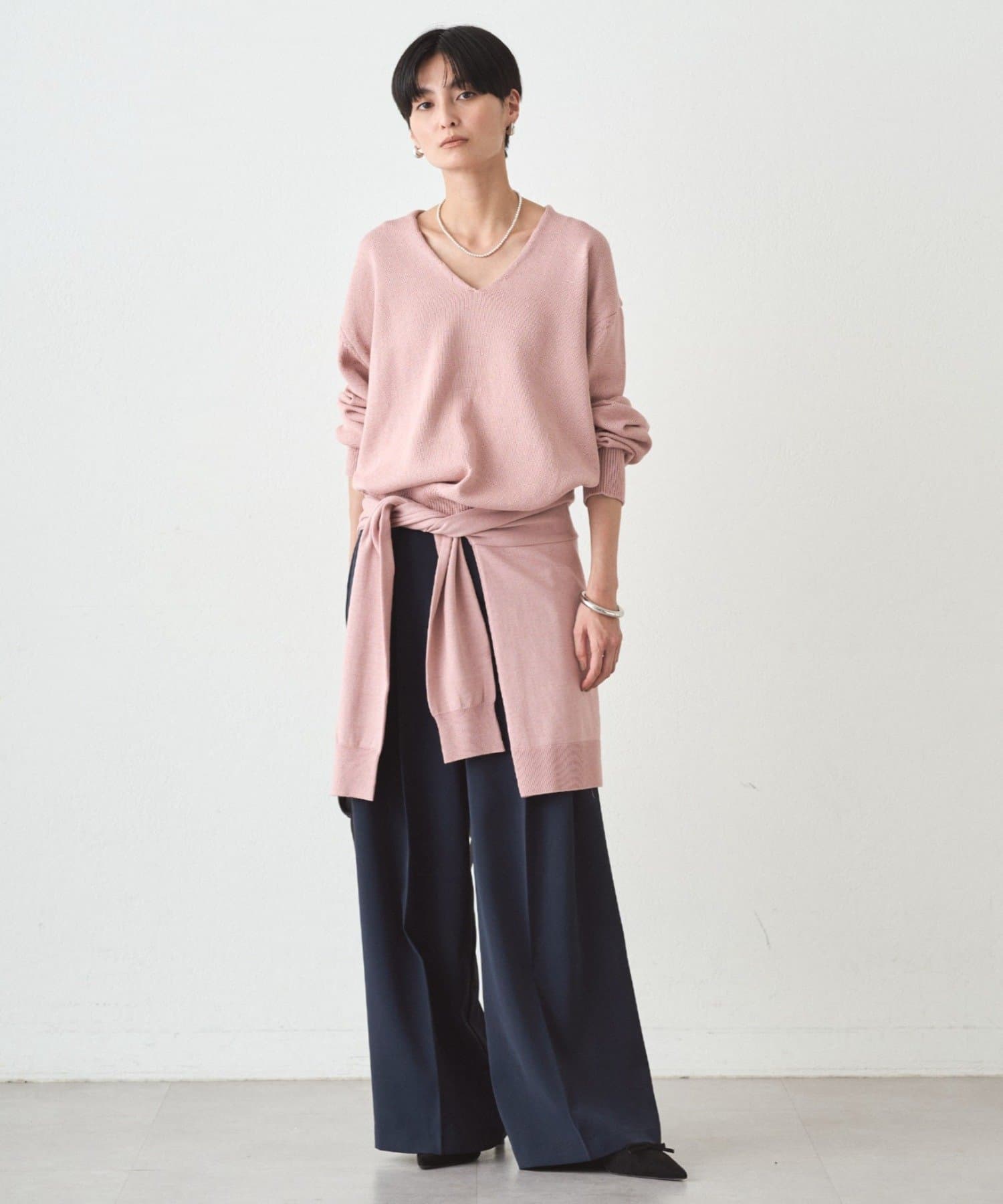 肩掛けニットと同素材で仕立てたVネックニット