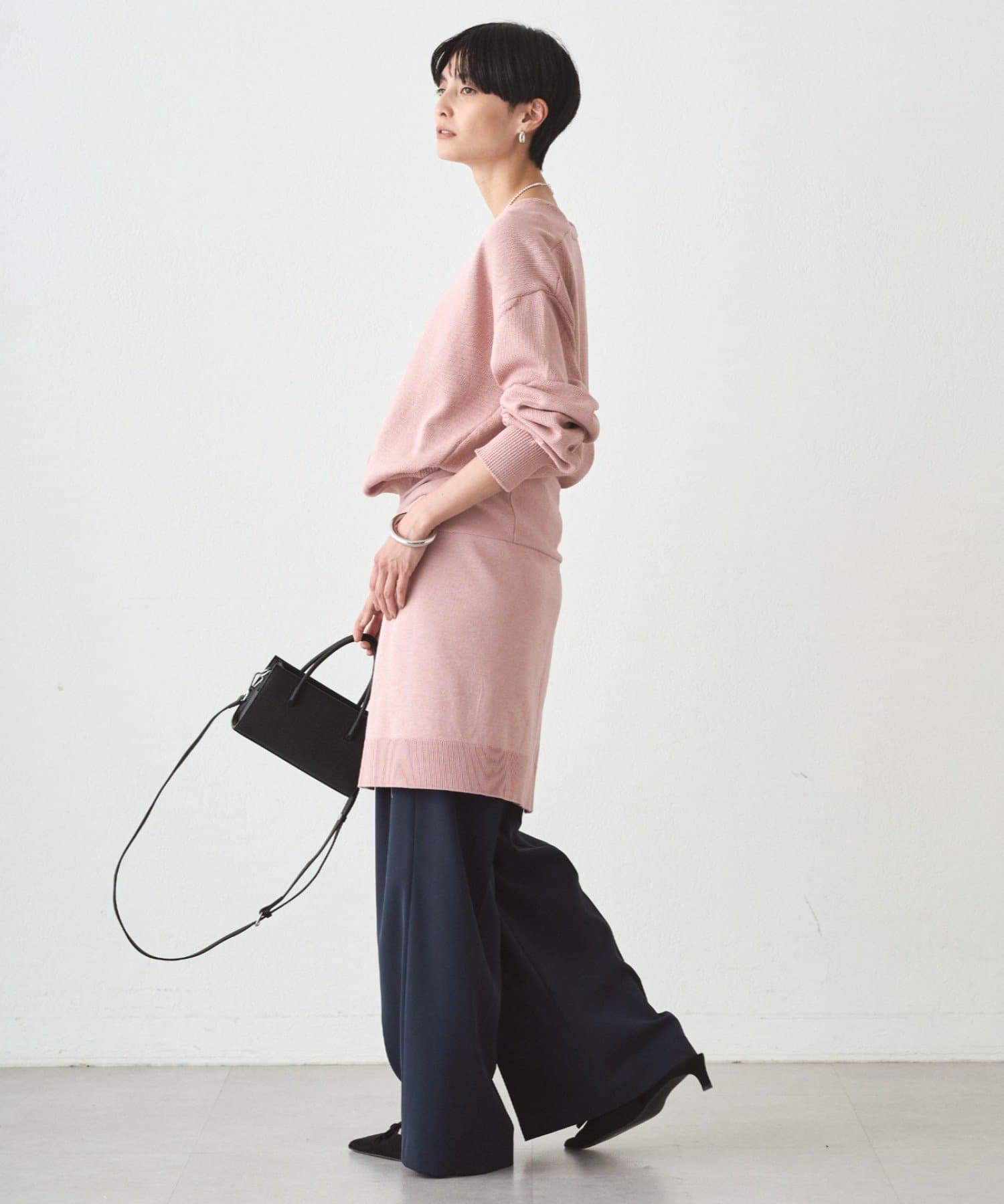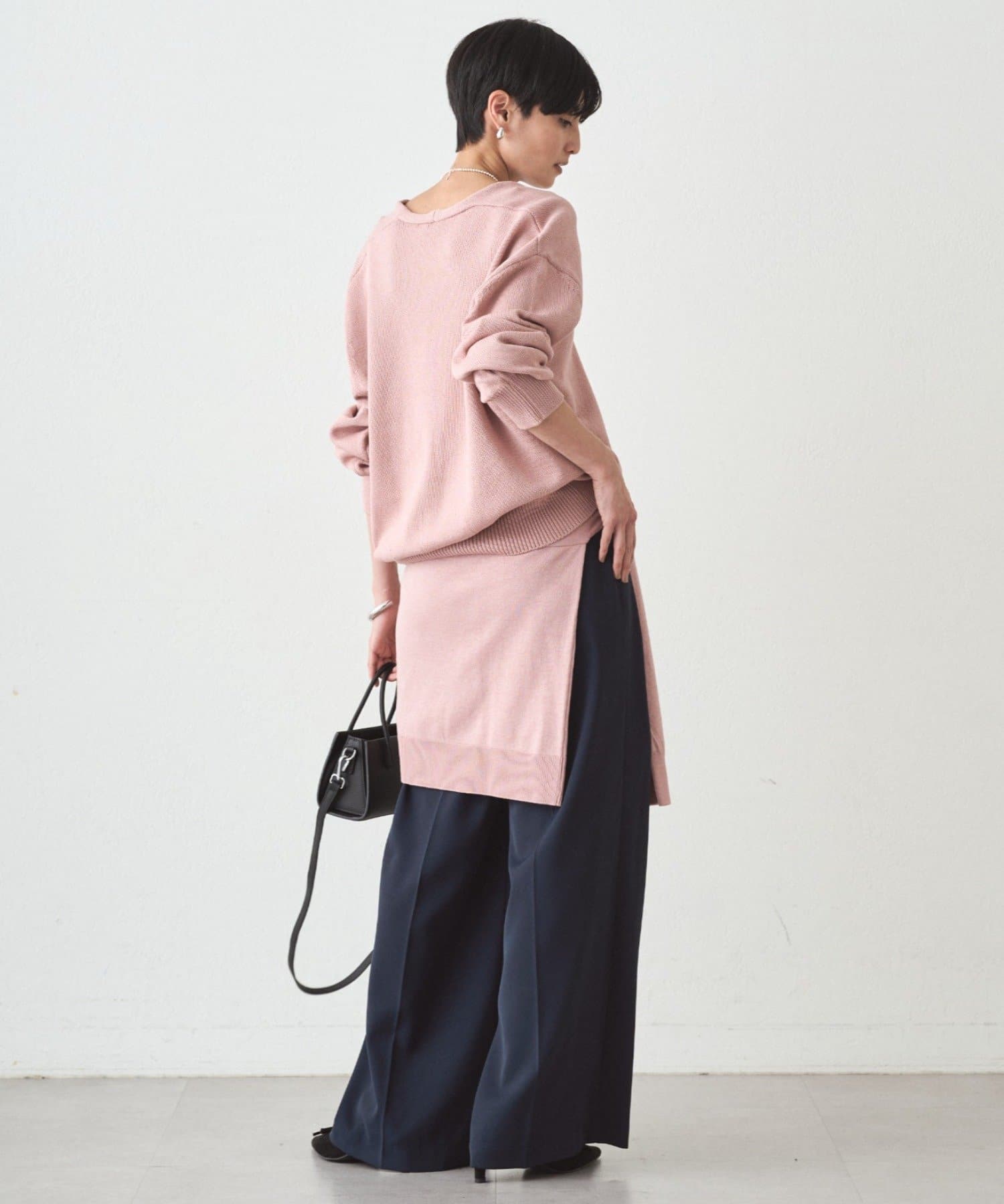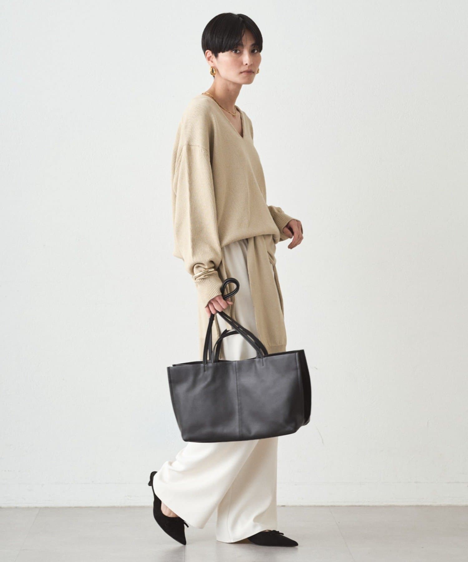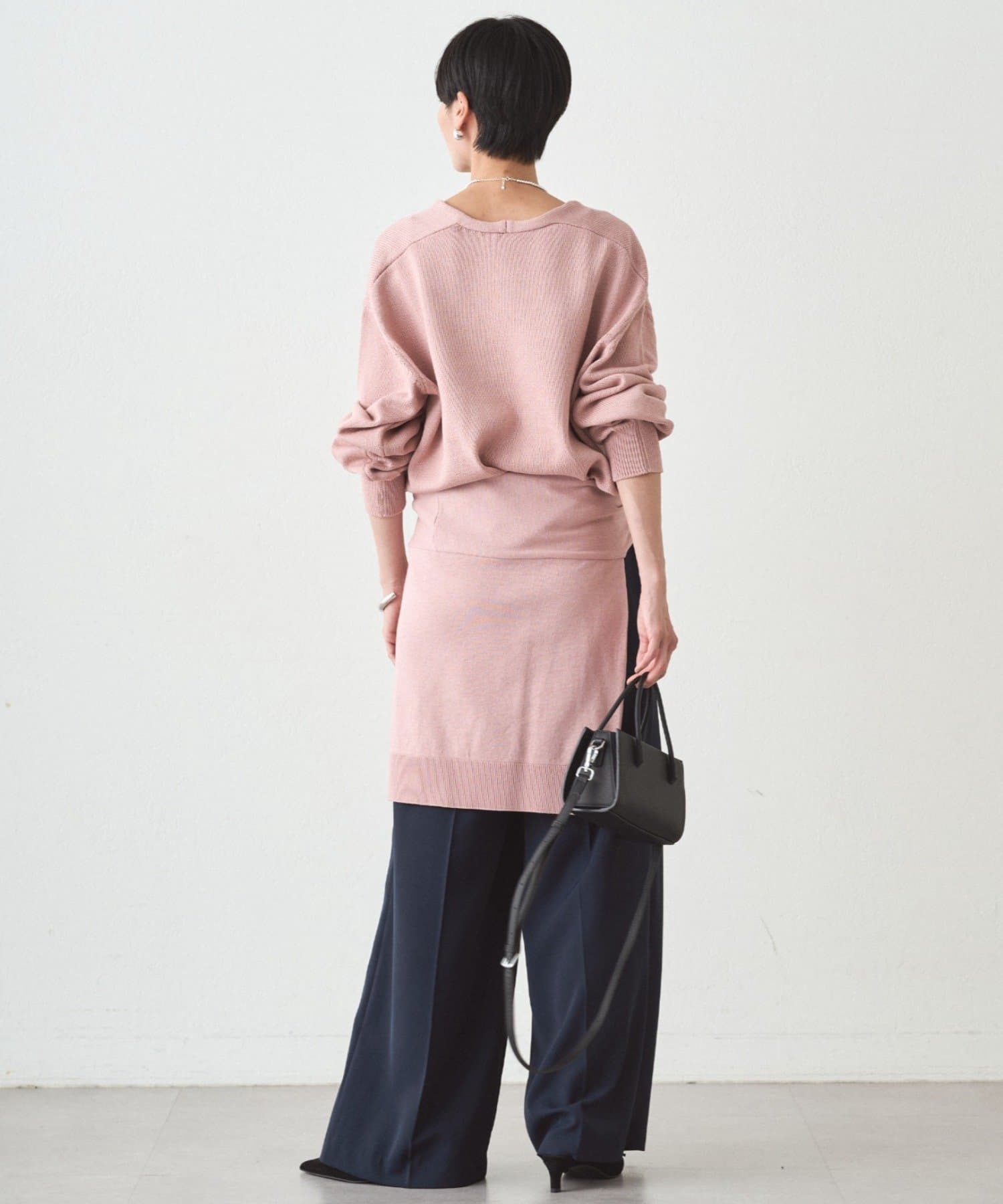 肩掛けニットと同素材で仕立てたVネックニット