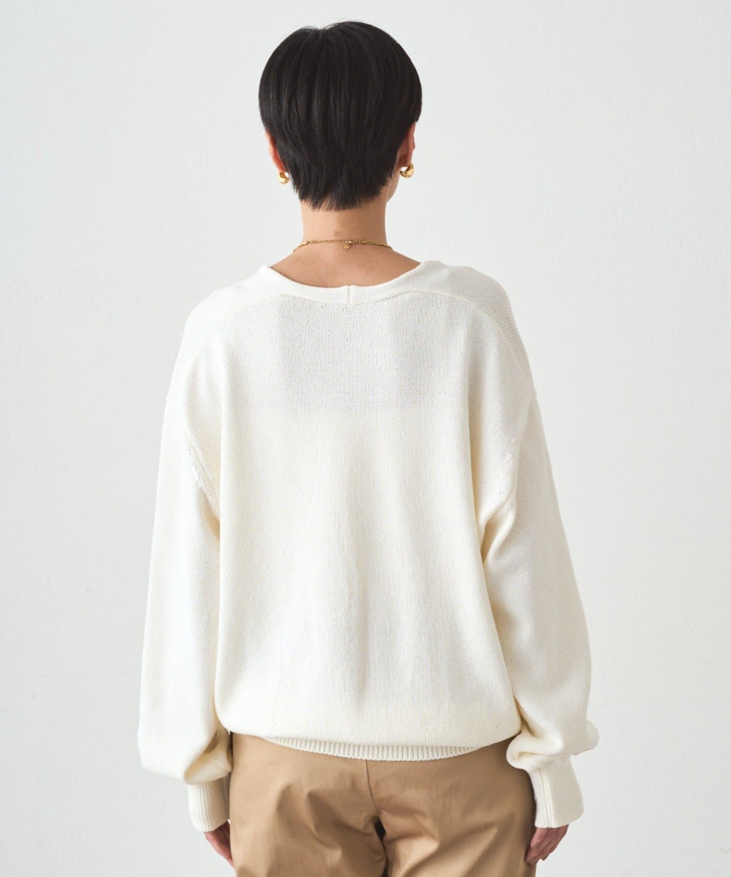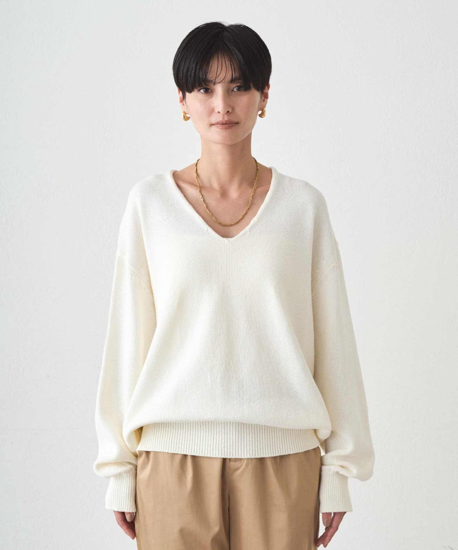 オーバーすぎないサイズ感と深すぎないV開きで、どんなボトムとも合わせやすい一枚です。