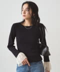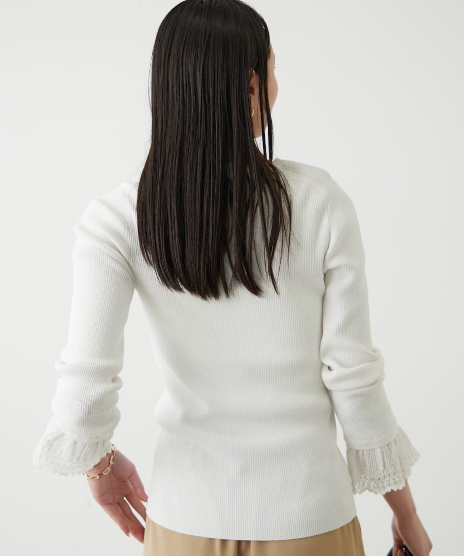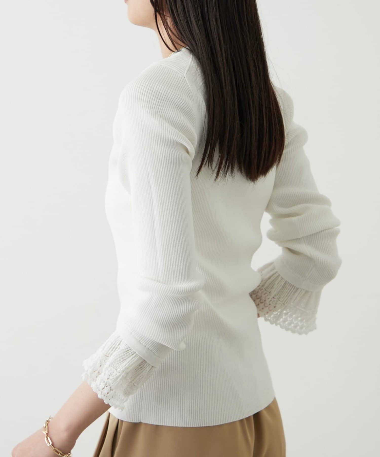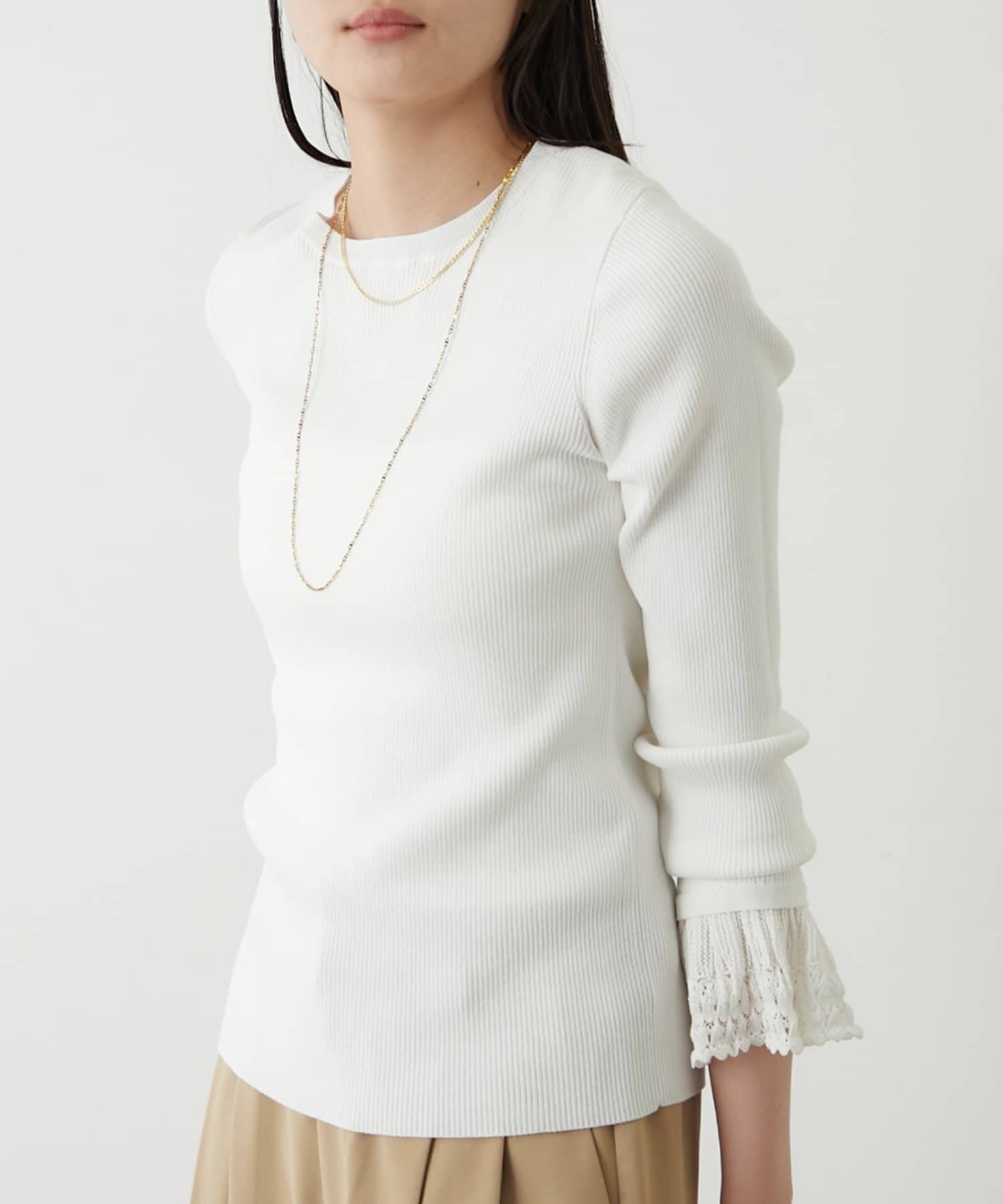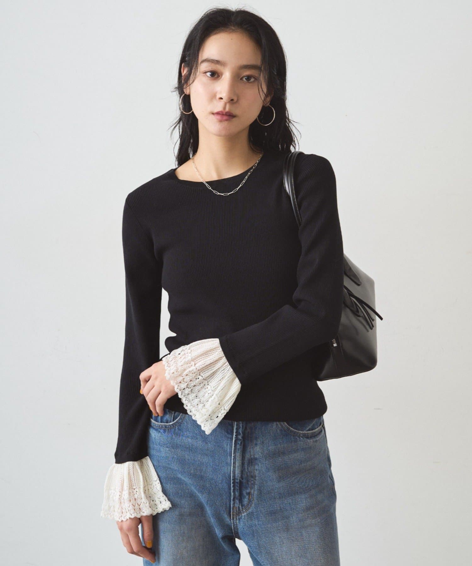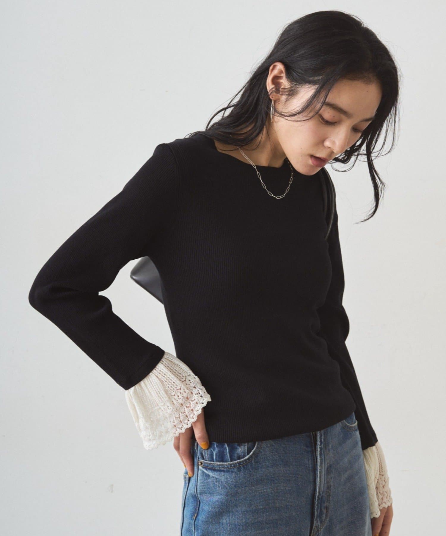 シンプルなリブニットに、繊細なレースをあしらったカフスが印象的なトップス。
