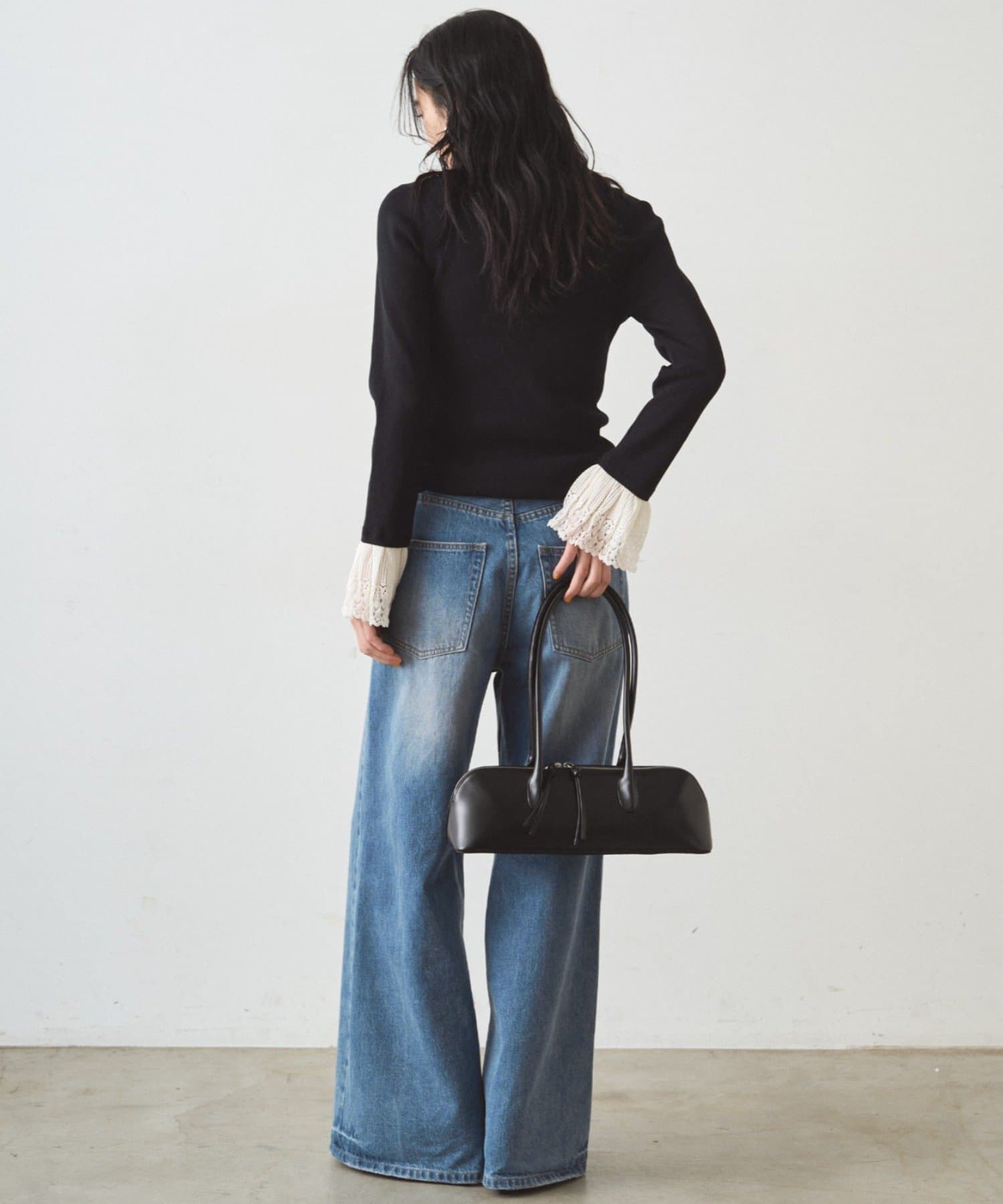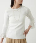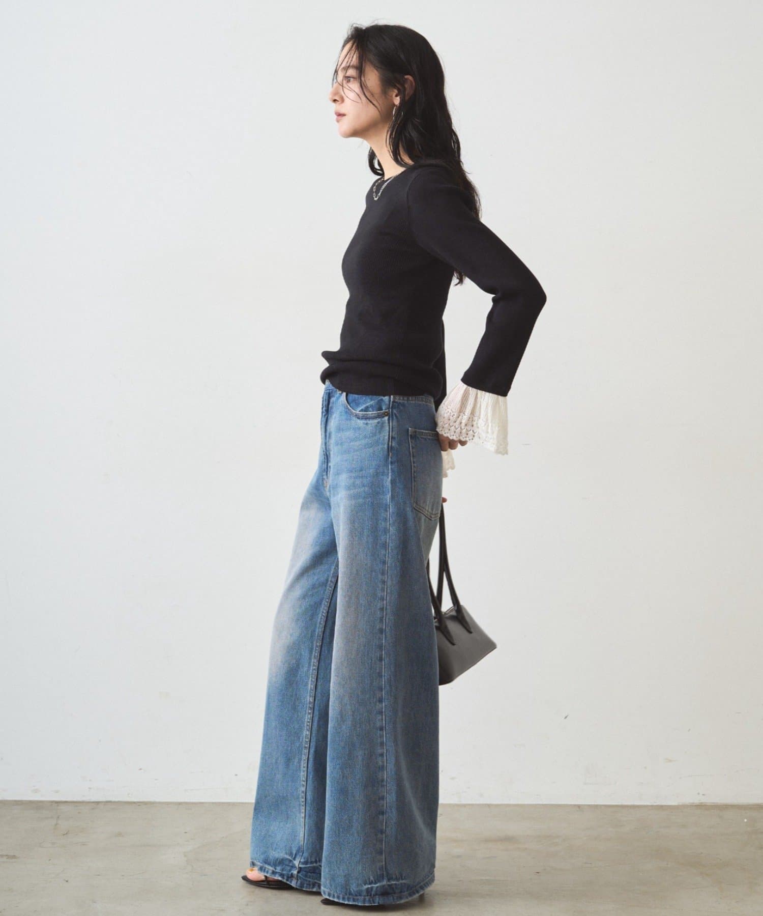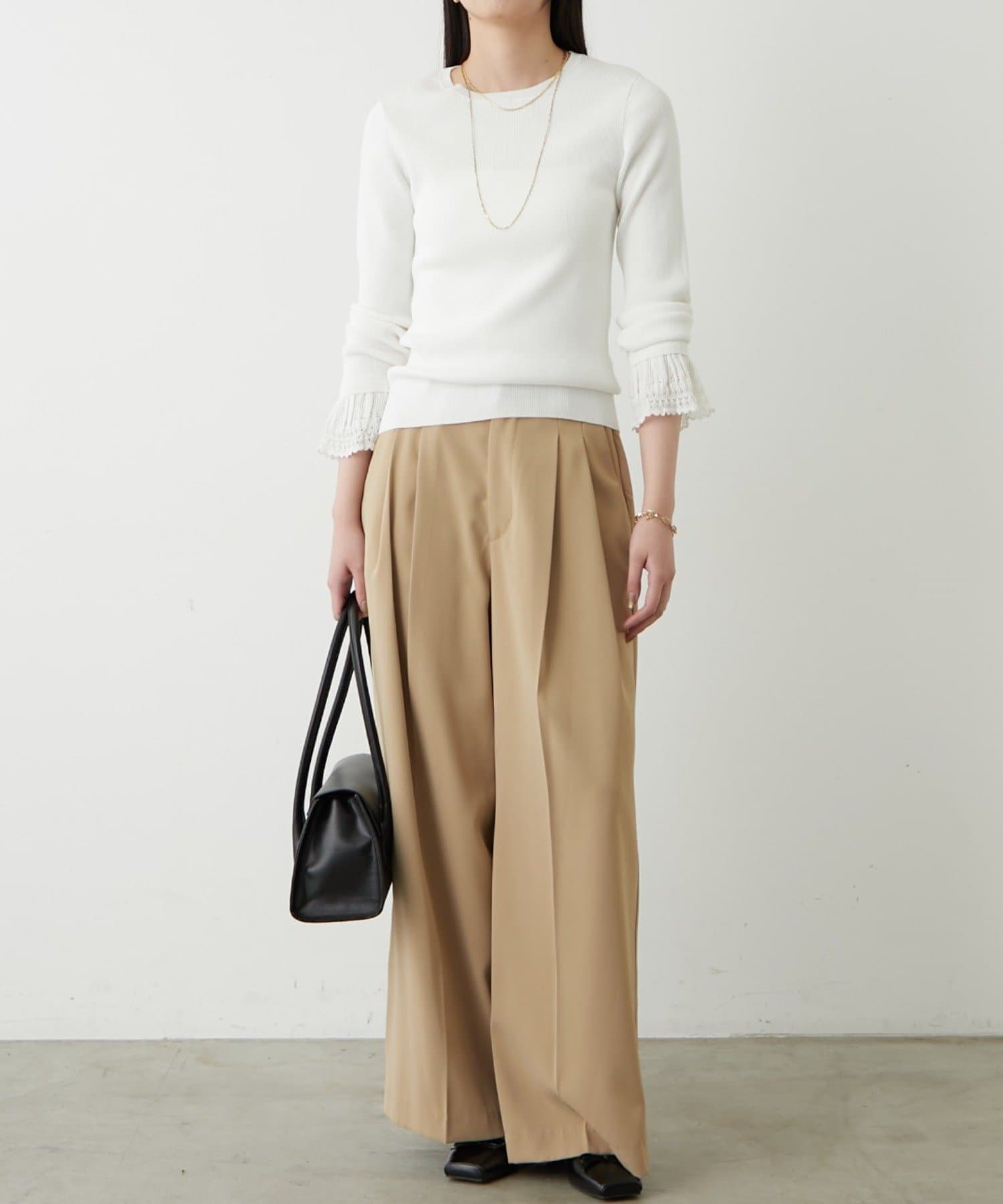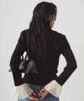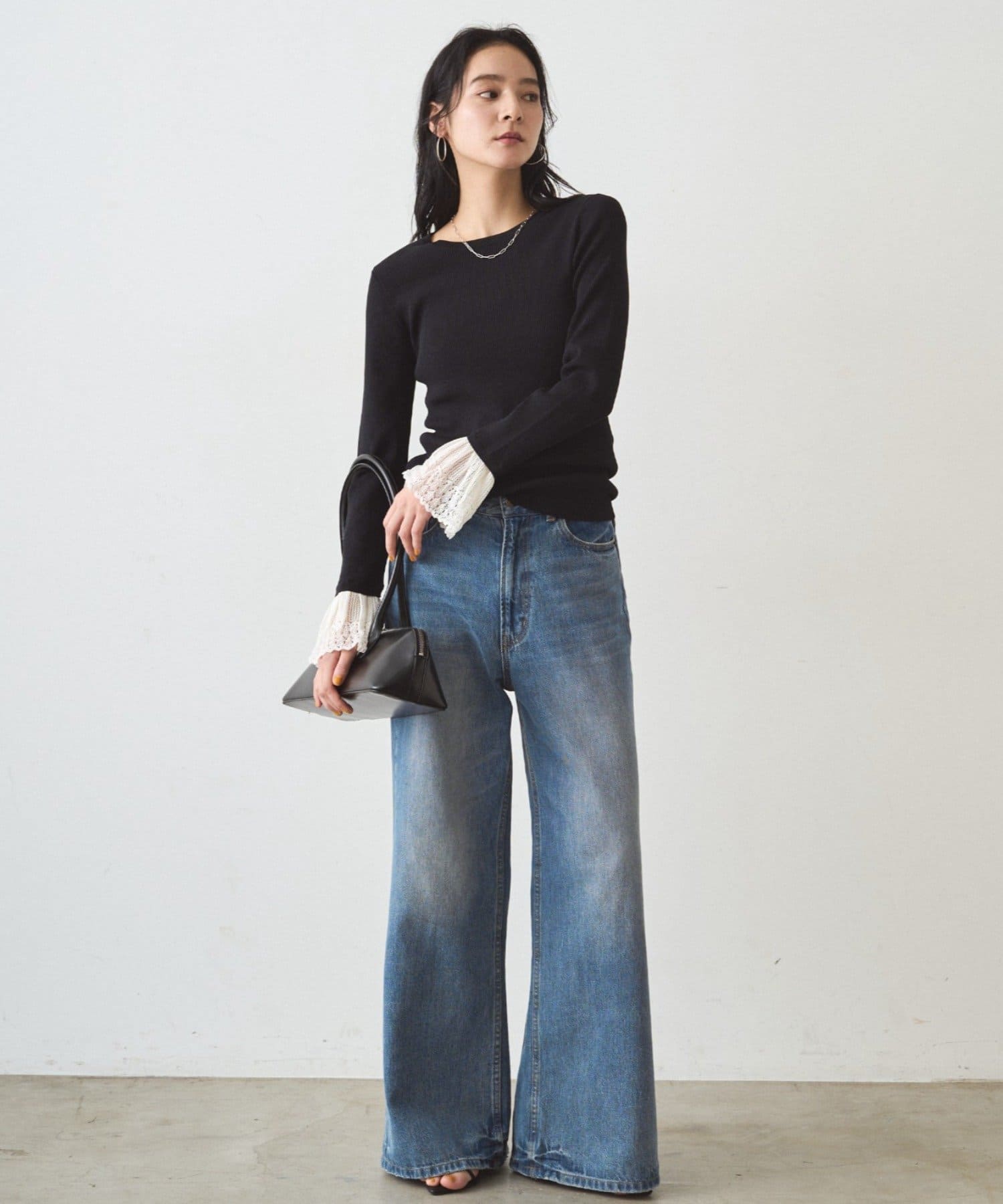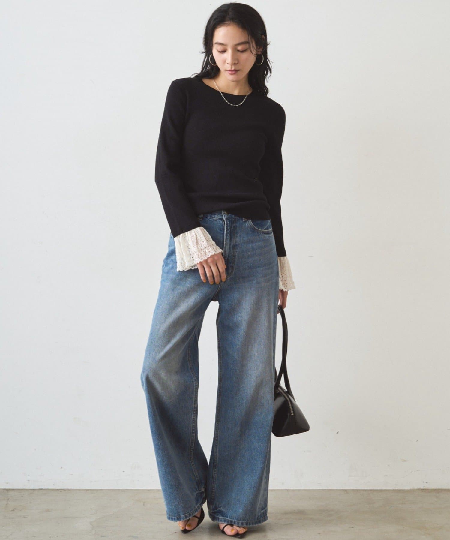 シンプルなリブニットに、繊細なレースをあしらったカフスが印象的なトップス。