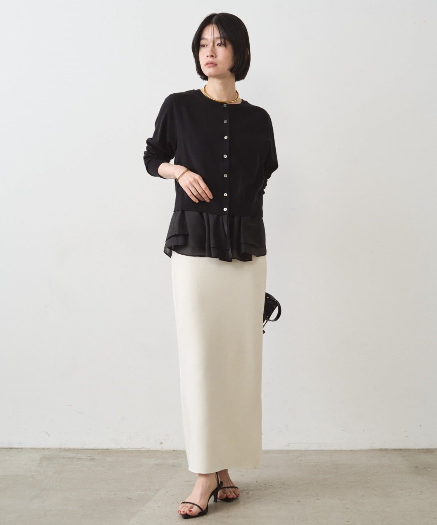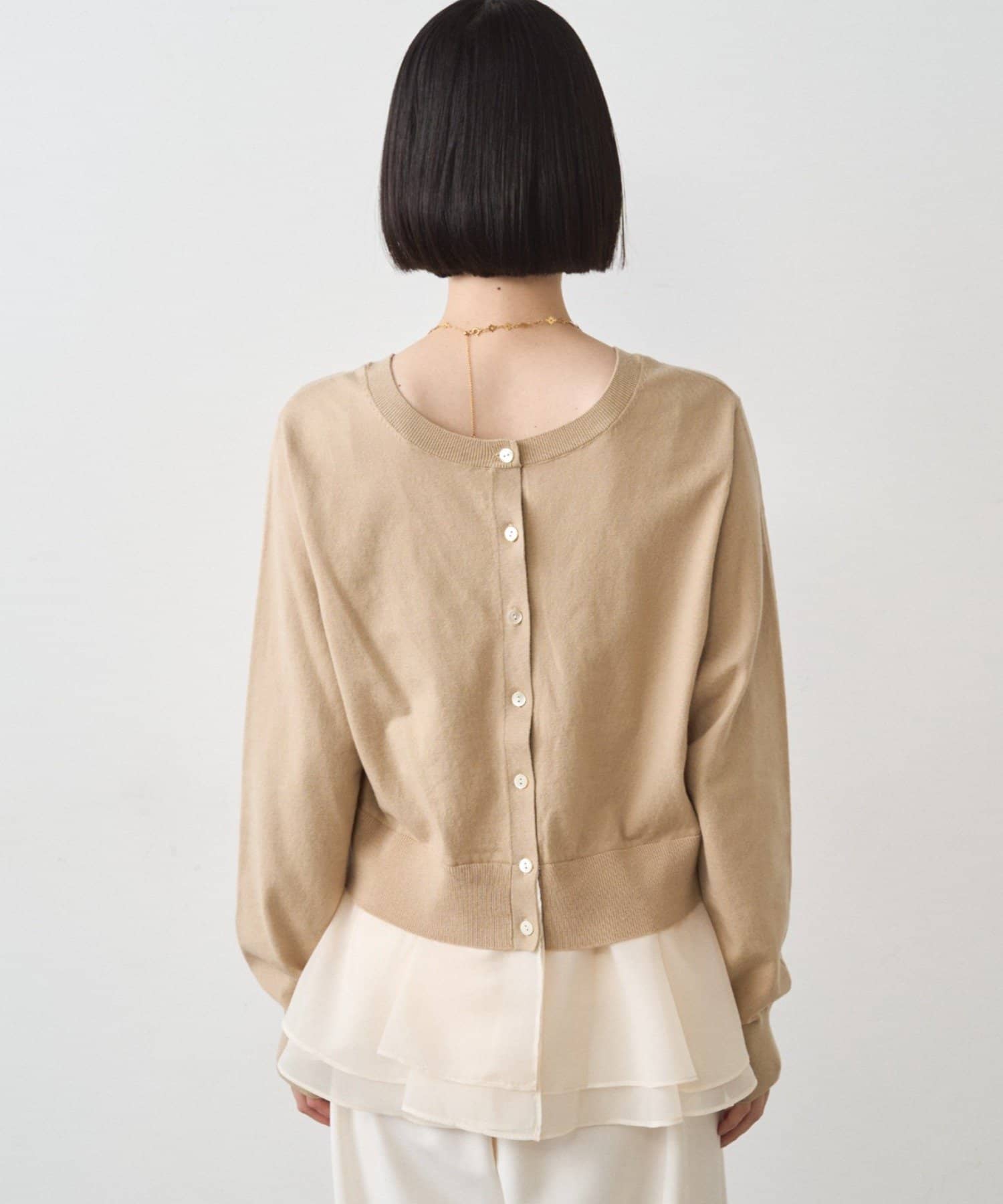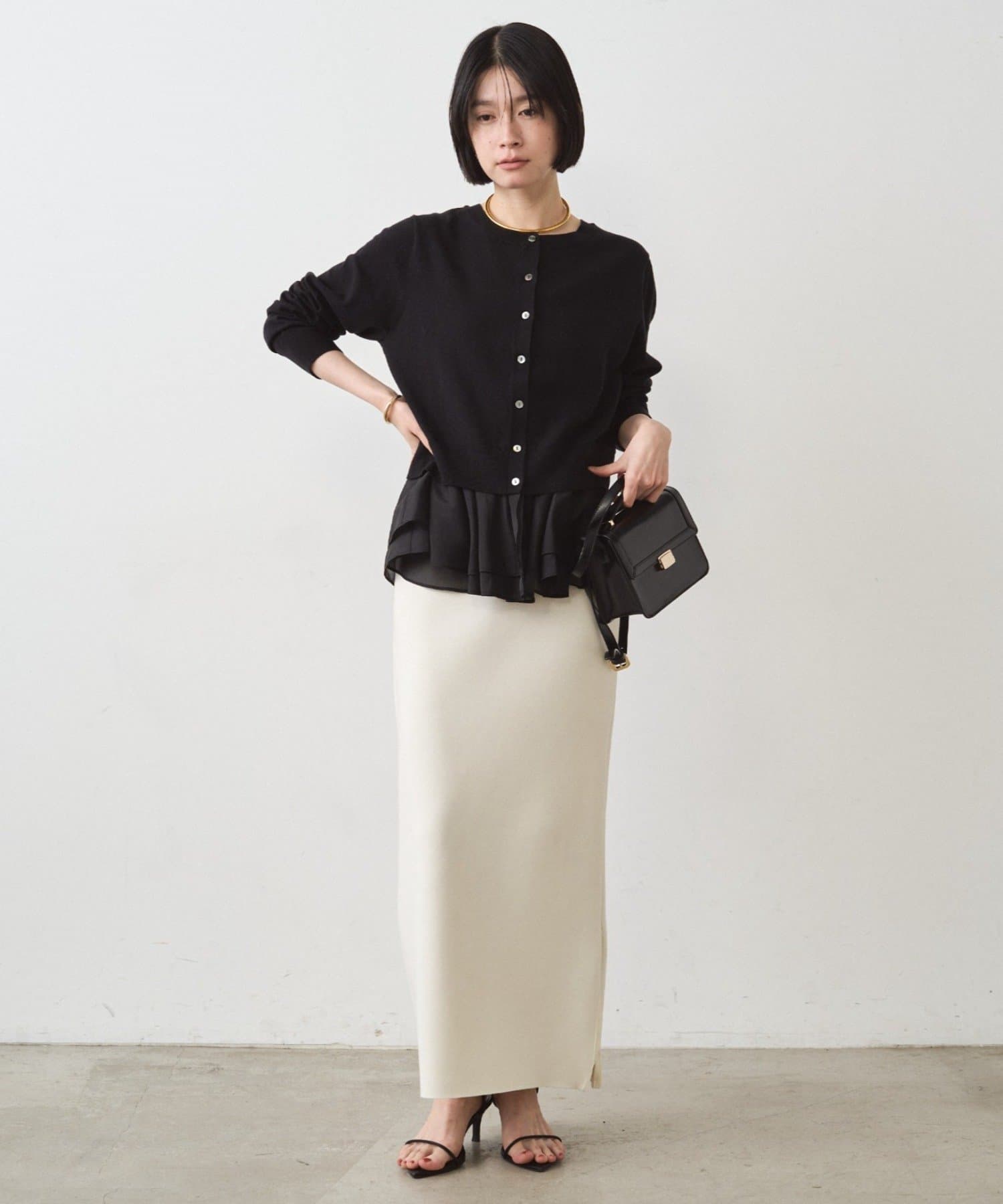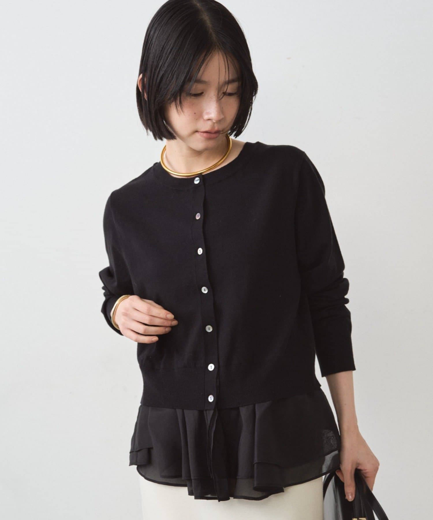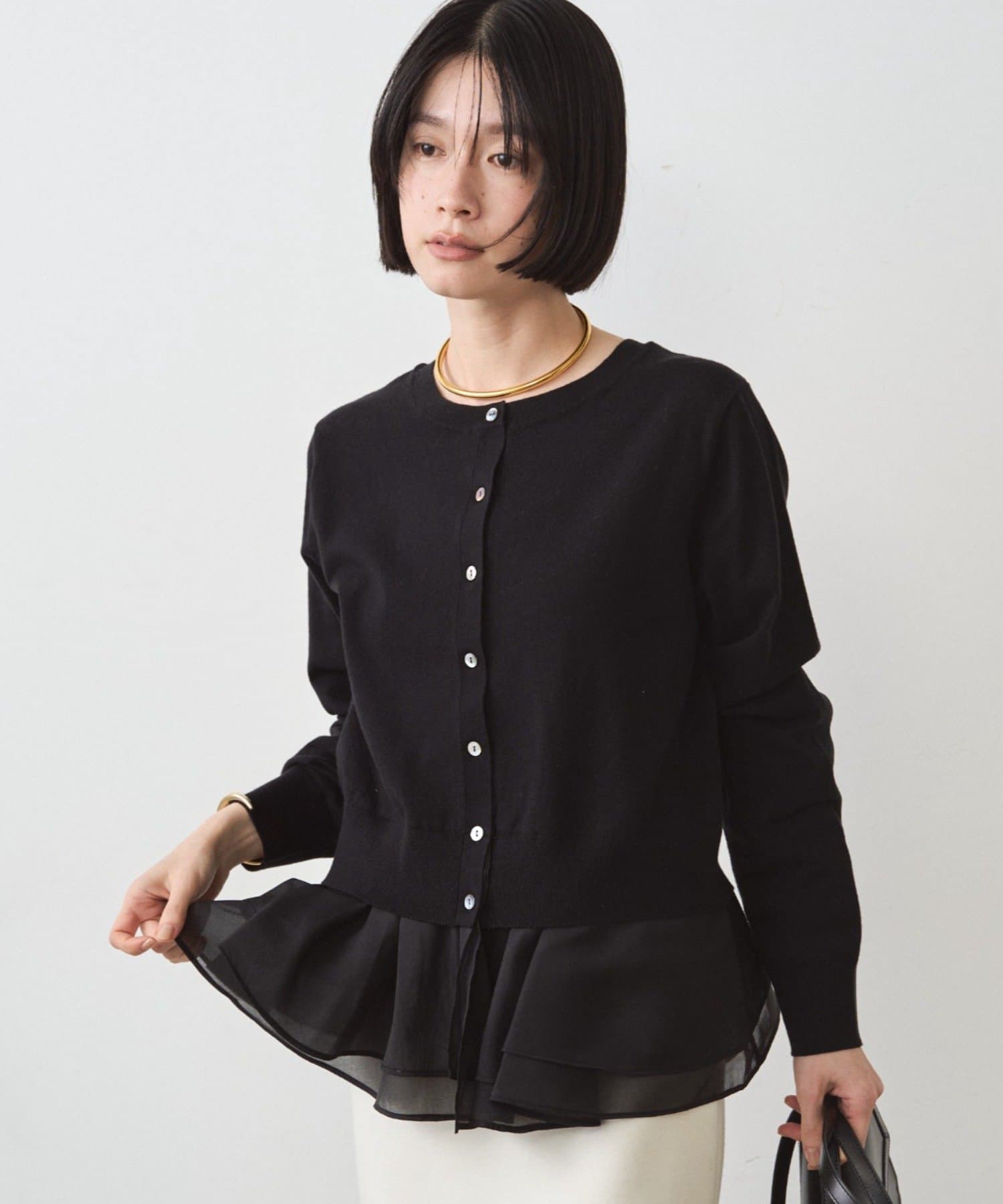 シンプルなニットカーディガンに、ふんわりと広がるペプラムをあしらった、他にはないデザイン。