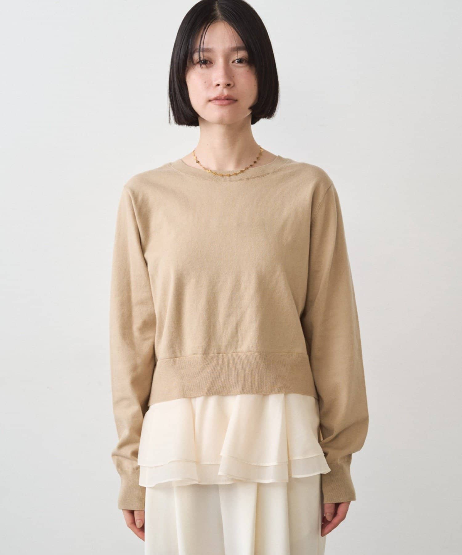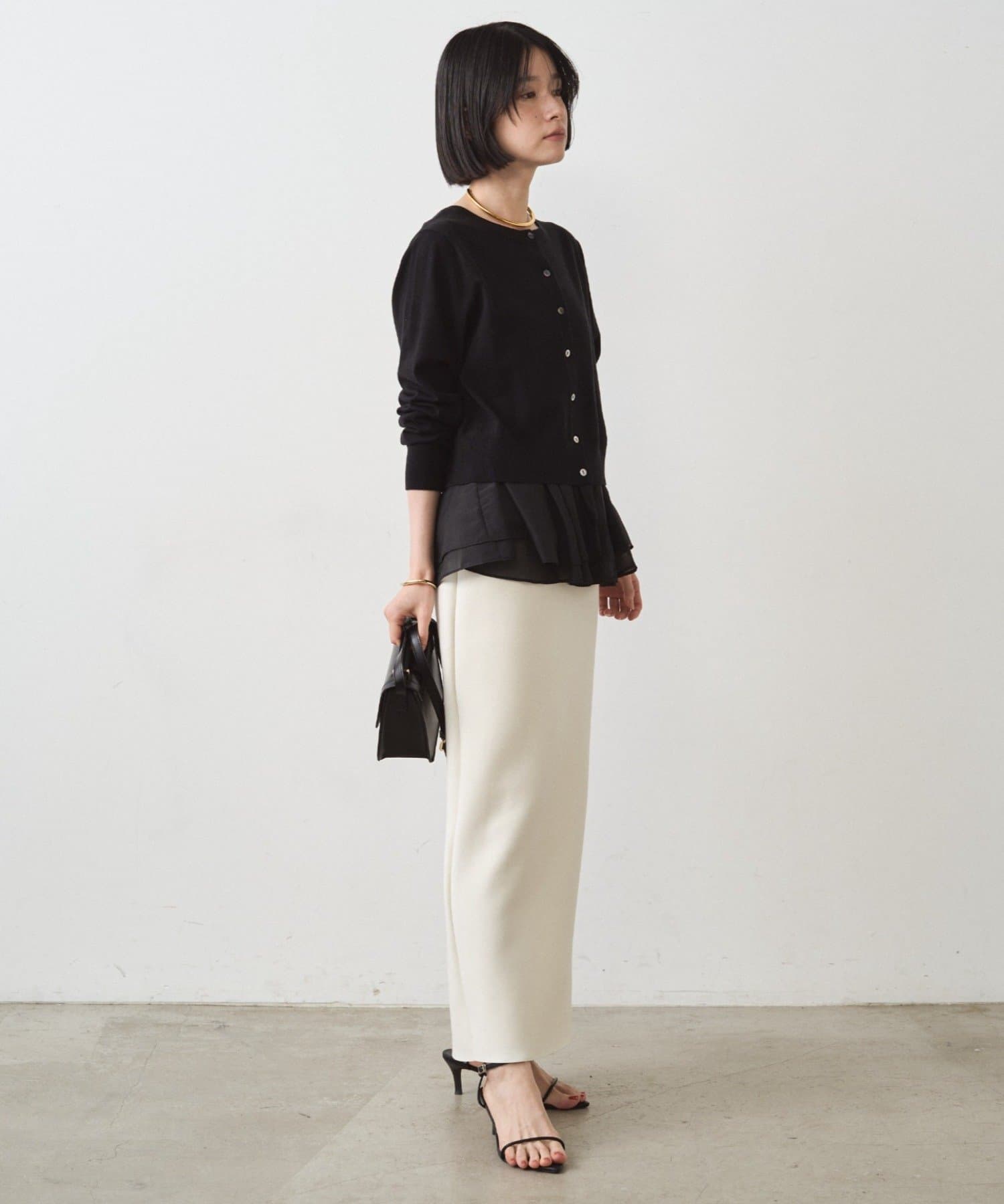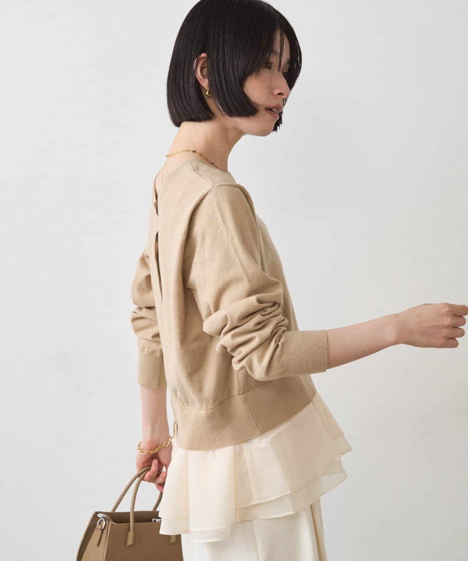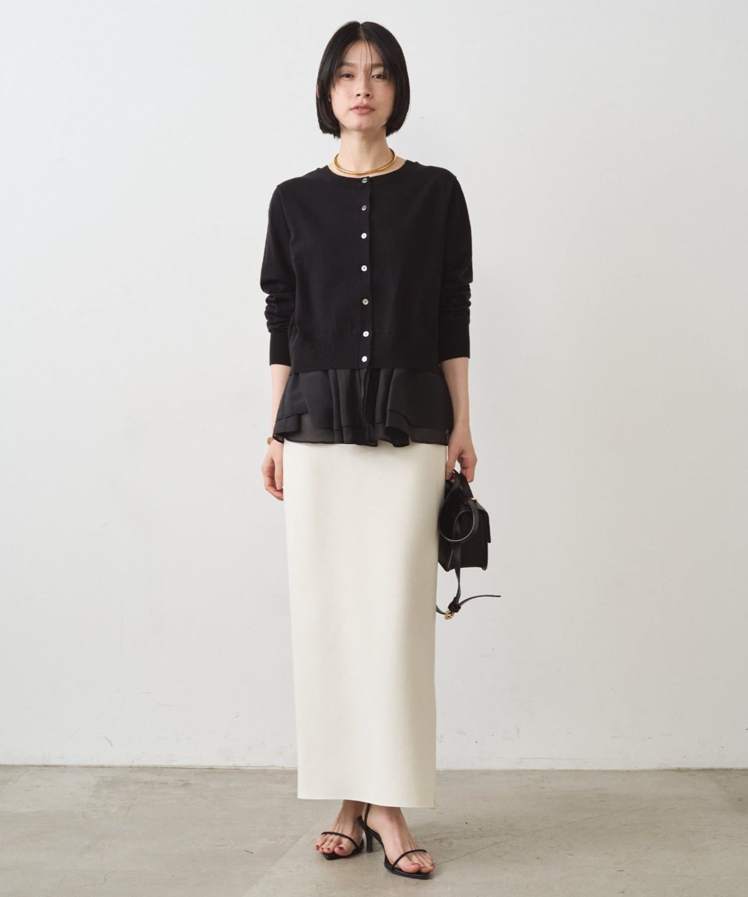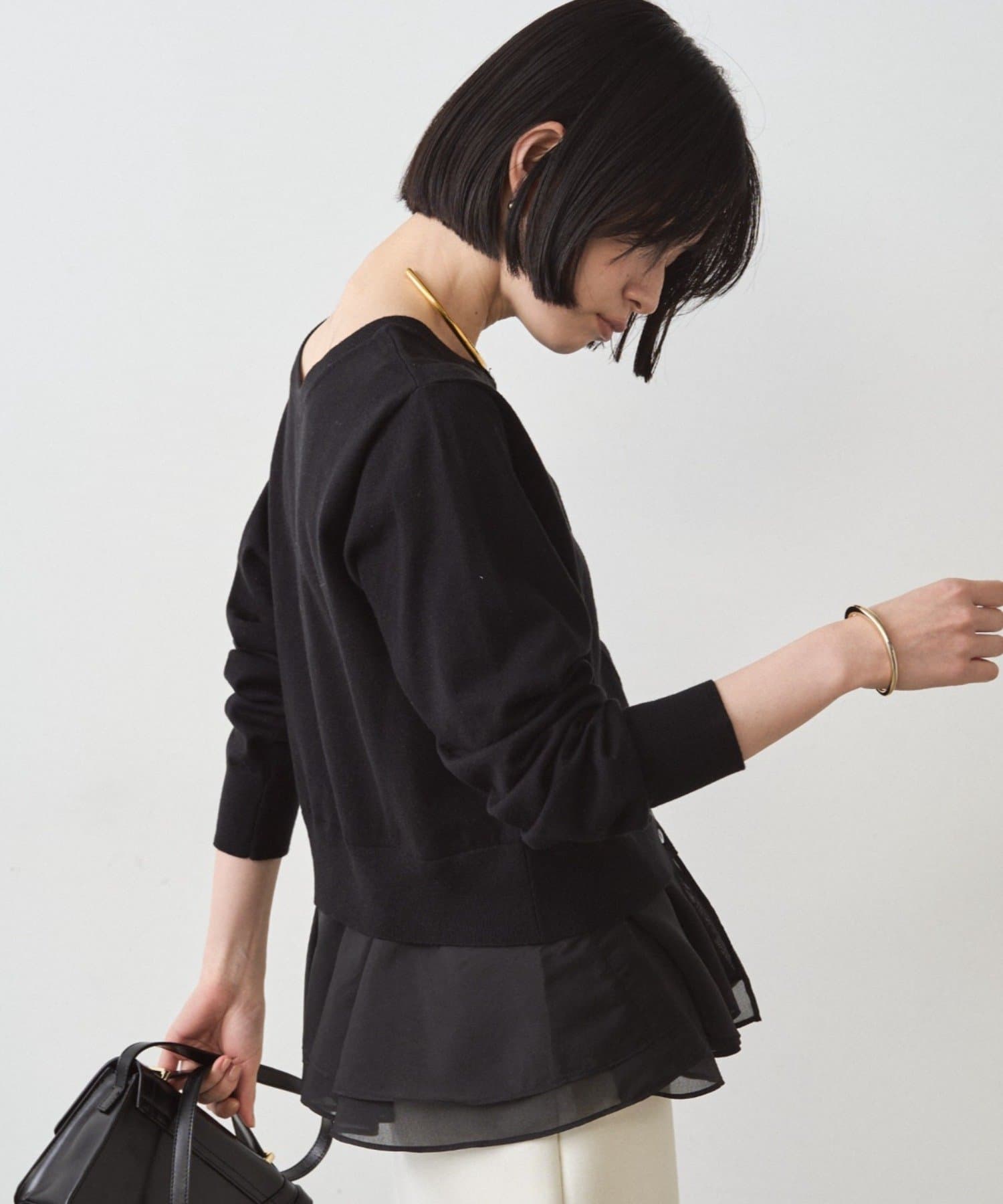 シンプルなニットカーディガンに、ふんわりと広がるペプラムをあしらった、他にはないデザイン。