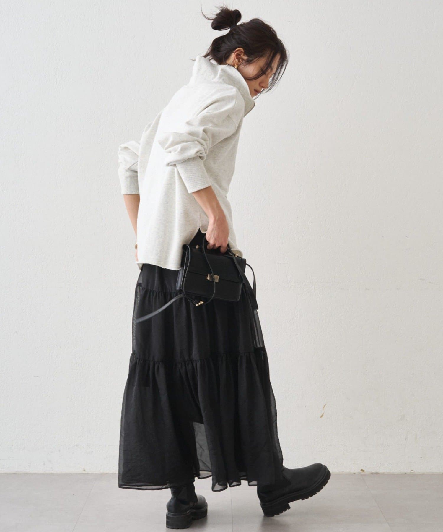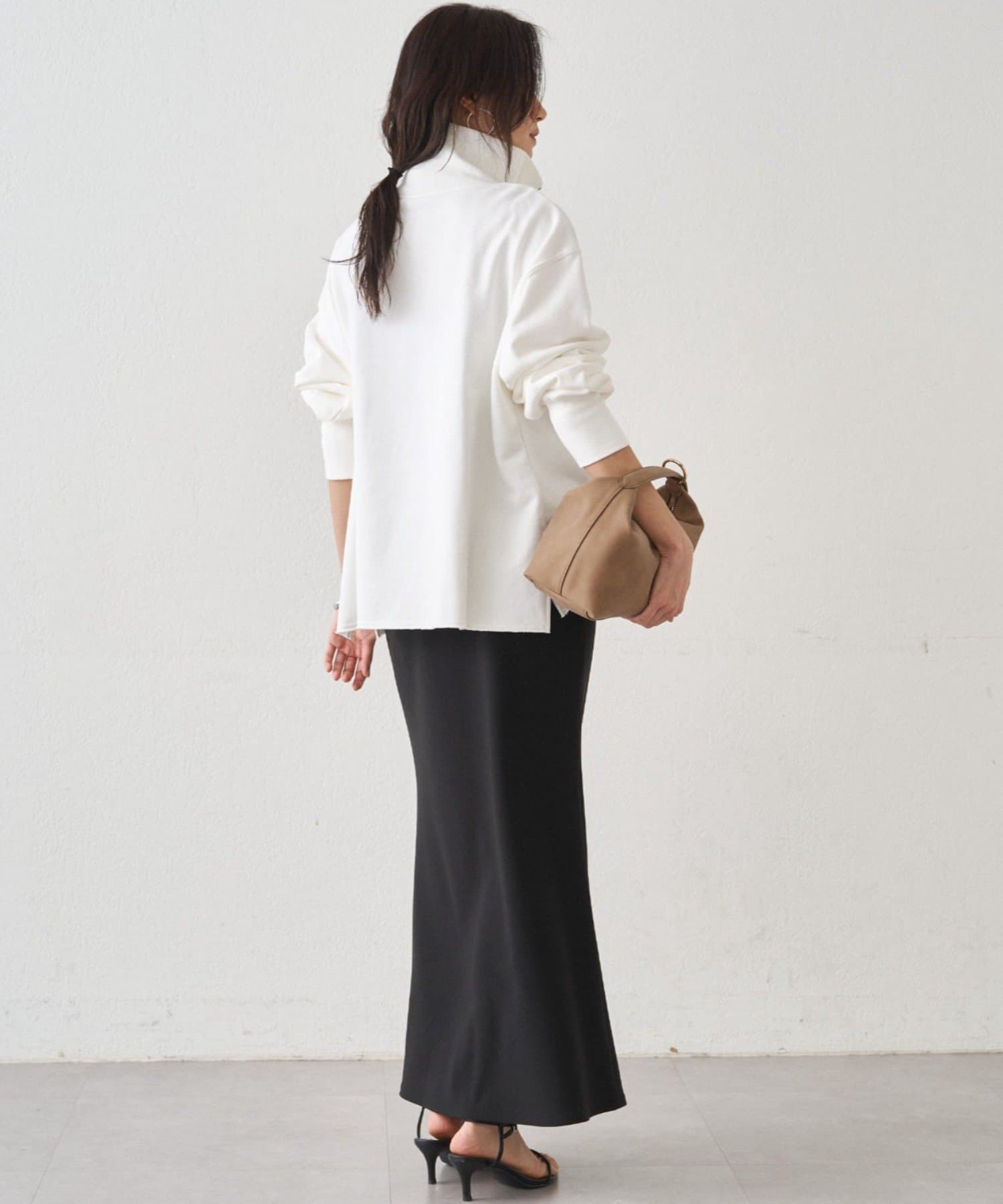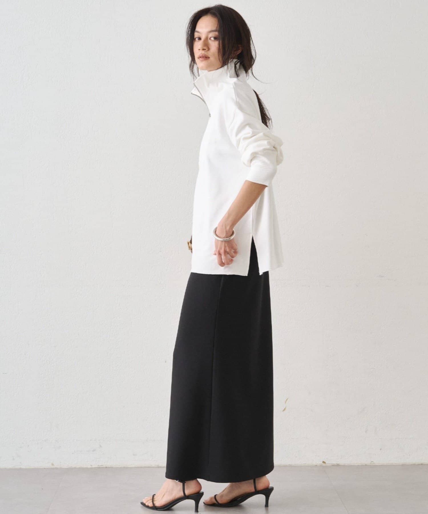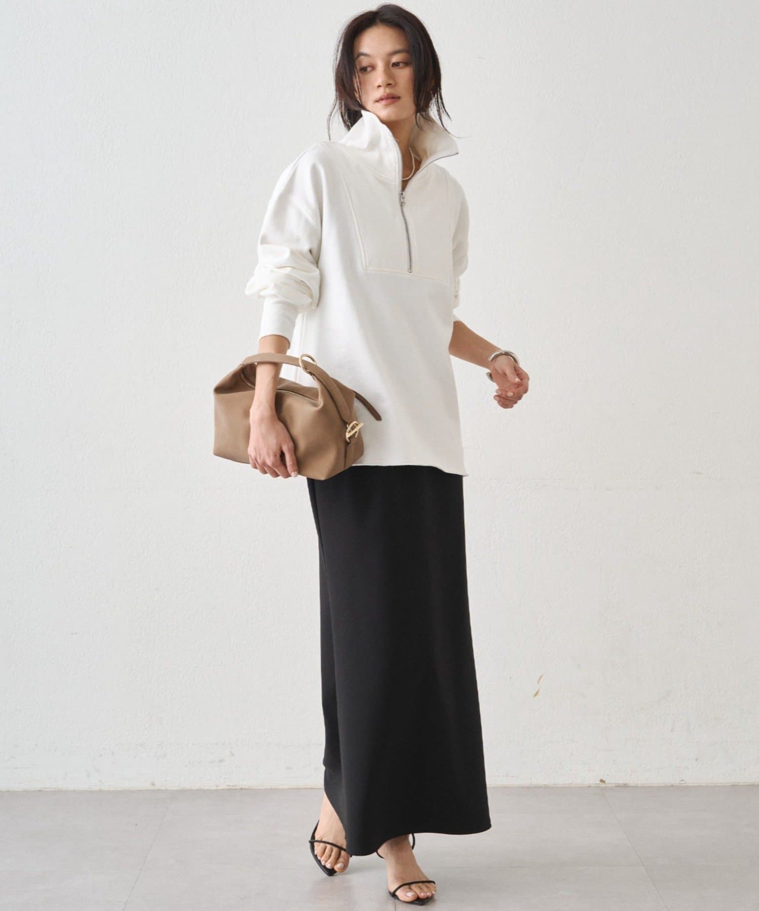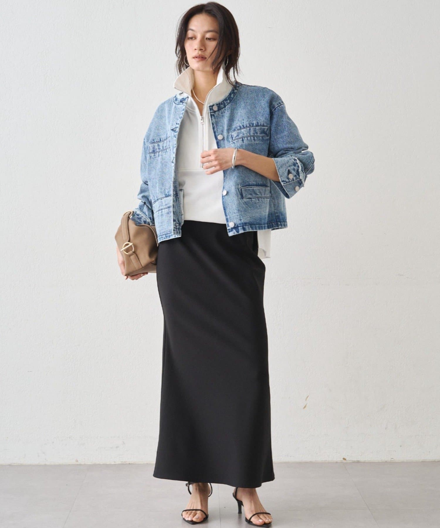 スポーティなアイテムなので、ツヤ感のある素材やタイトシルエットのボトムを合わせると女性らしくスタイリングして頂けます。