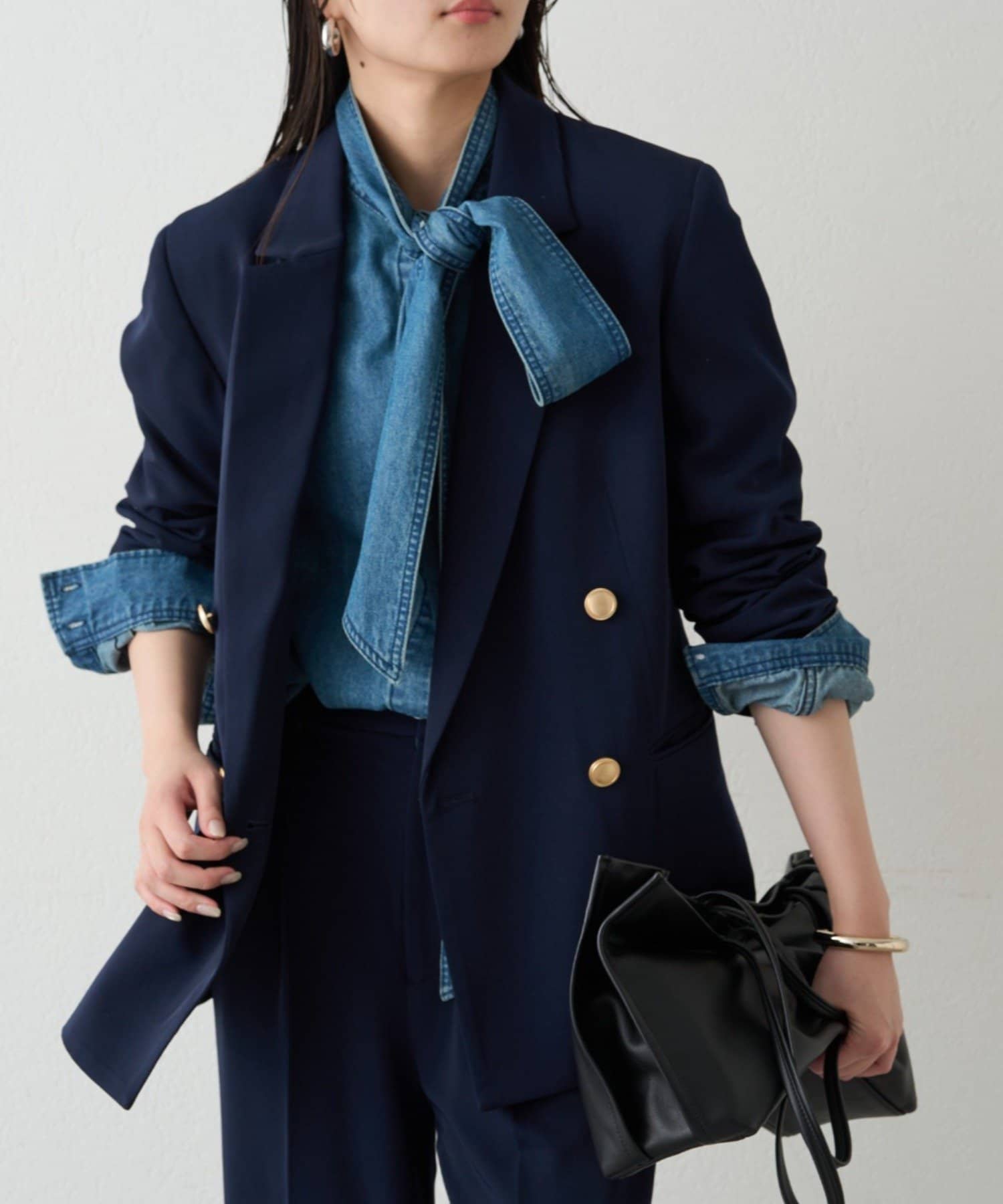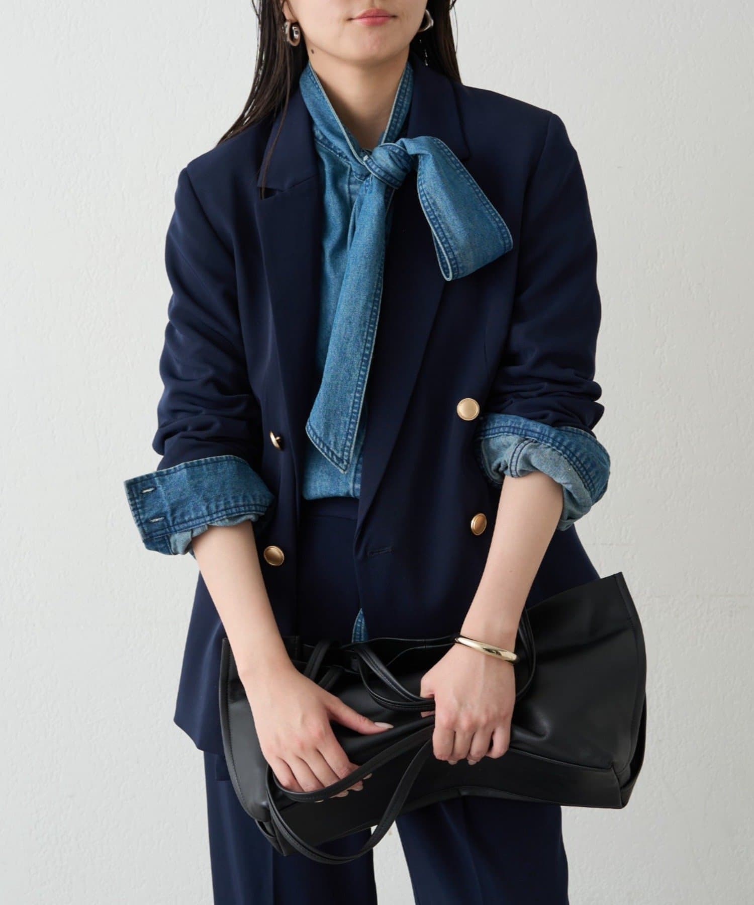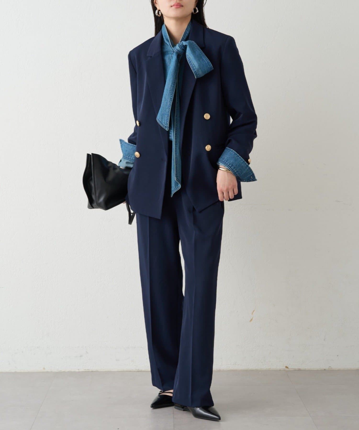 カチッとしてハンサムな印象なので、レースやオーガンジーのような女性らしいアイテムで合わせたミックススタイルがおすすめです。