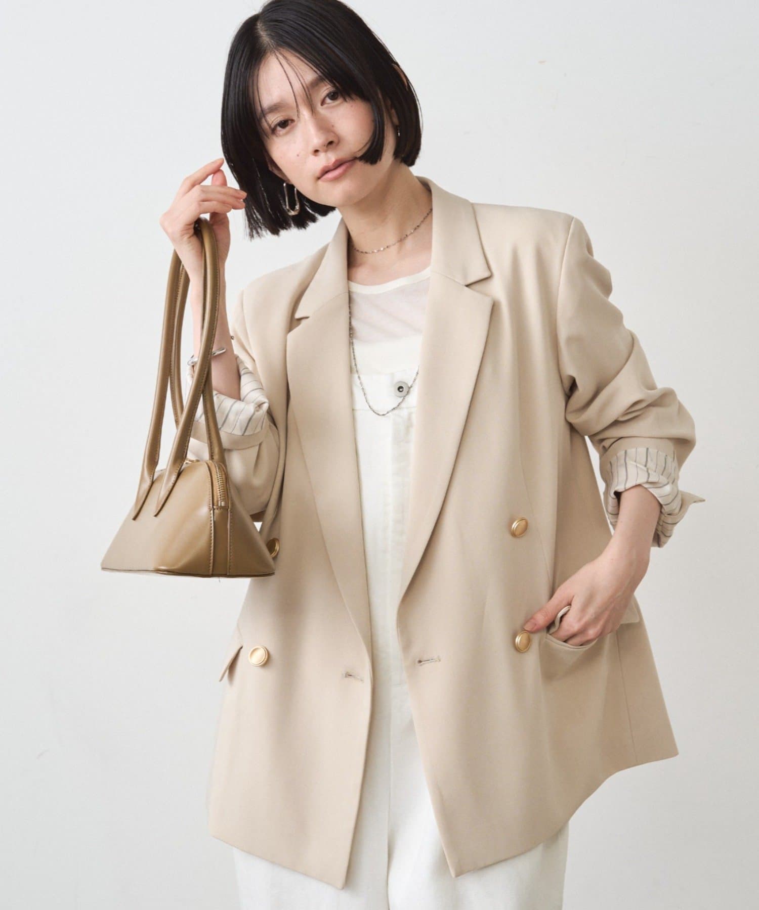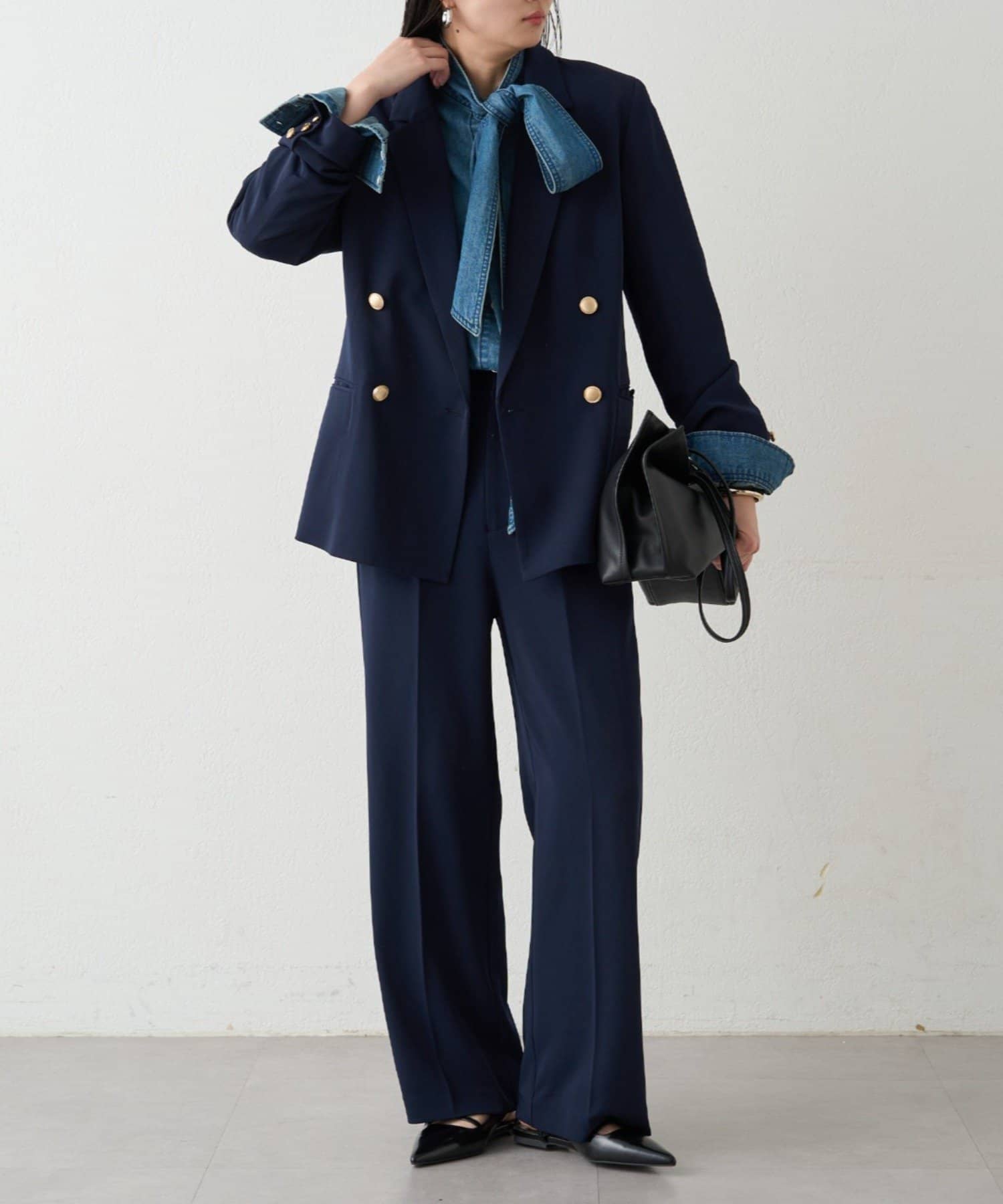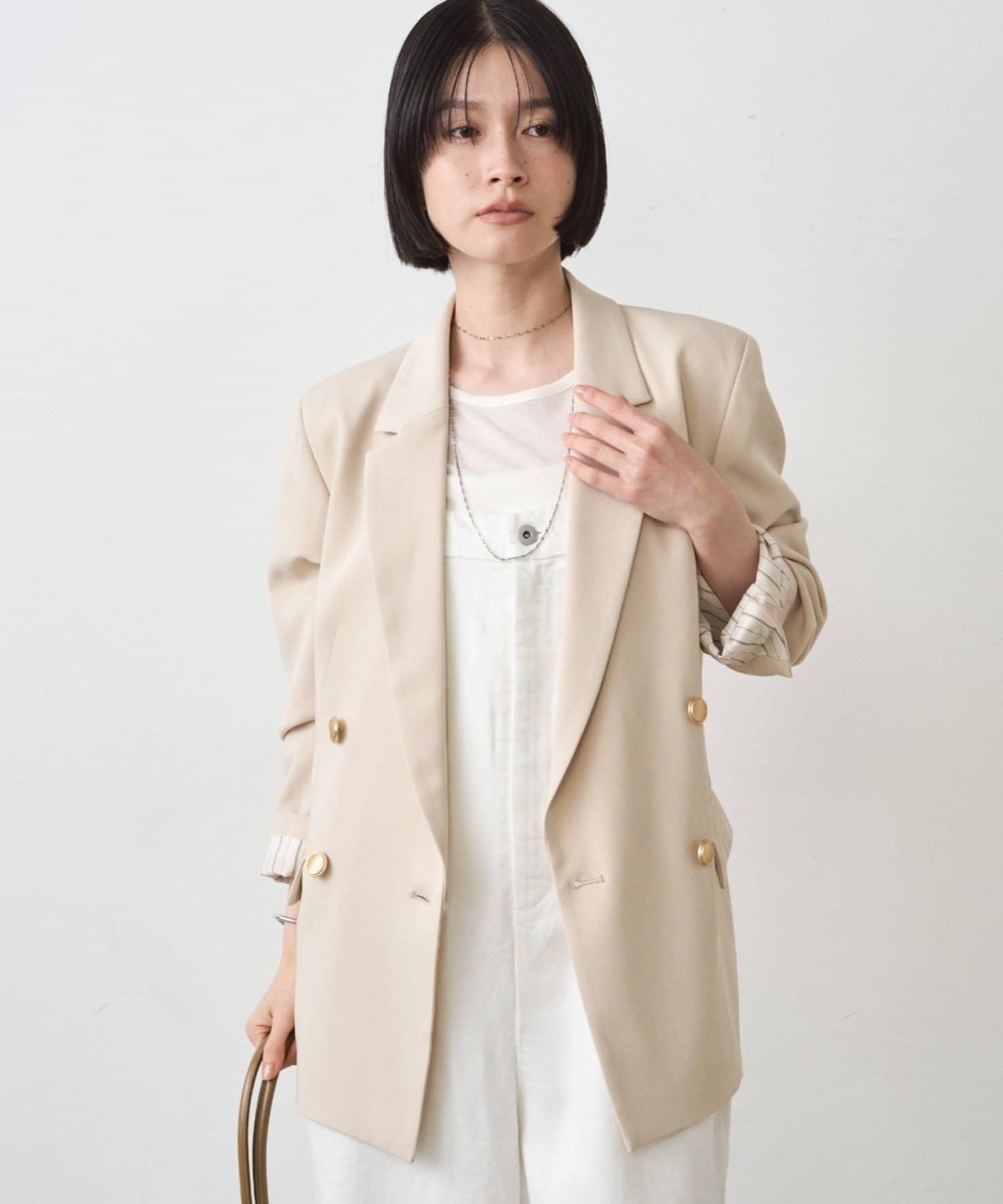 カチッとしてハンサムな印象なので、レースやオーガンジーのような女性らしいアイテムで合わせたミックススタイルがおすすめです。