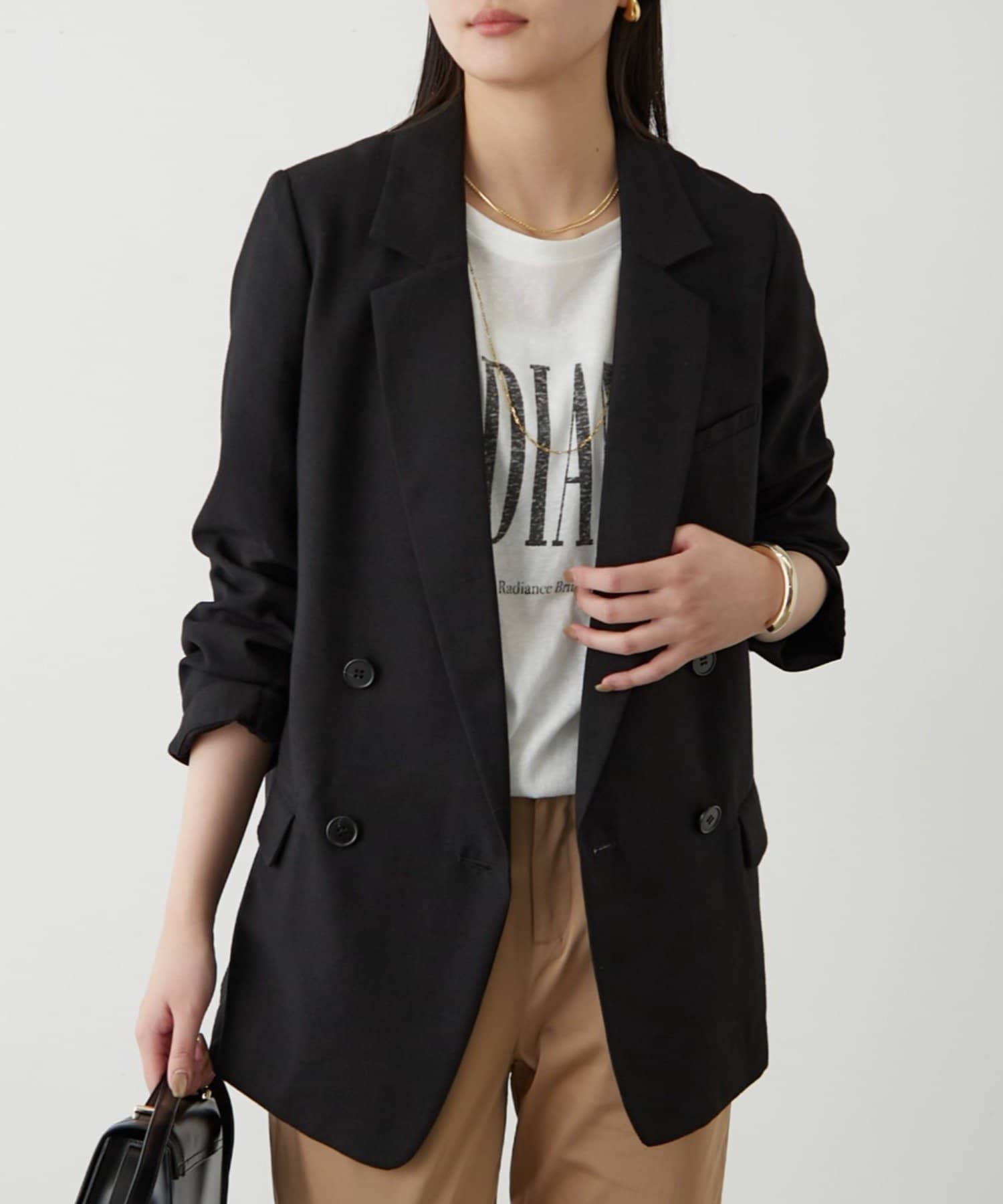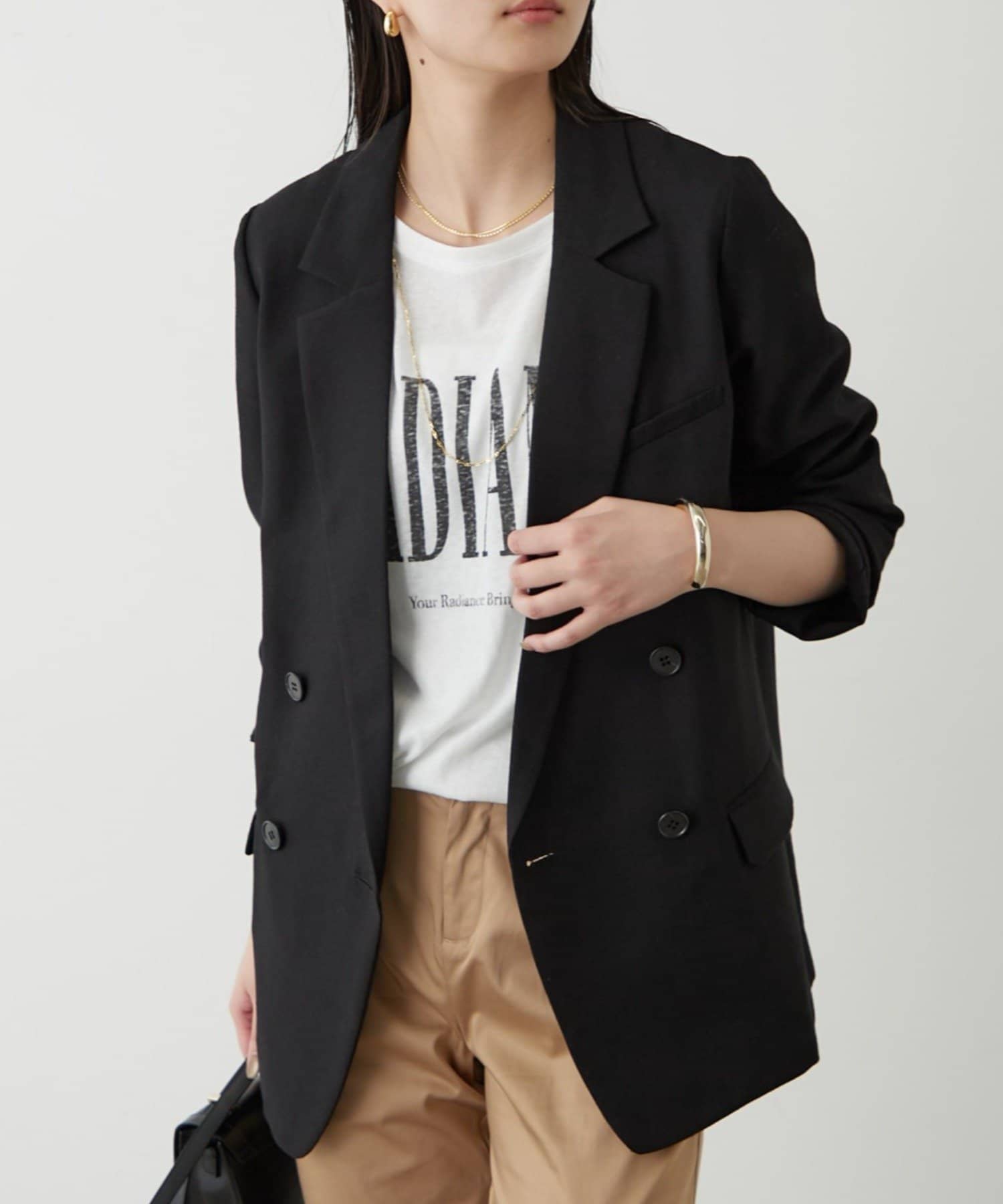Tシャツやタンクトップの上からさらっと羽織ったり、ブラウスやニットと合わせてオフィススタイルにも。