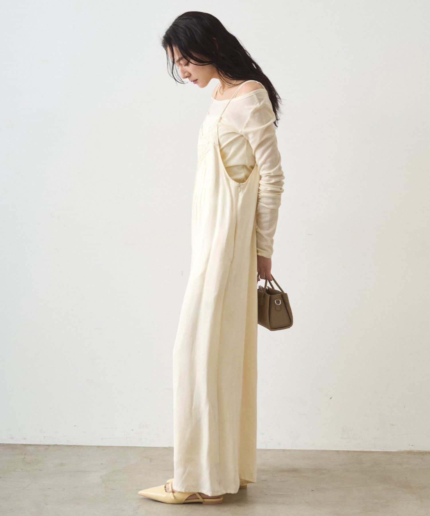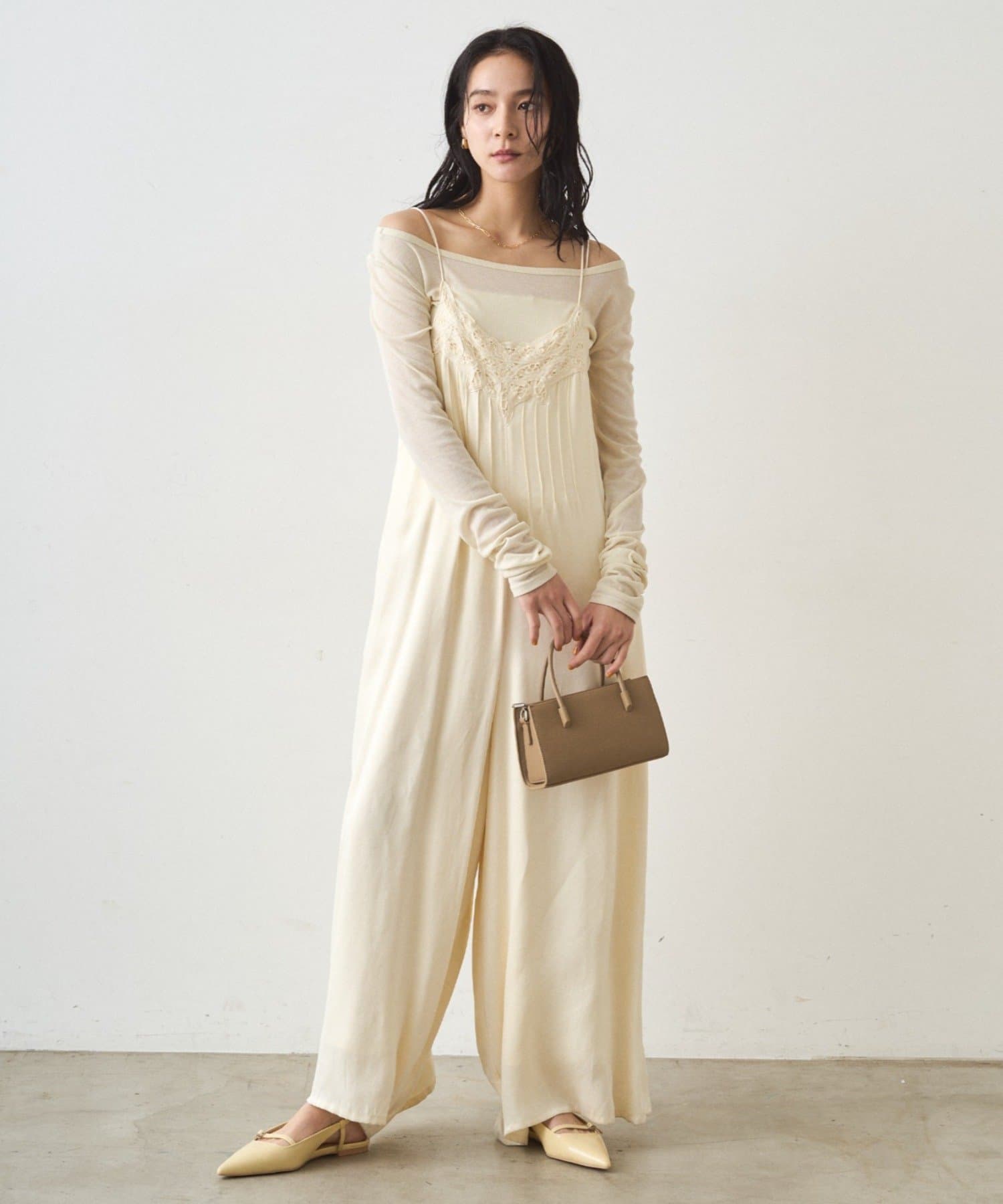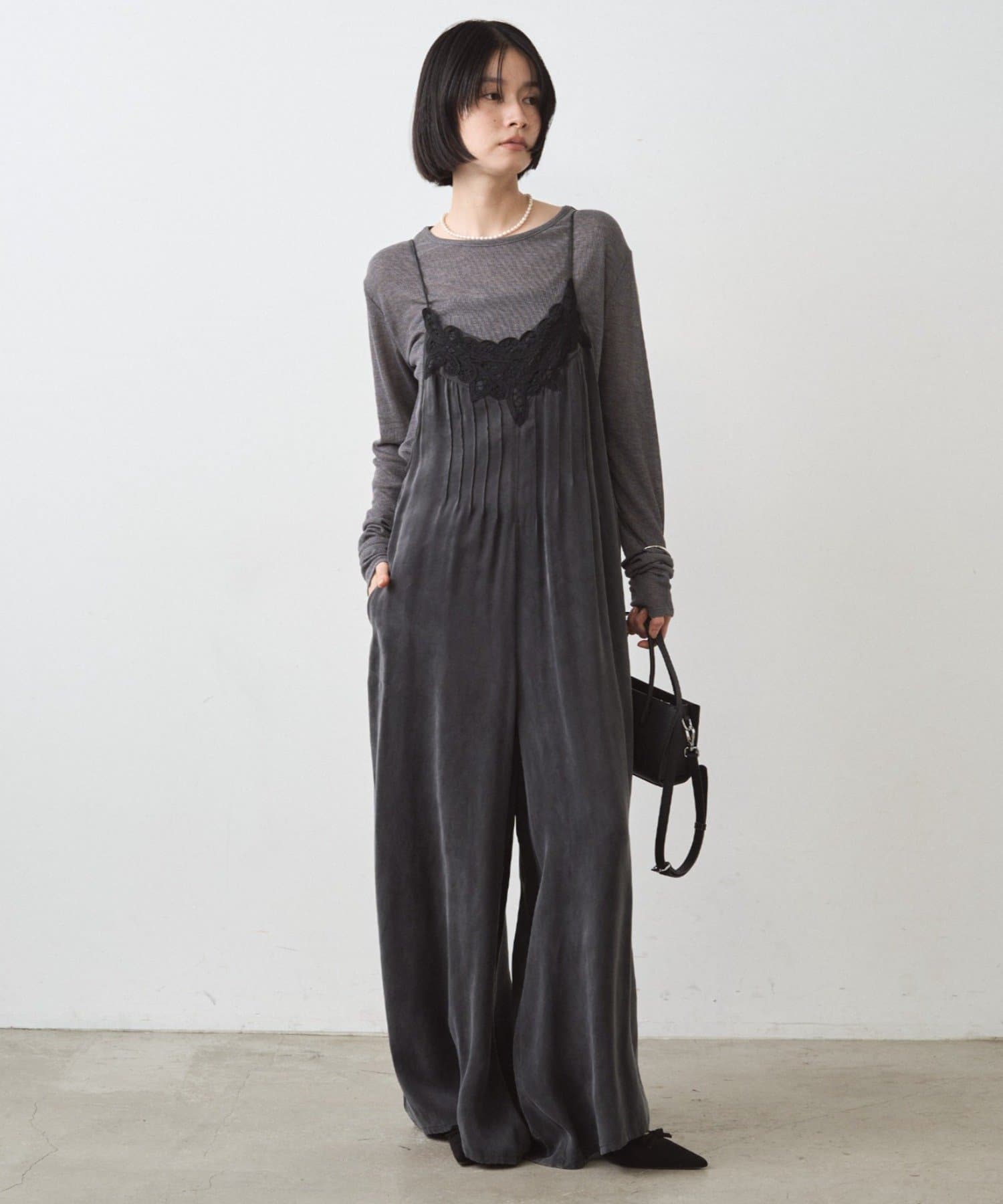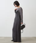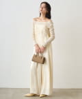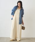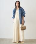 胸幅をタイトにし、パンツ部分はワイドにすることで、上半身を華奢に見せてくれます。