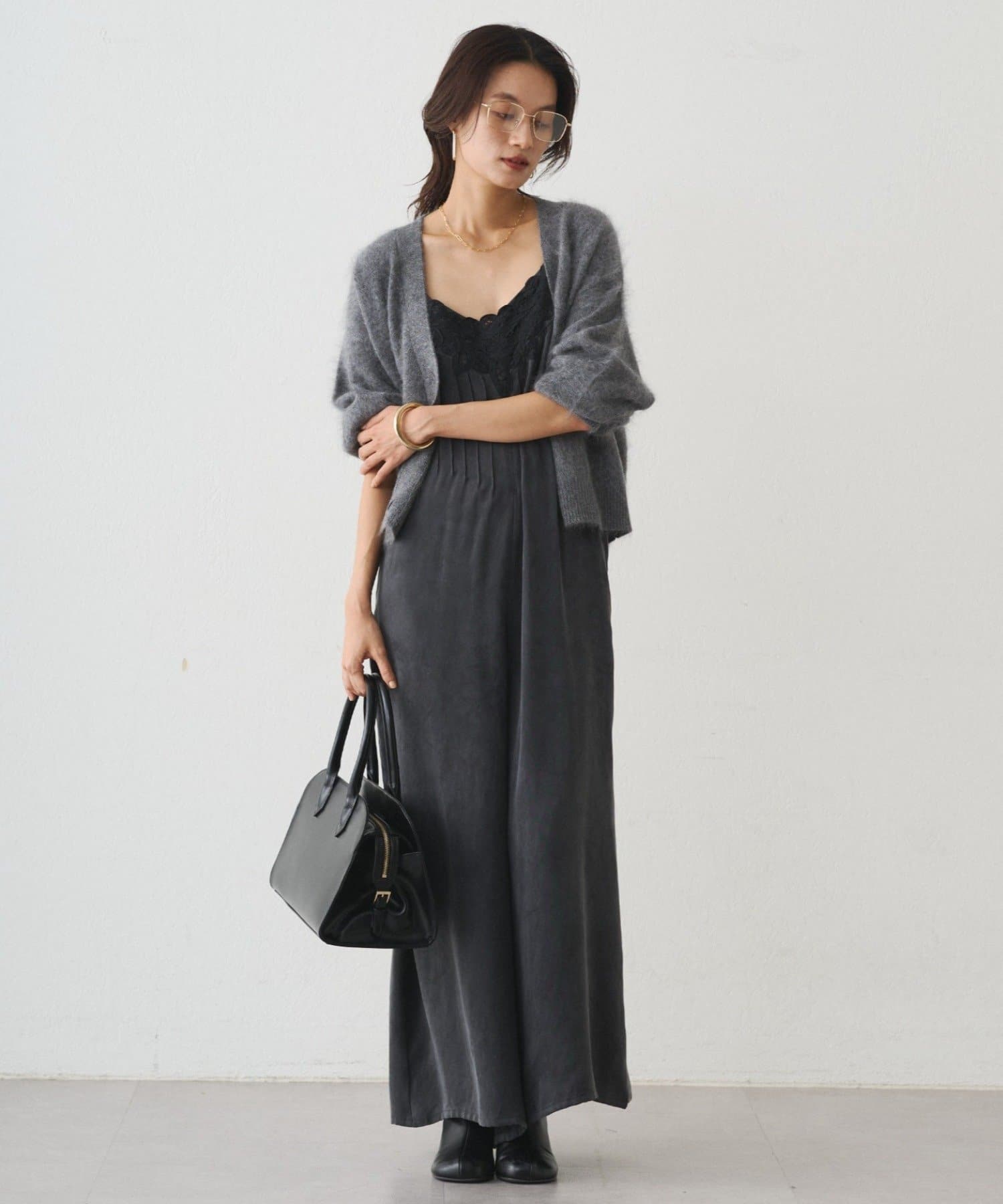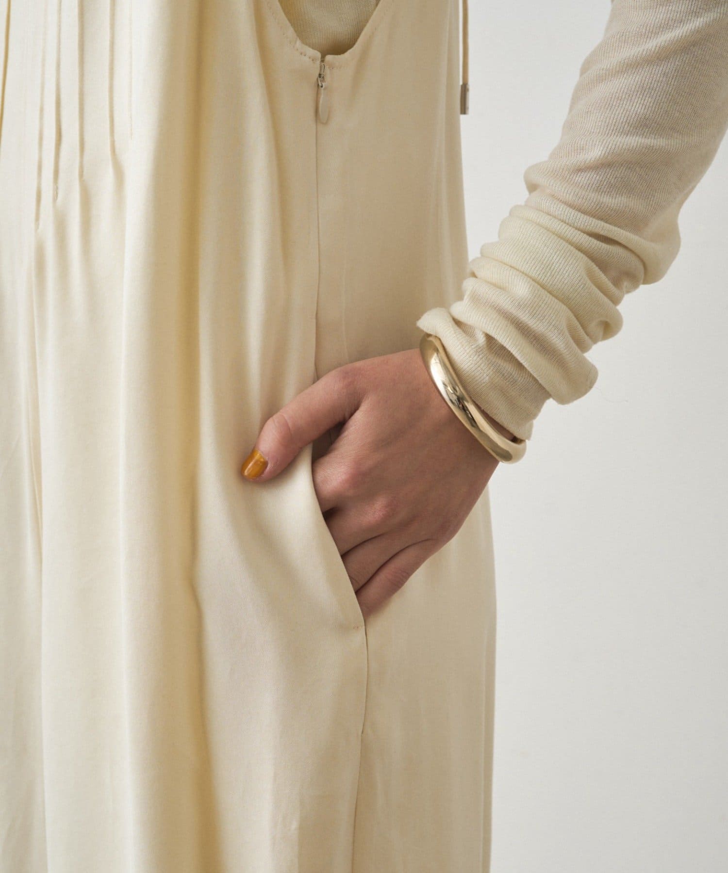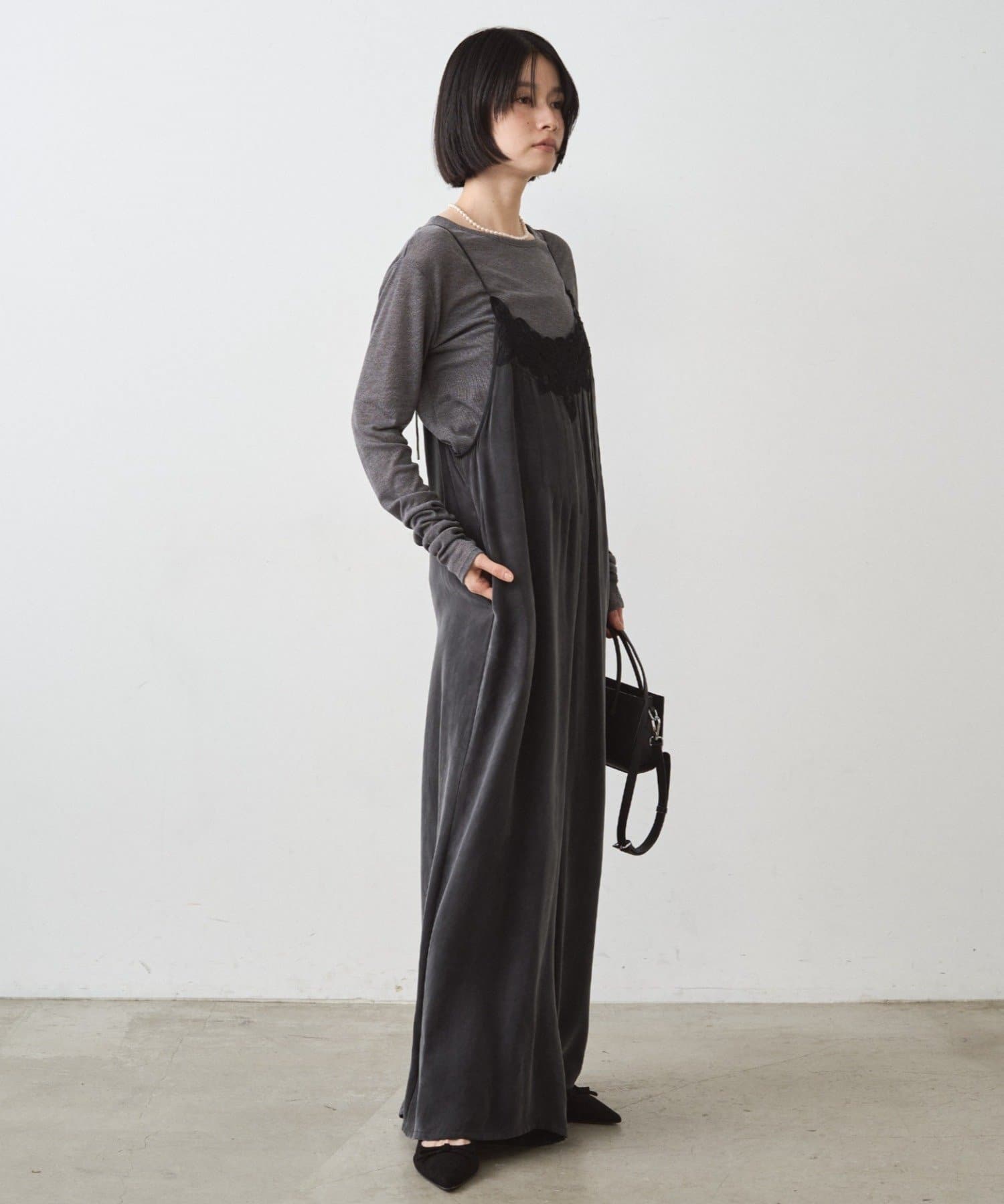 胸幅をタイトにし、パンツ部分はワイドにすることで、上半身を華奢に見せてくれます。