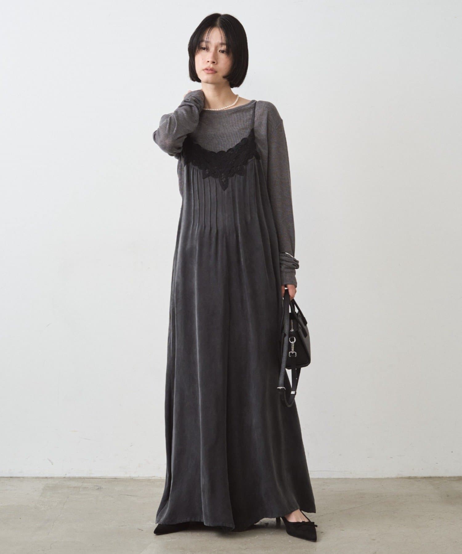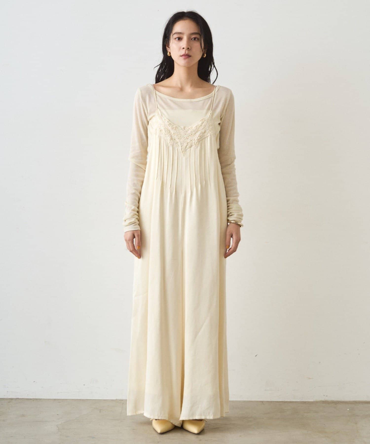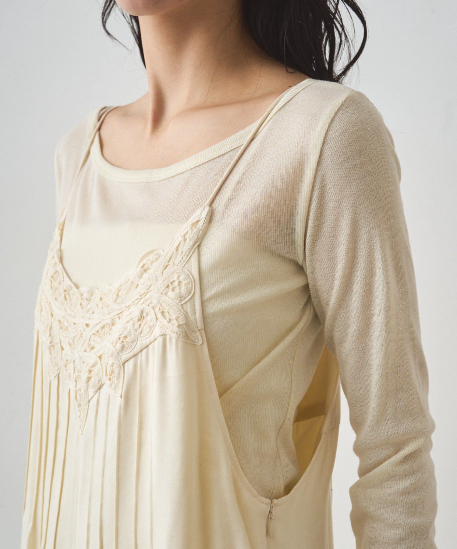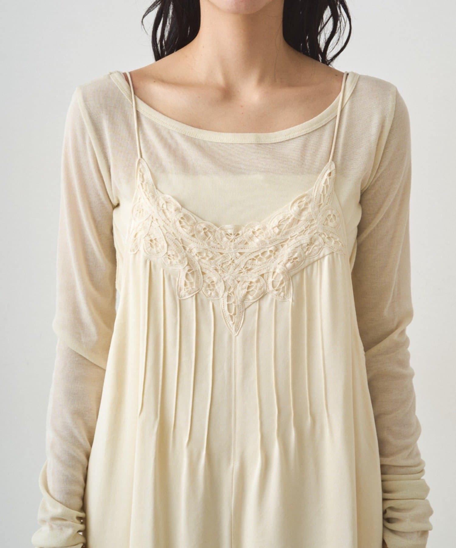 胸元のバテンレースとピンタックがデザインポイント。