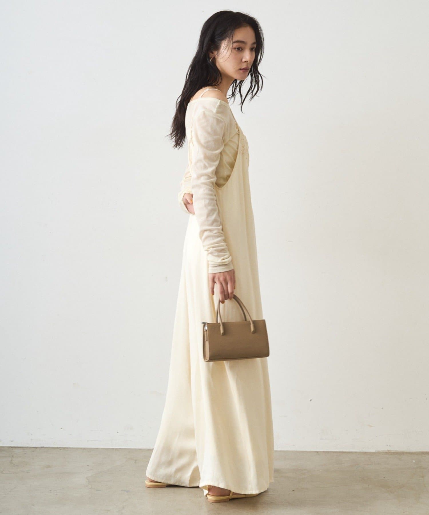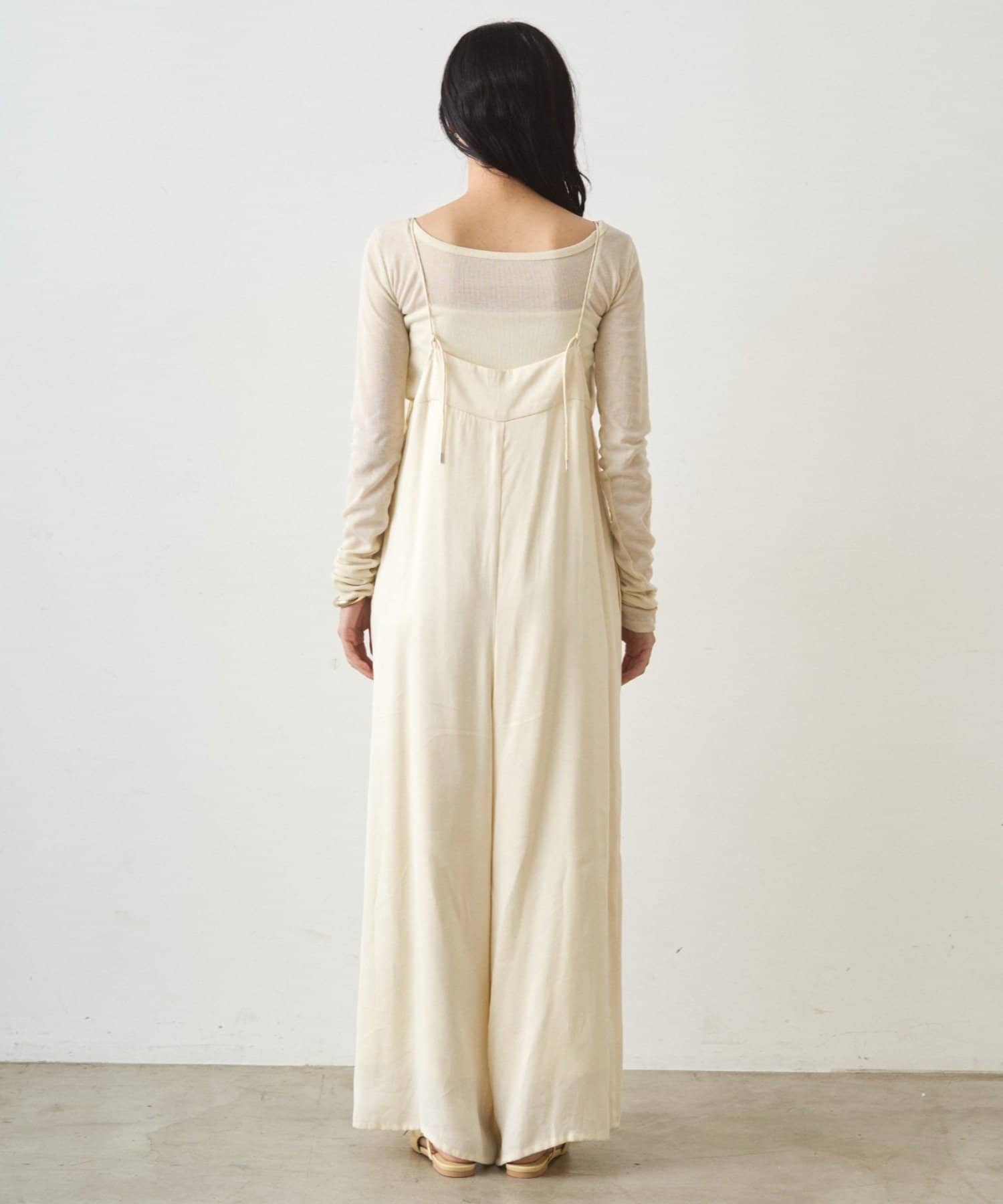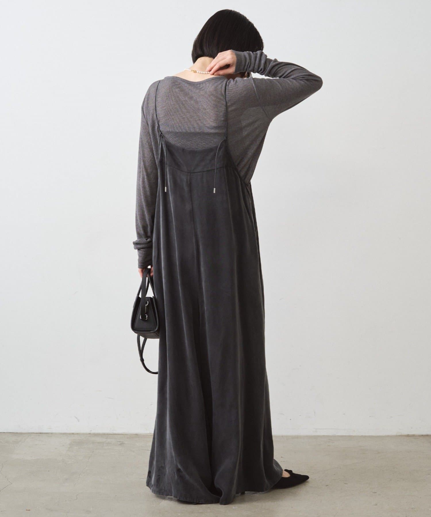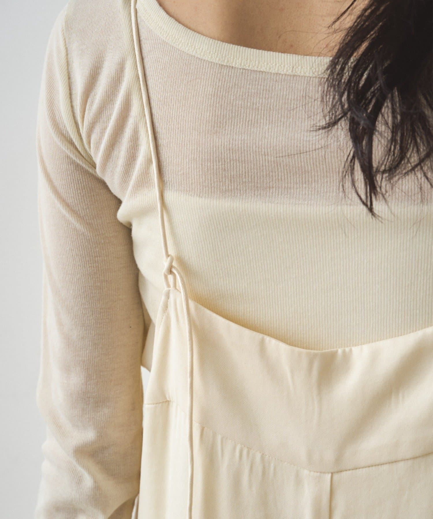 細い肩ひもで華奢な印象に。後ろで縛って長さ調節が可能です。