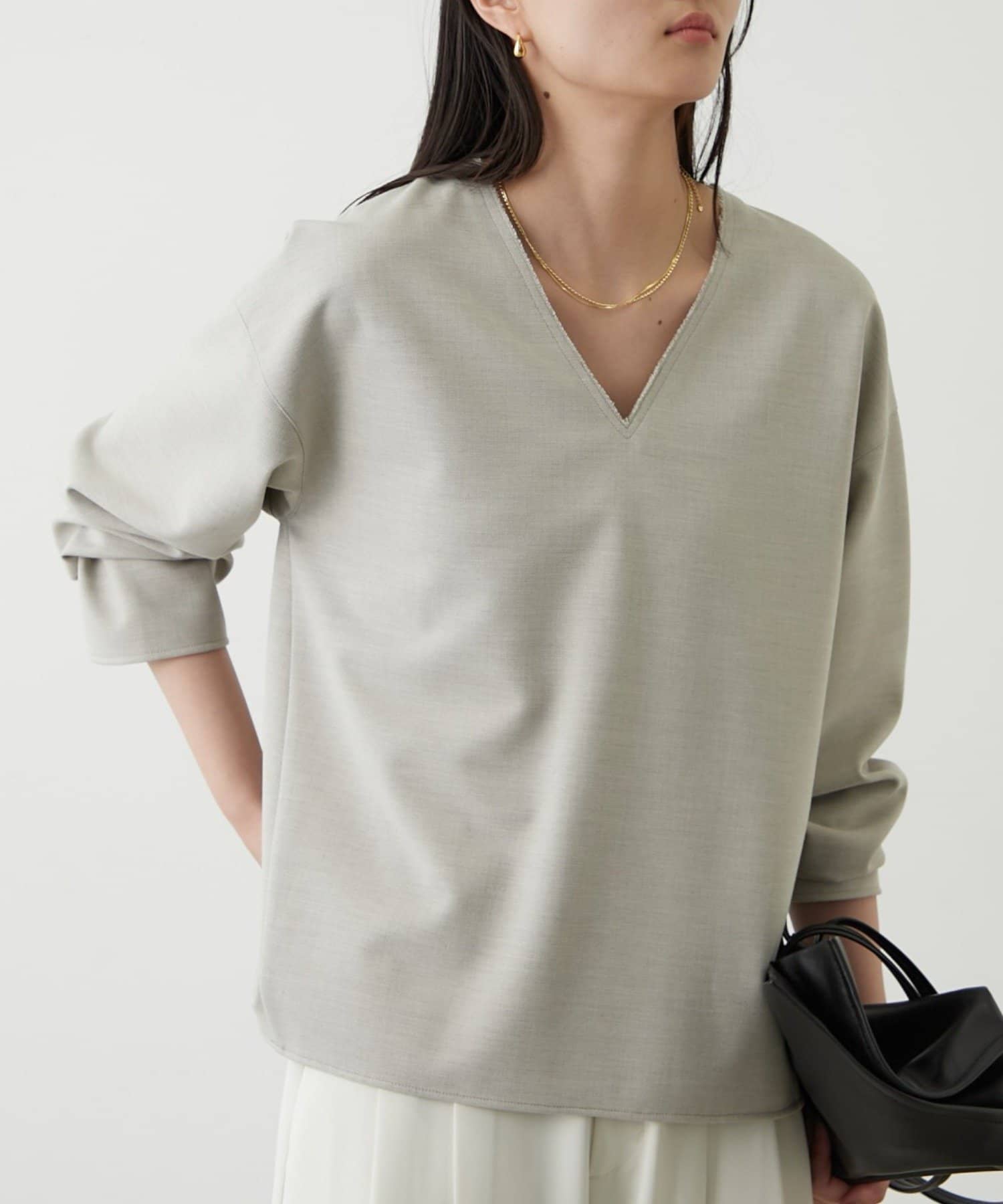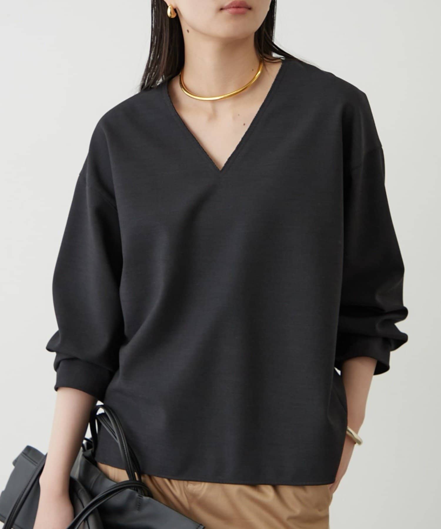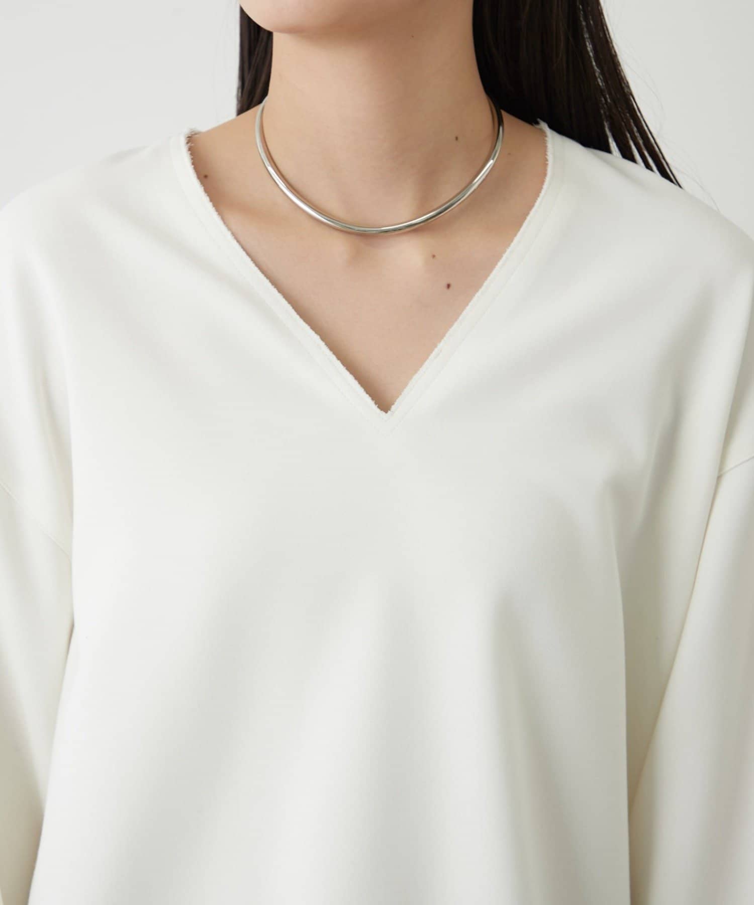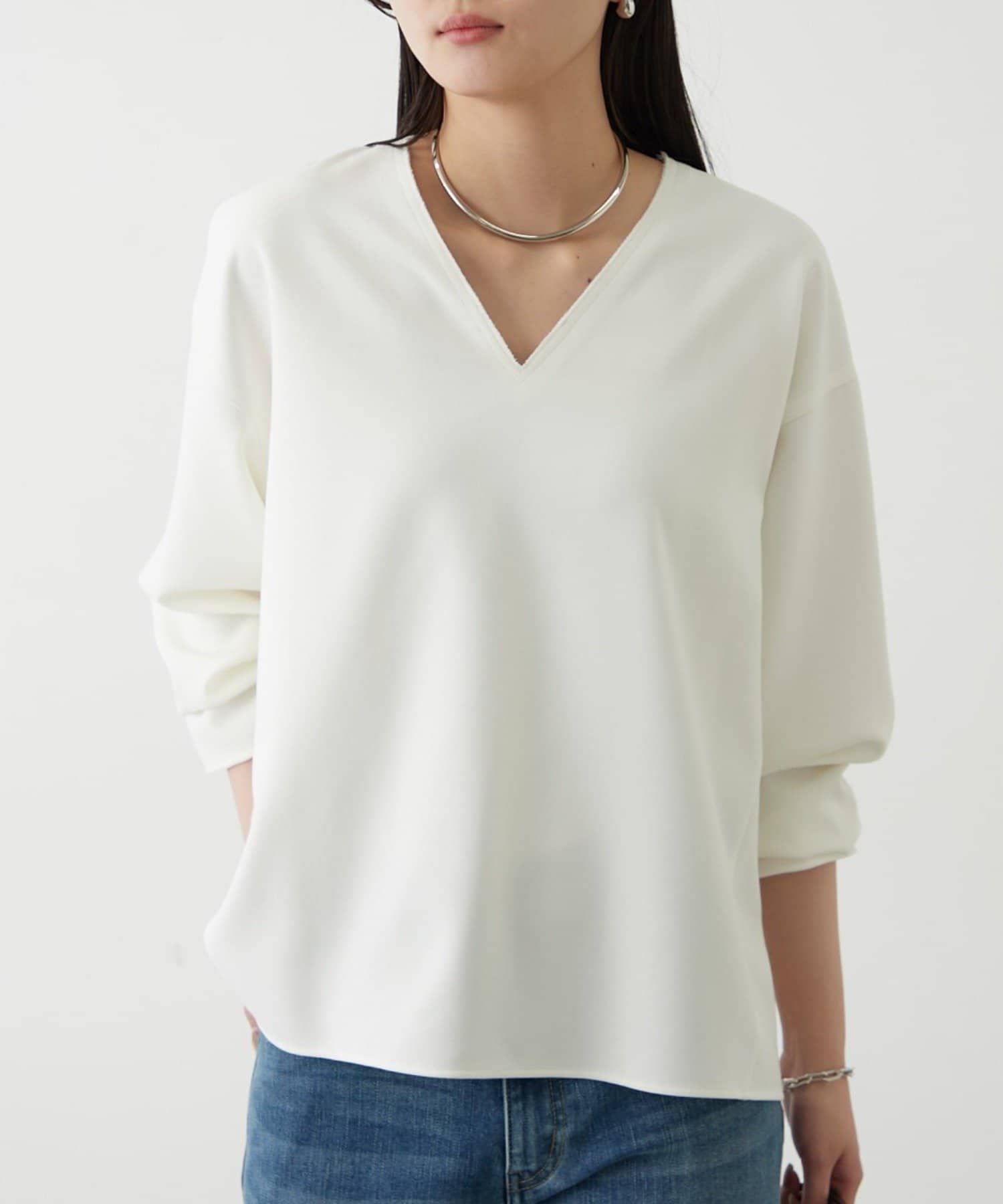 デコルテを美しく見せる、少し深めに設計したVネックデザイン。