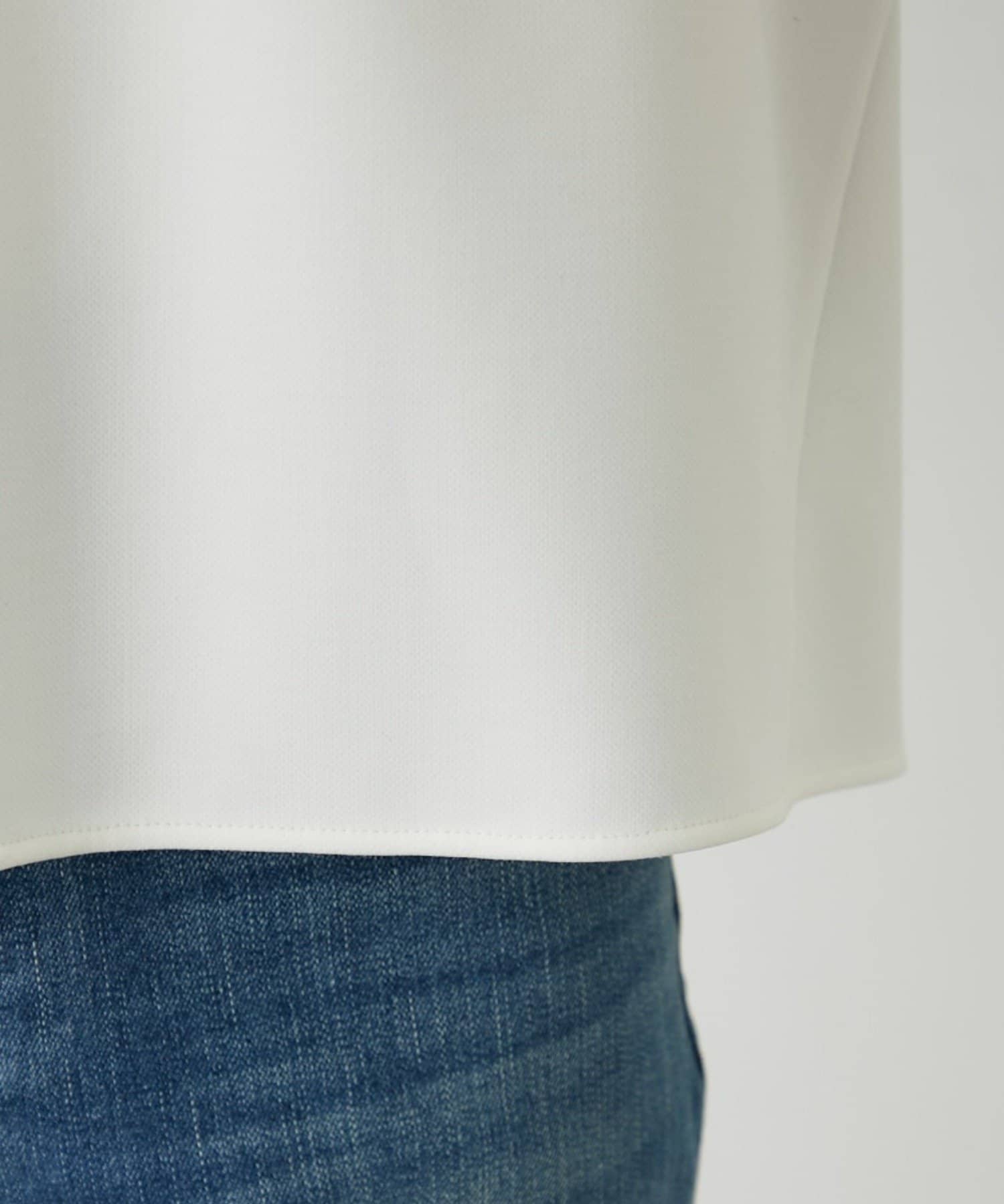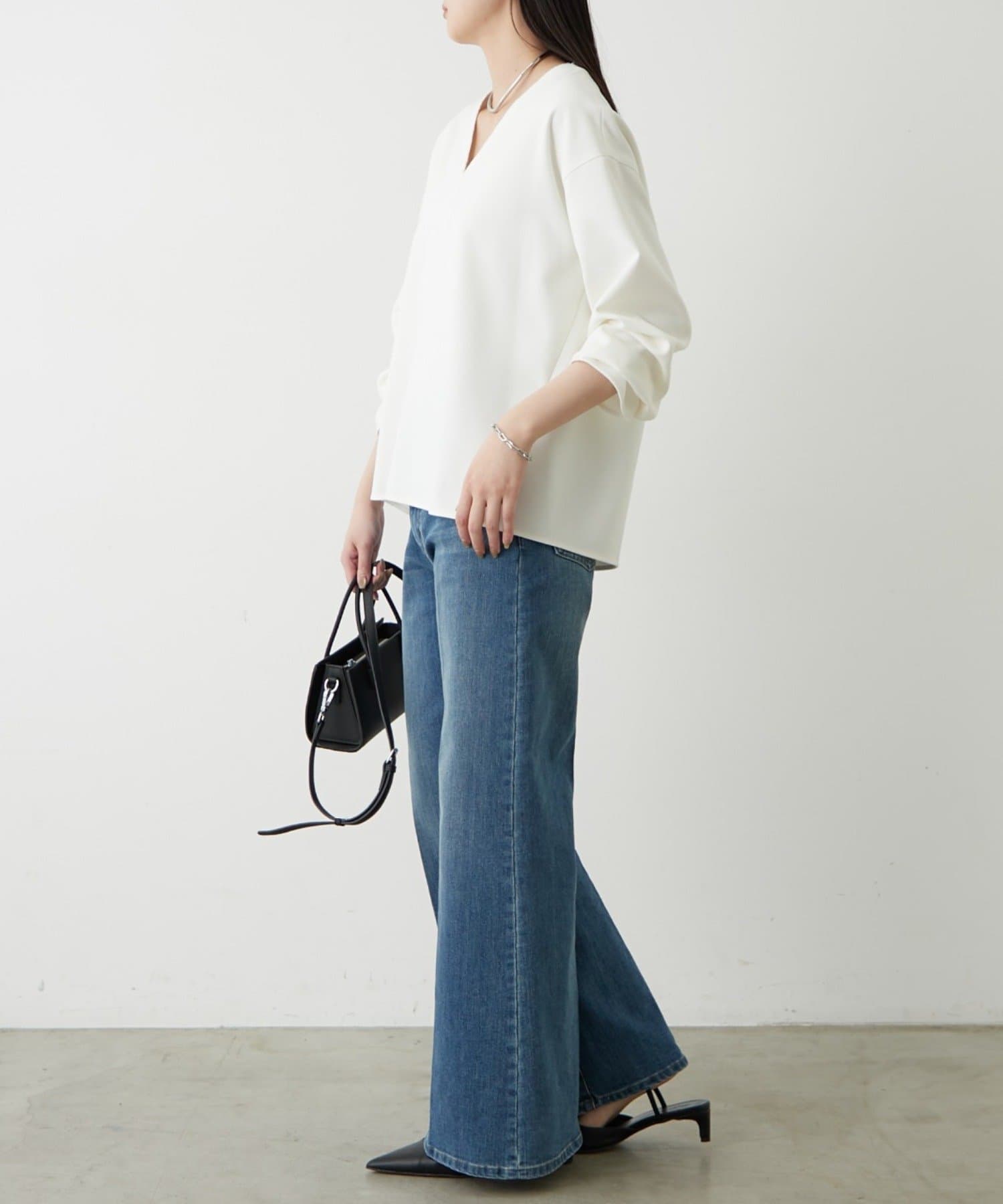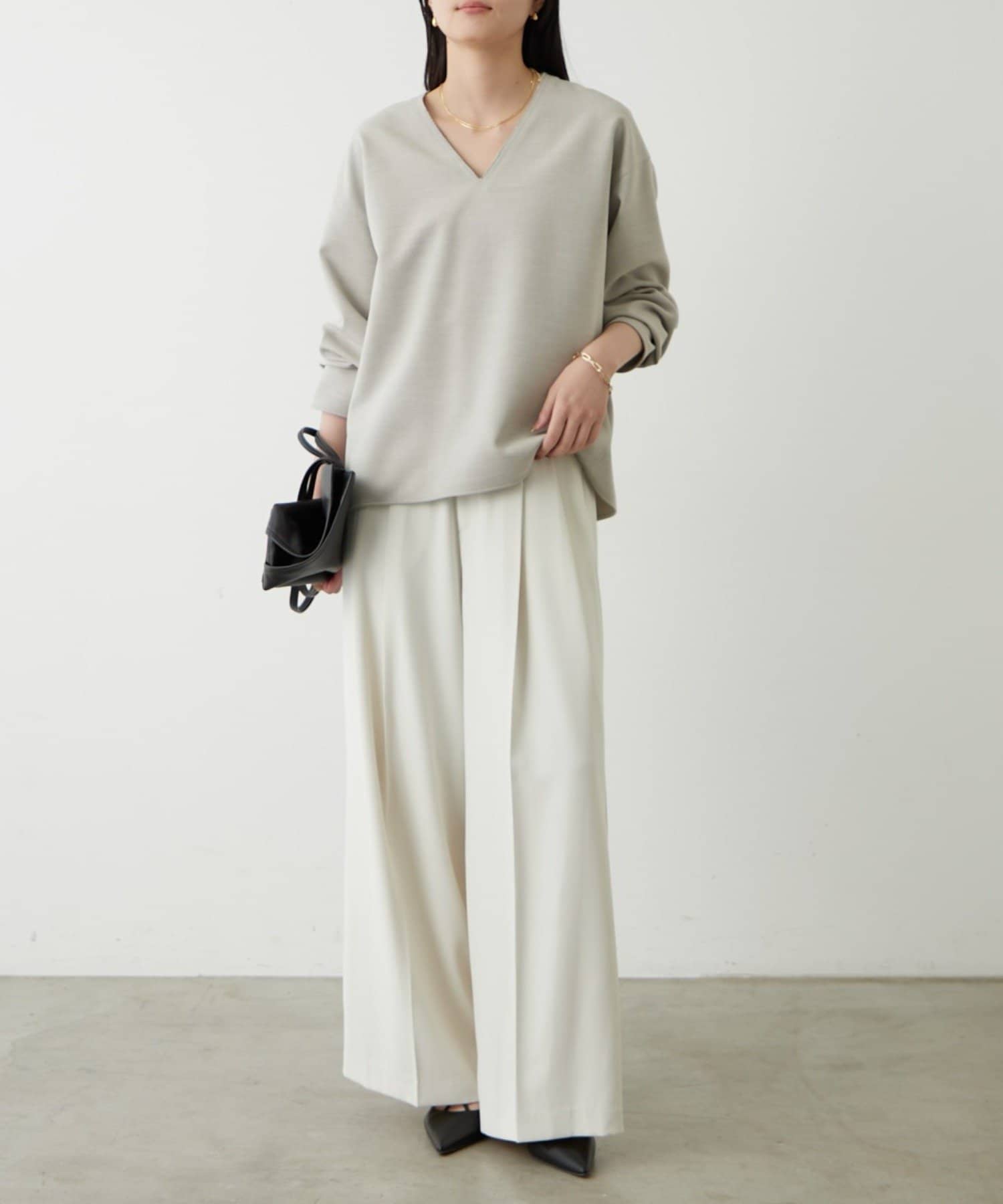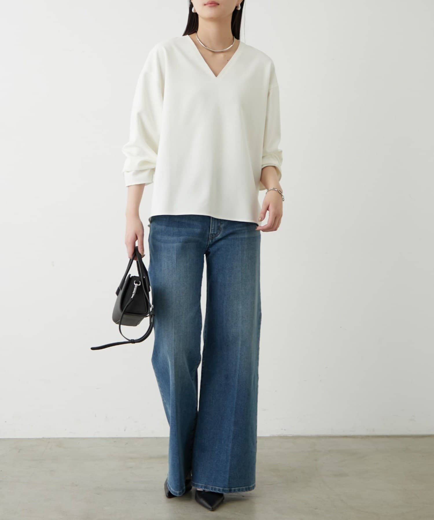 デコルテを美しく見せる、少し深めに設計したVネックデザイン。