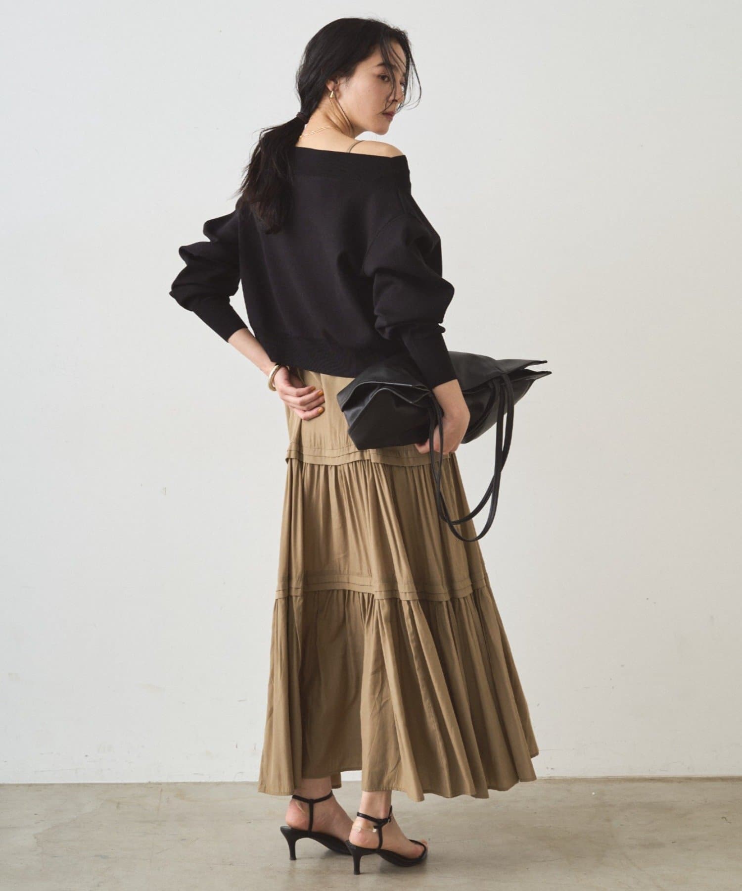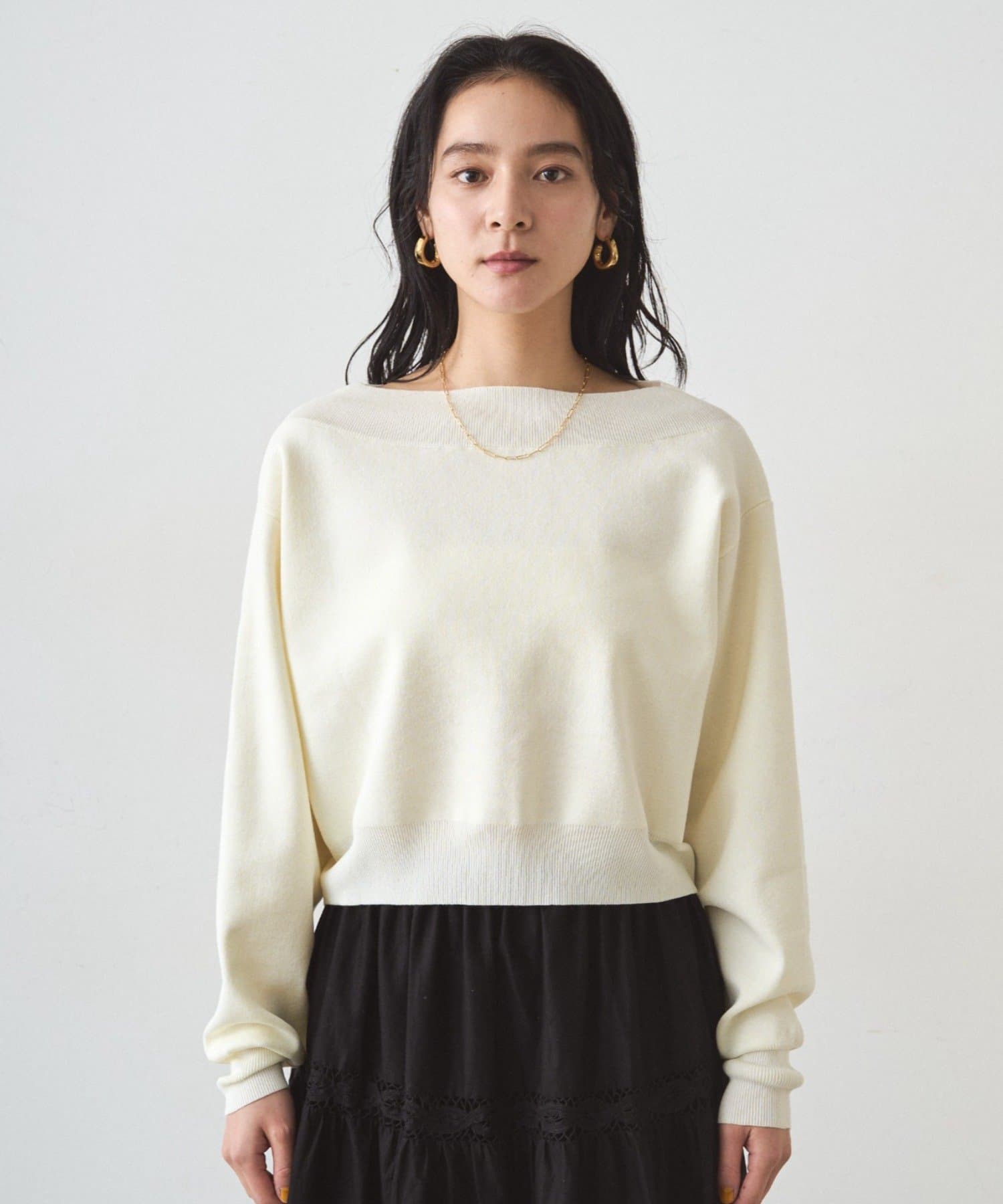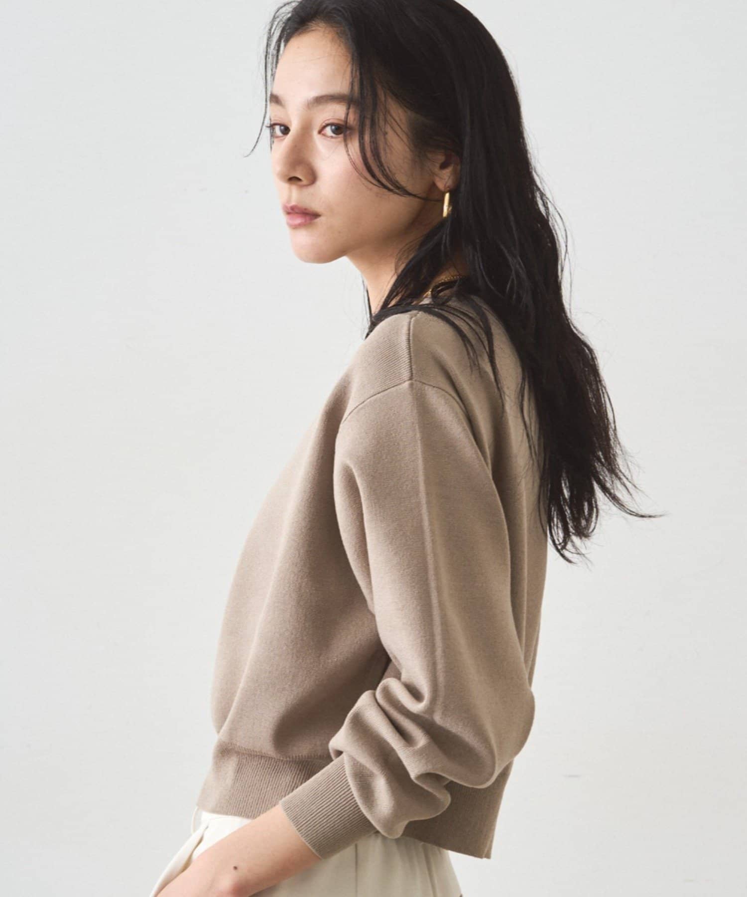 ゆったりとした身幅と、少し長めの袖丈が、こなれ感を演出。