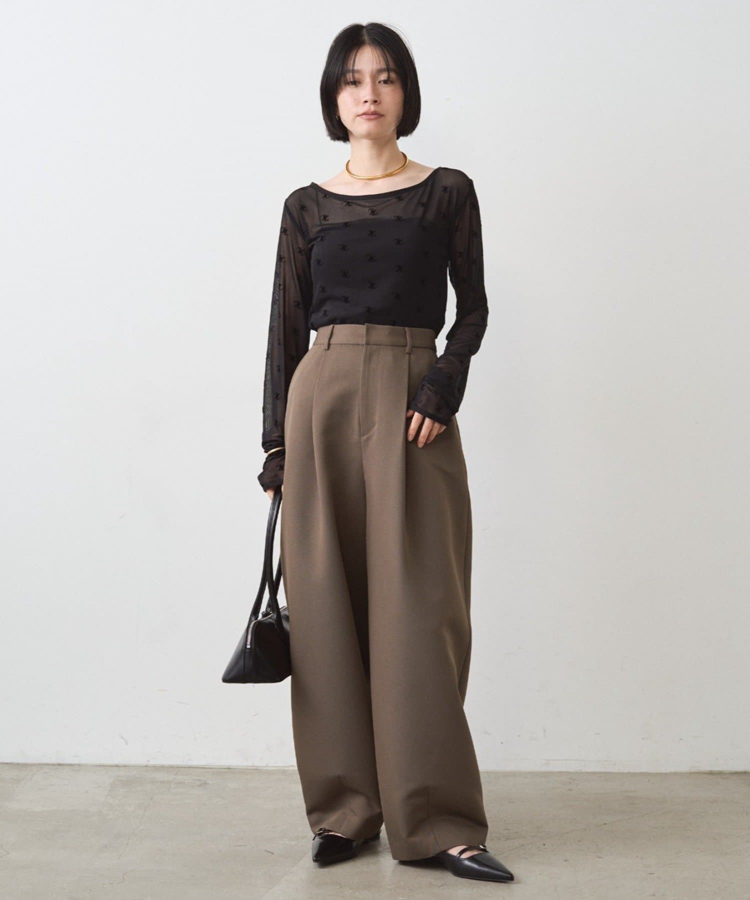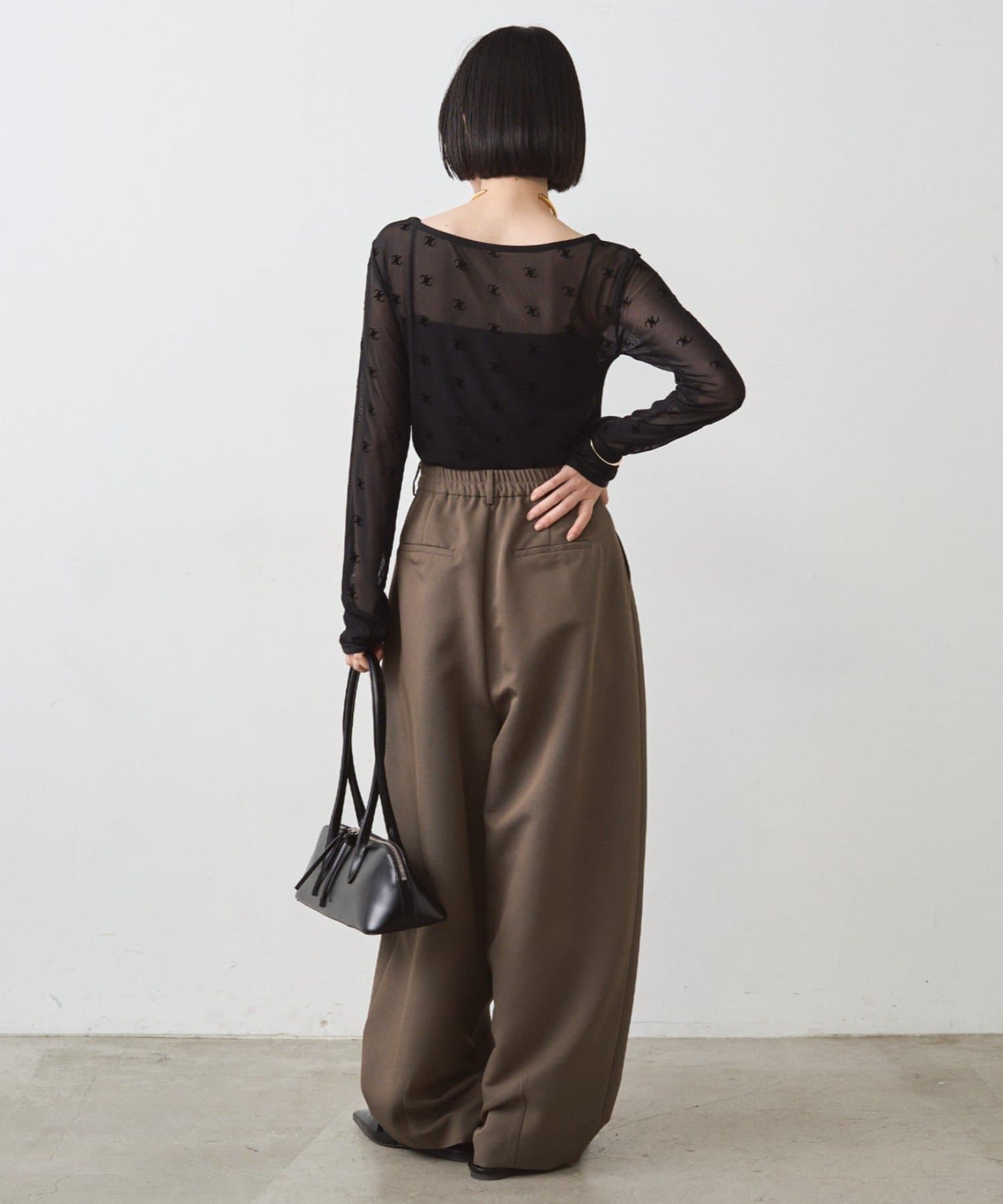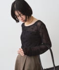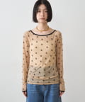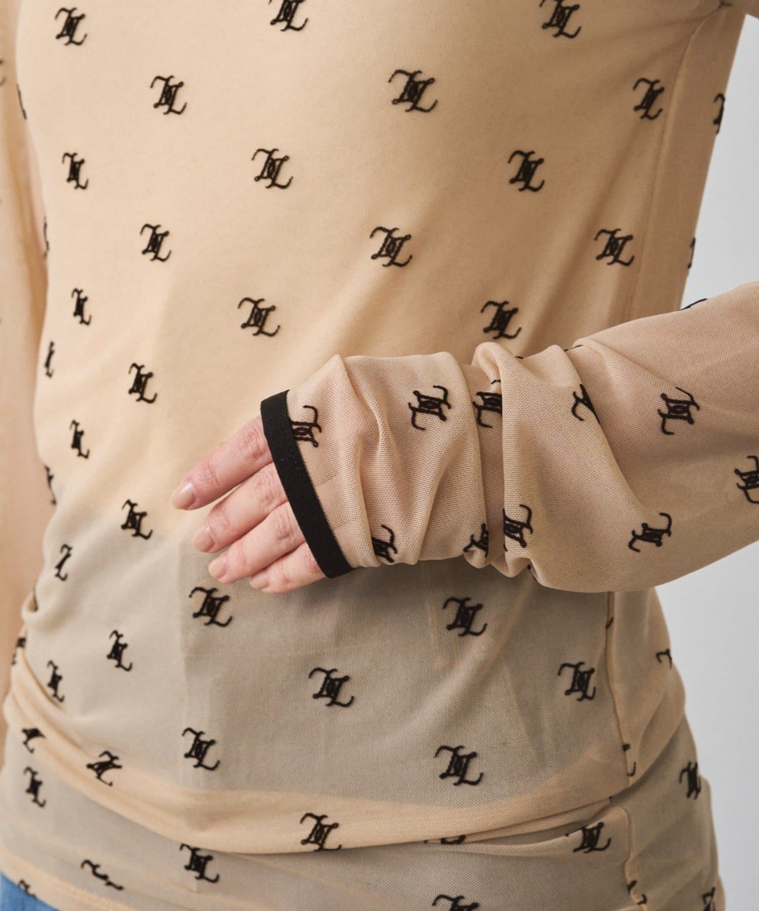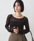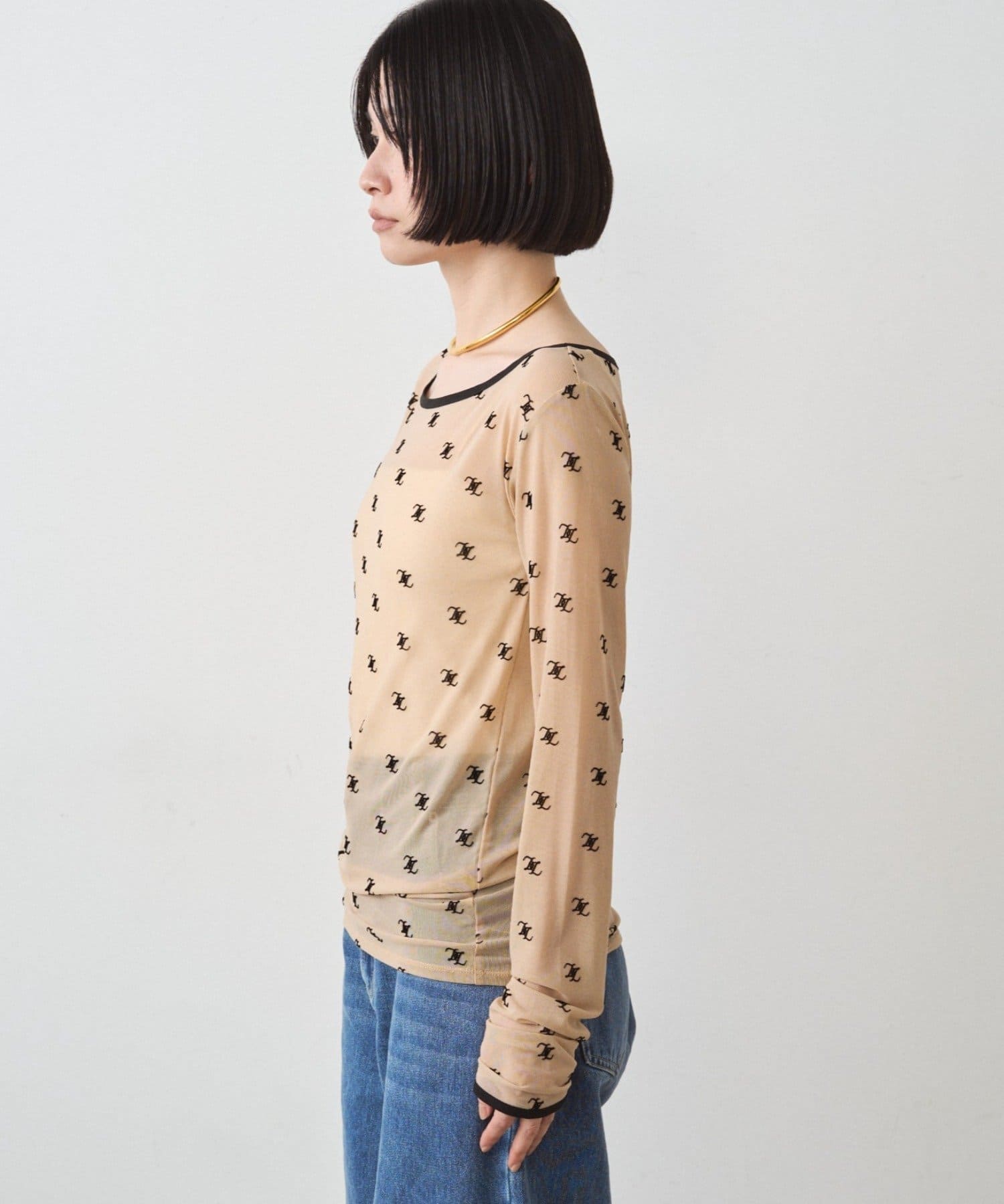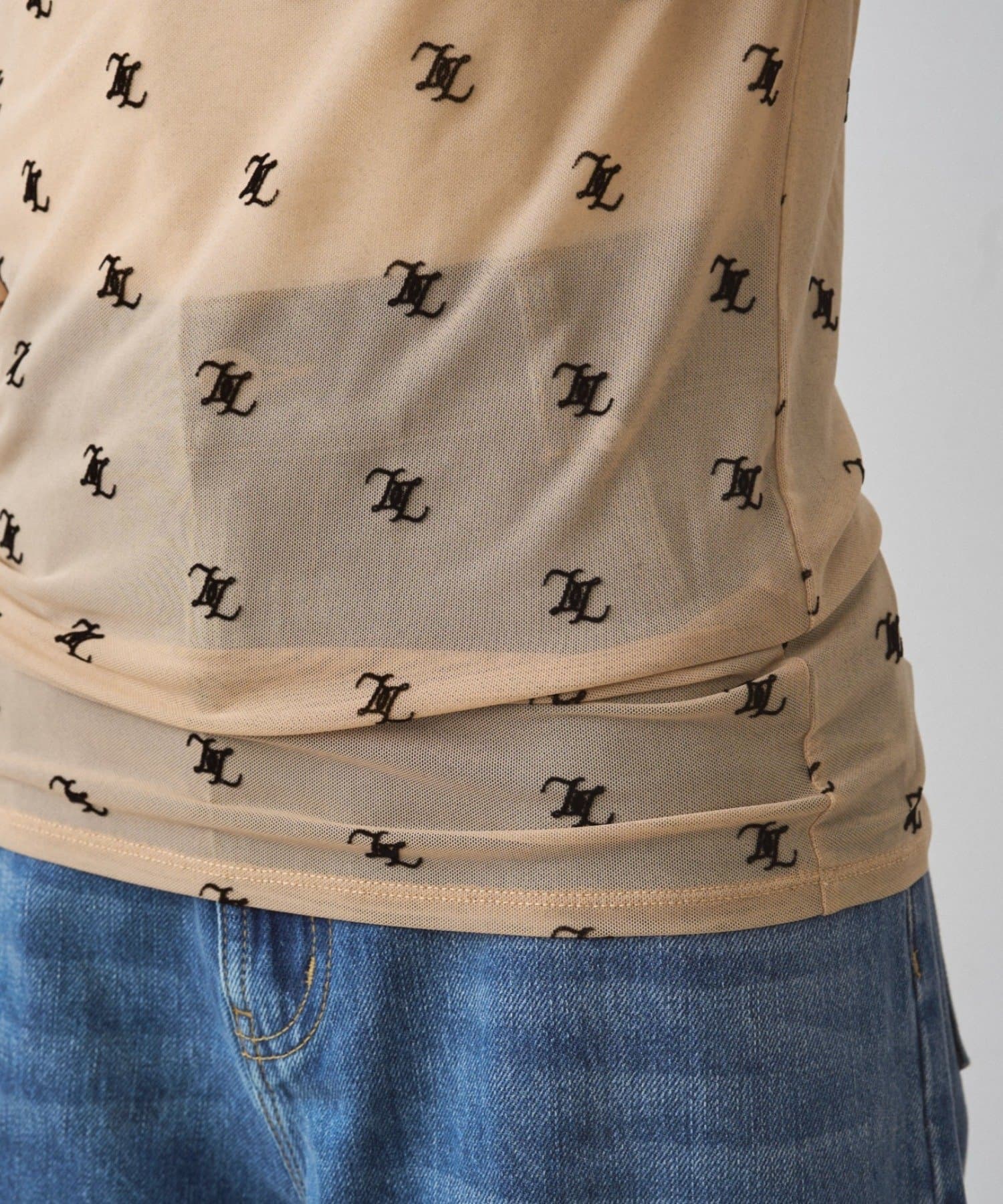 繊細な透け感と、全体に散りばめられたLOUNGEDRESSオリジナルモノグラム柄が印象的なシアートップス。