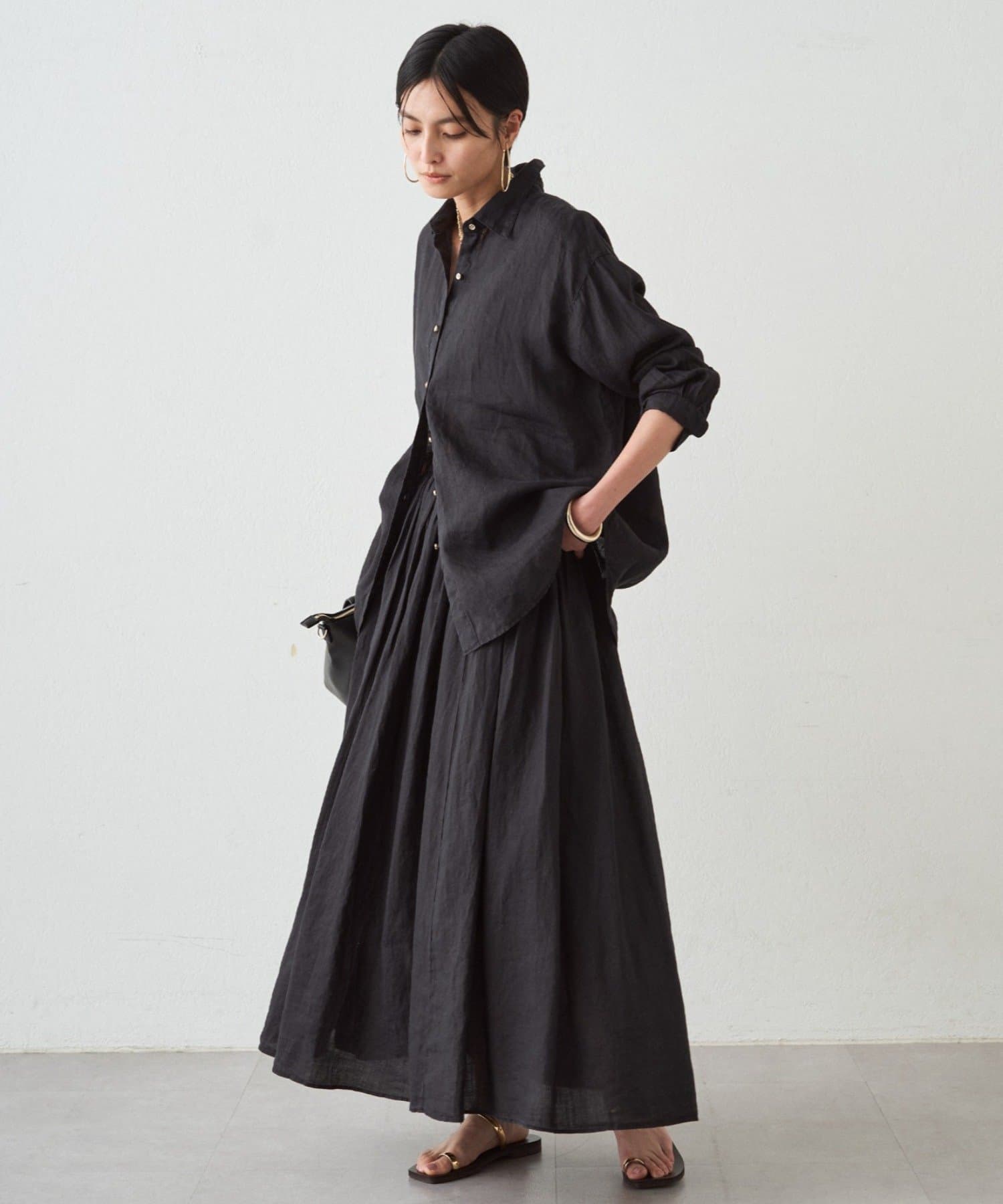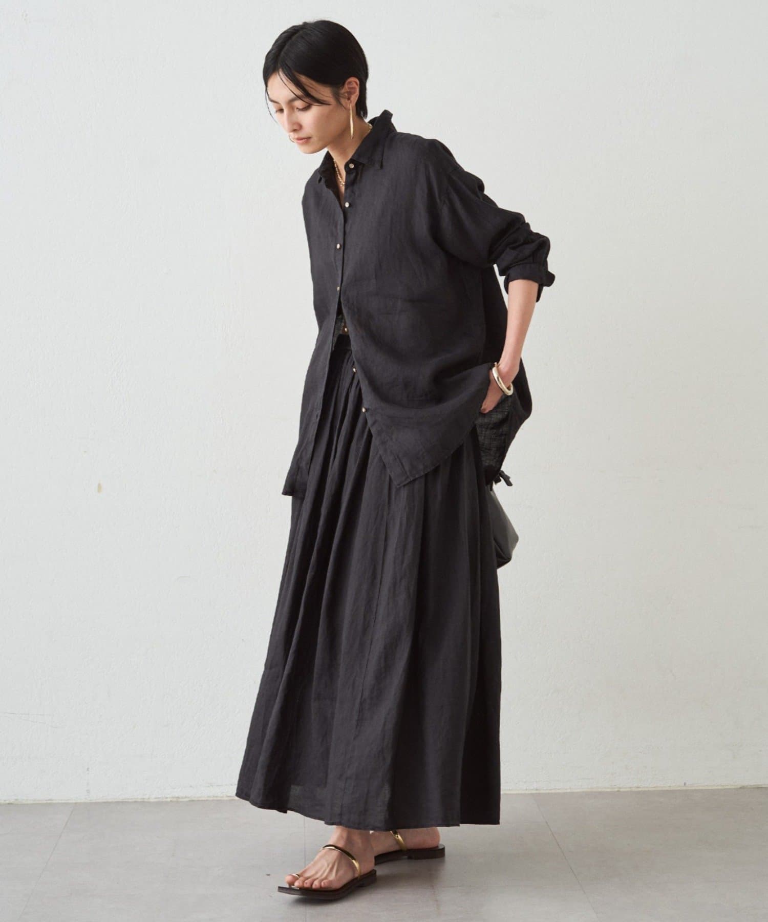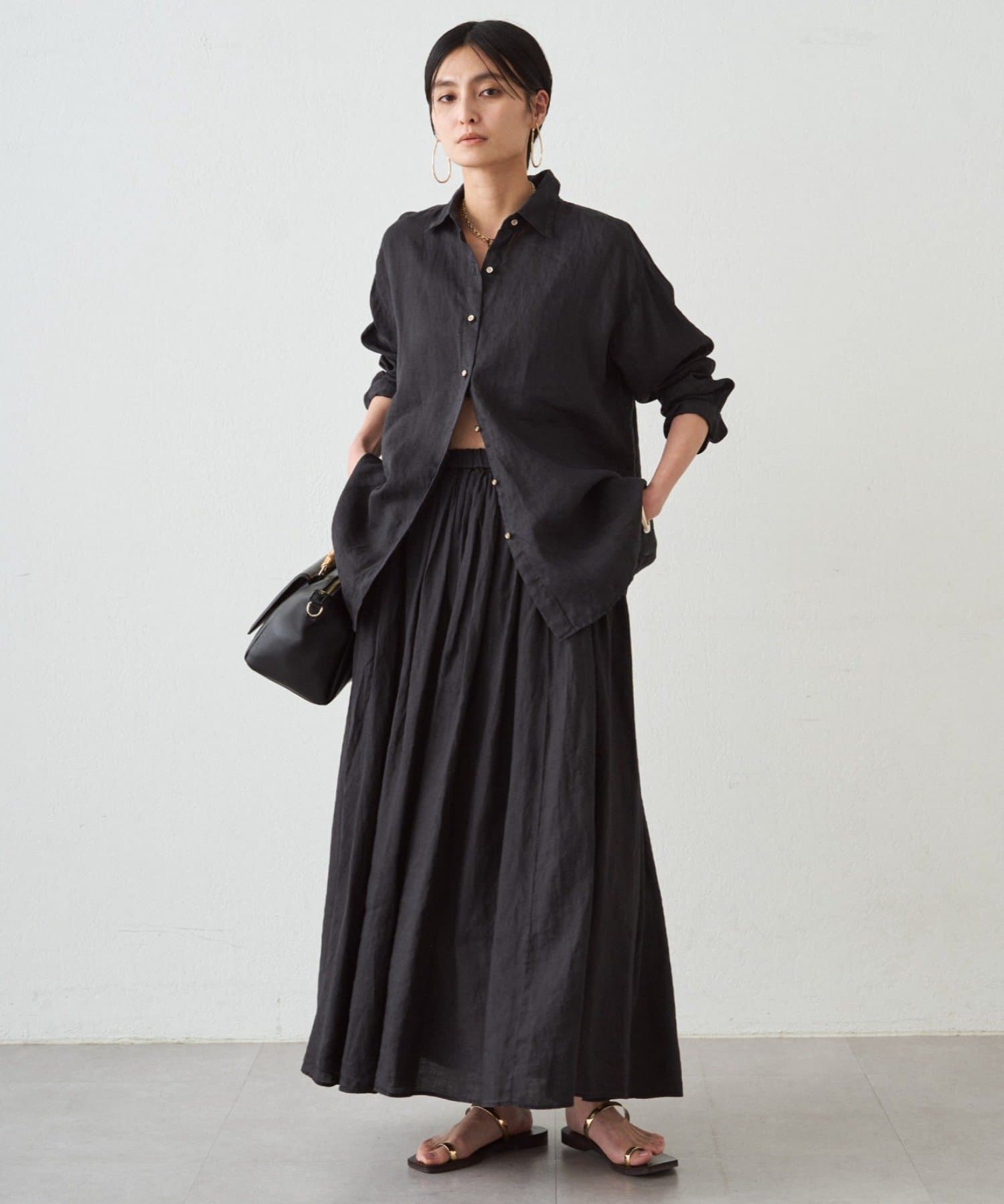 トップスをインしてもアウトしてもバランスよく着用でき、同素材のリネンバックタイシャツとのセットアップスタイルもおすすめです。