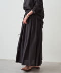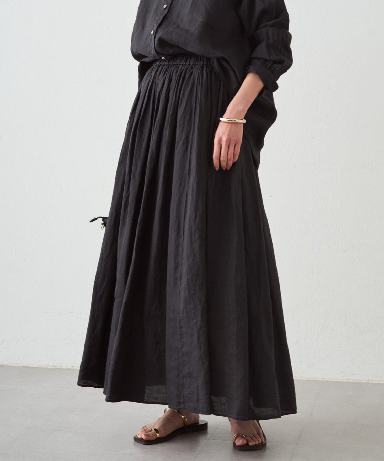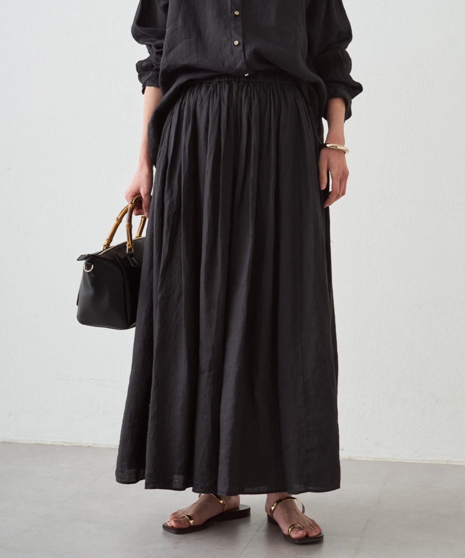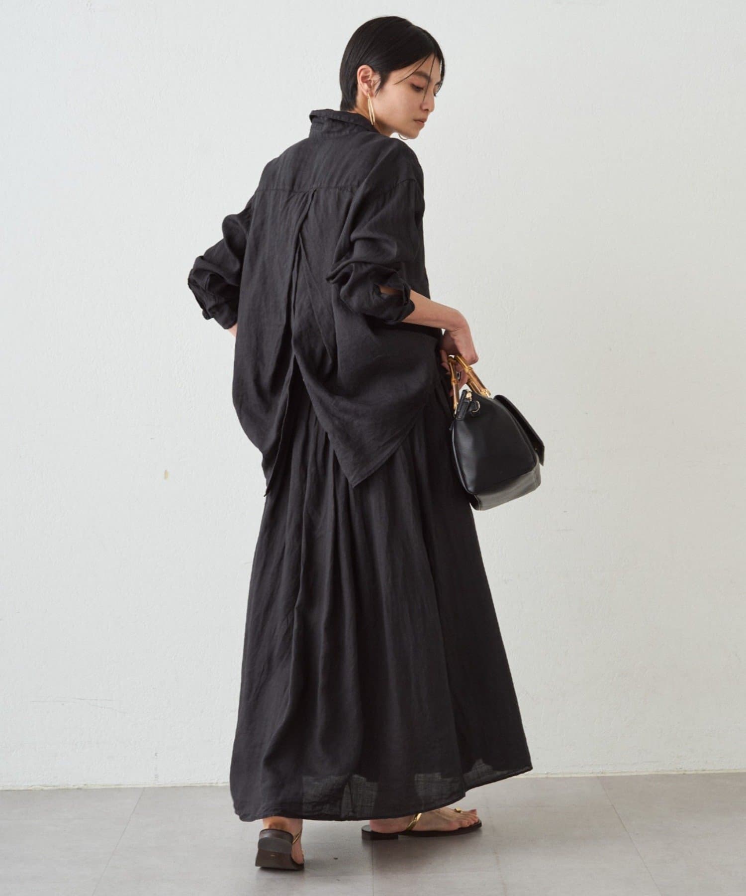 トップスをインしてもアウトしてもバランスよく着用でき、同素材のリネンバックタイシャツとのセットアップスタイルもおすすめです。