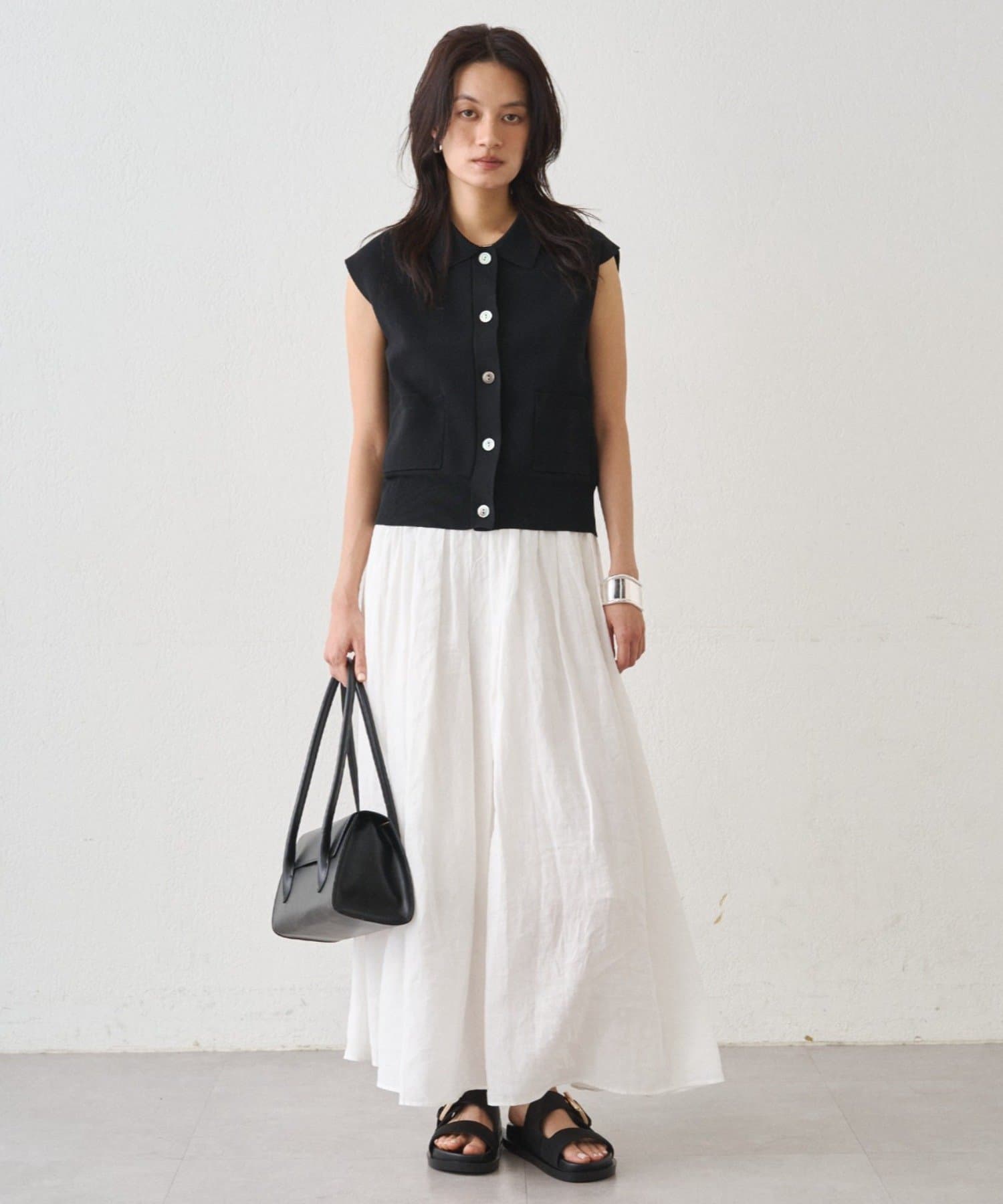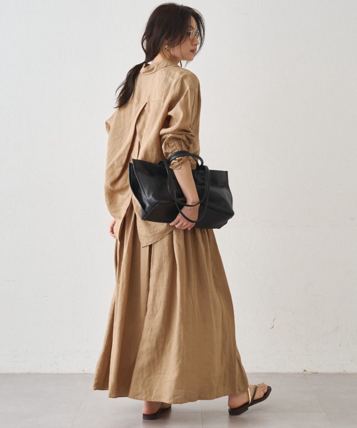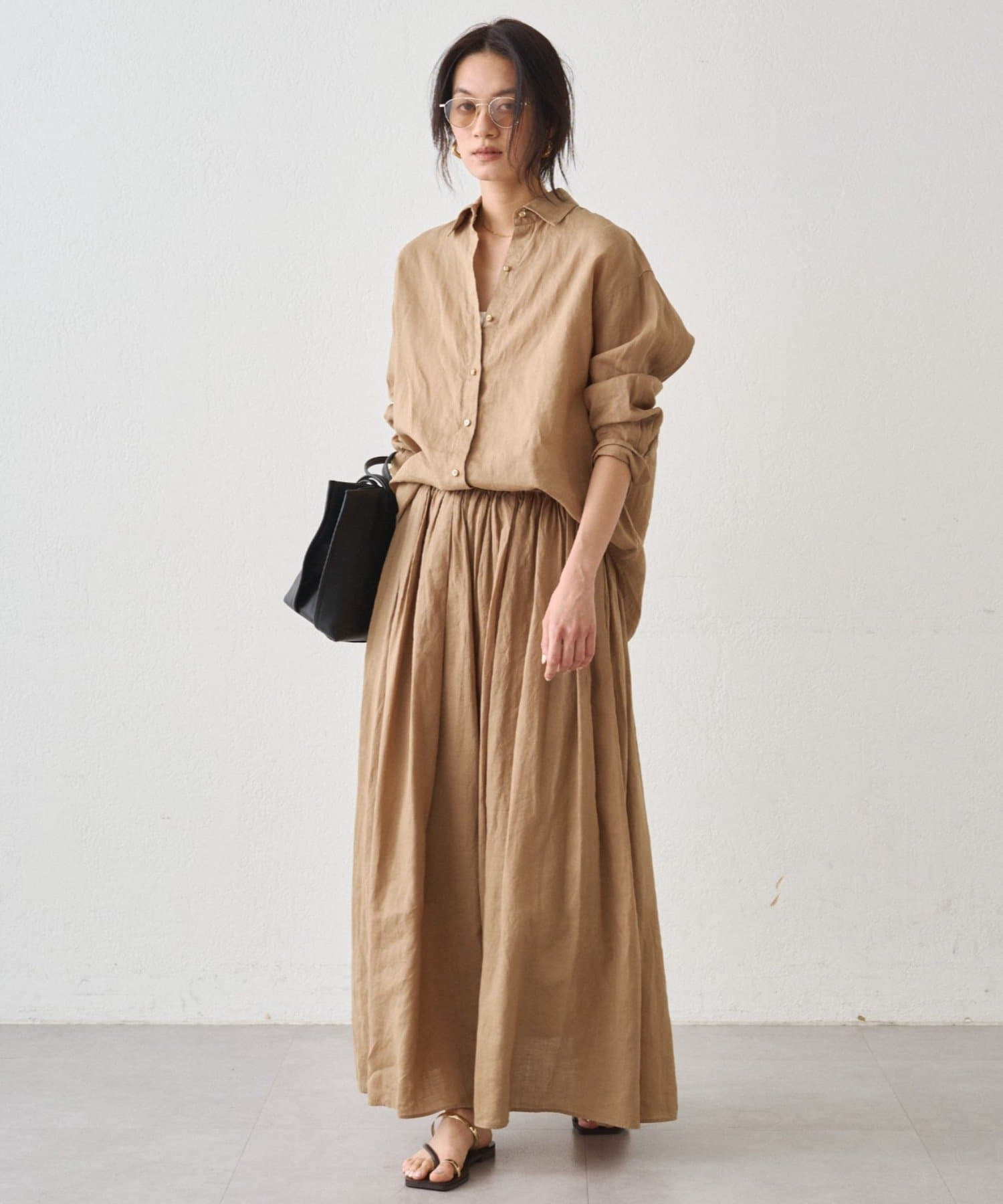 トップスをインしてもアウトしてもバランスよく着用でき、同素材のリネンバックタイシャツとのセットアップスタイルもおすすめです。