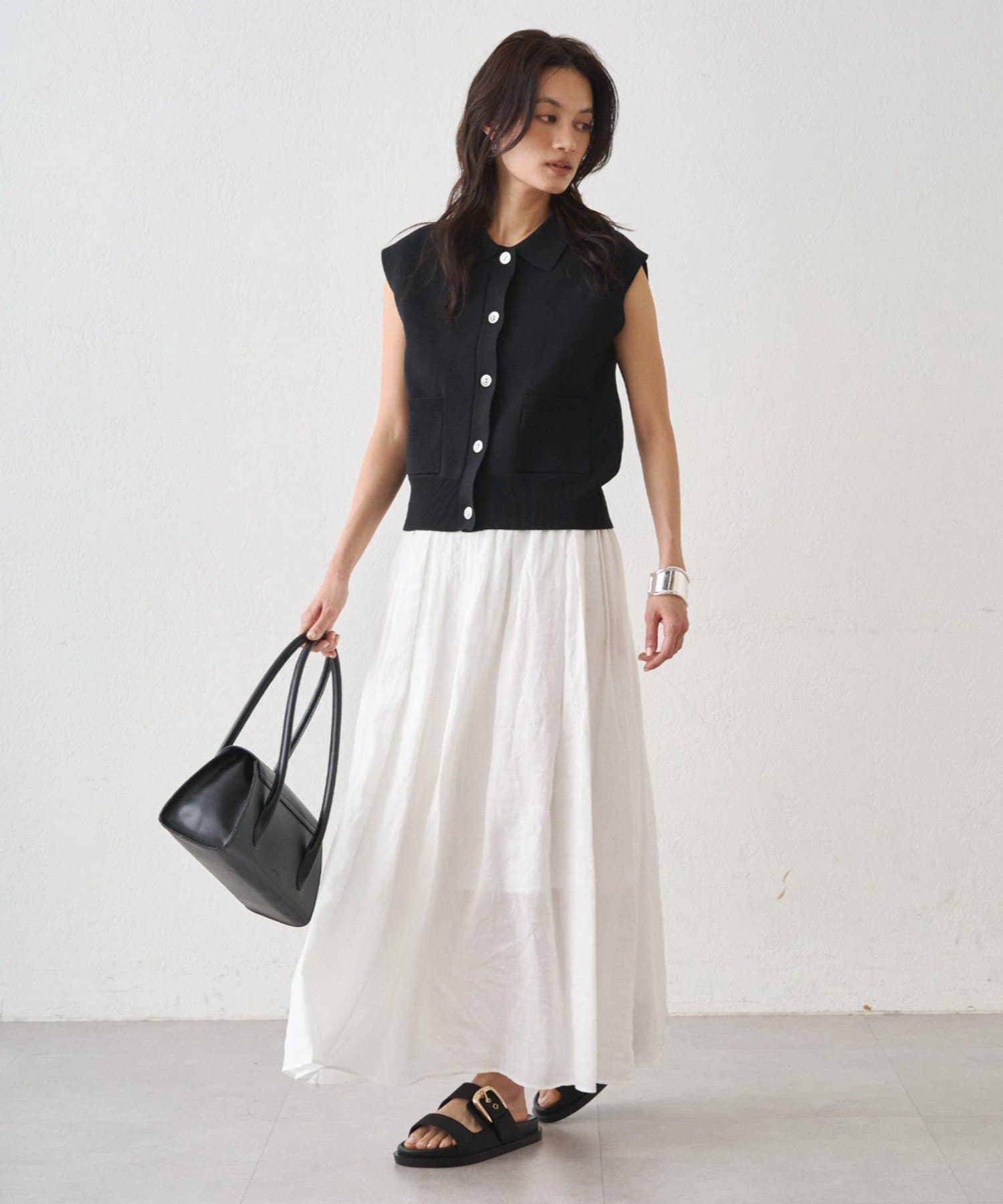 シンプルなデザインでトップスを選ばず、Tシャツと合わせればカジュアルに、ブラウスと合わせれば上品な印象に仕上がります。