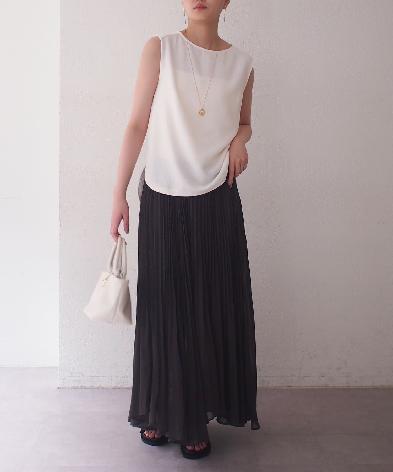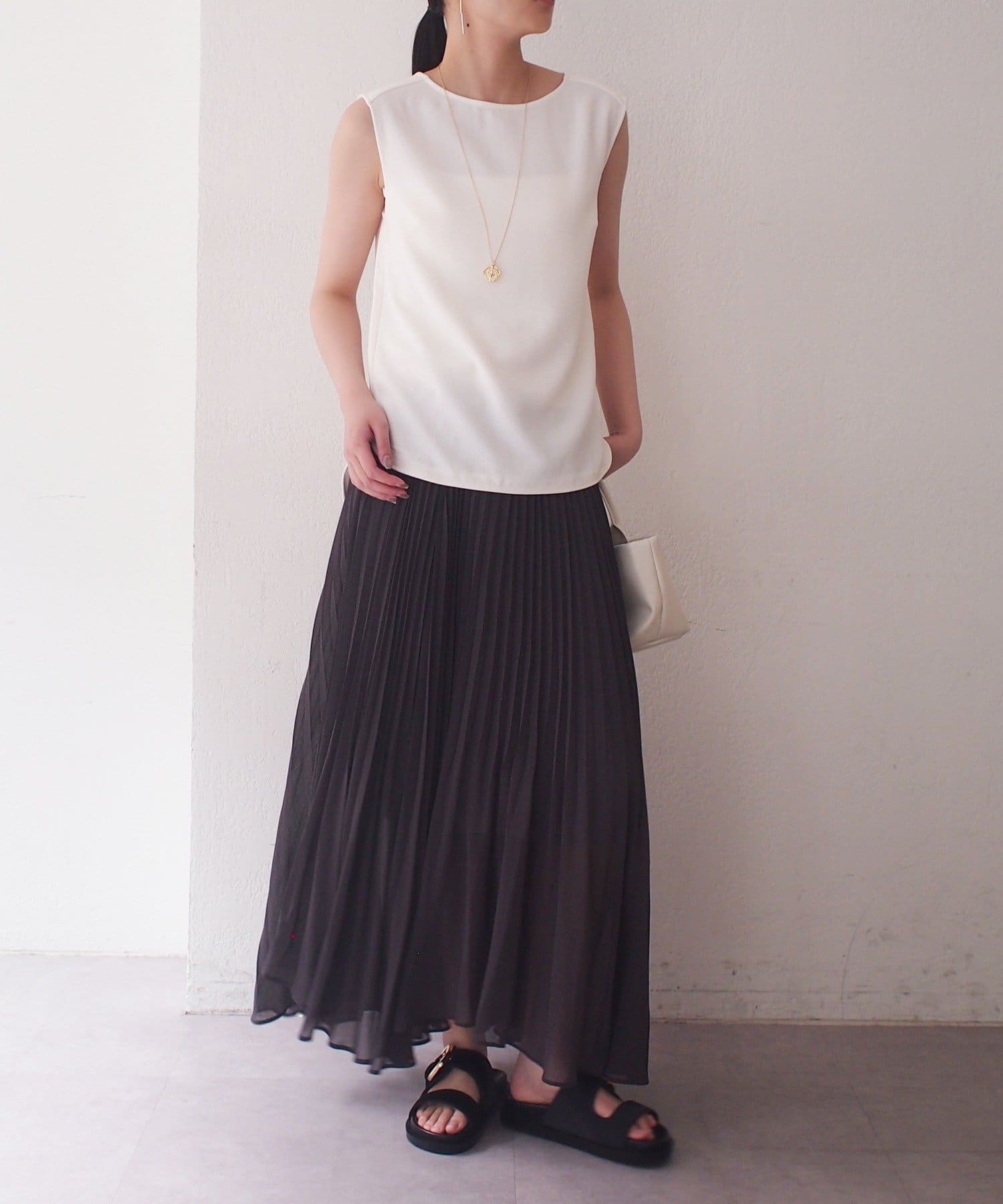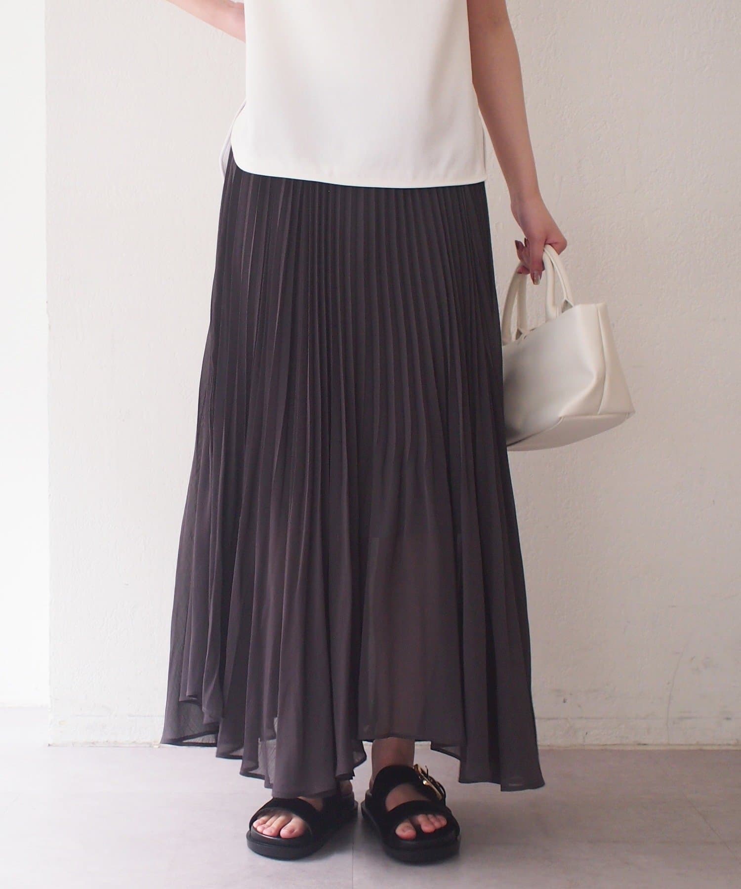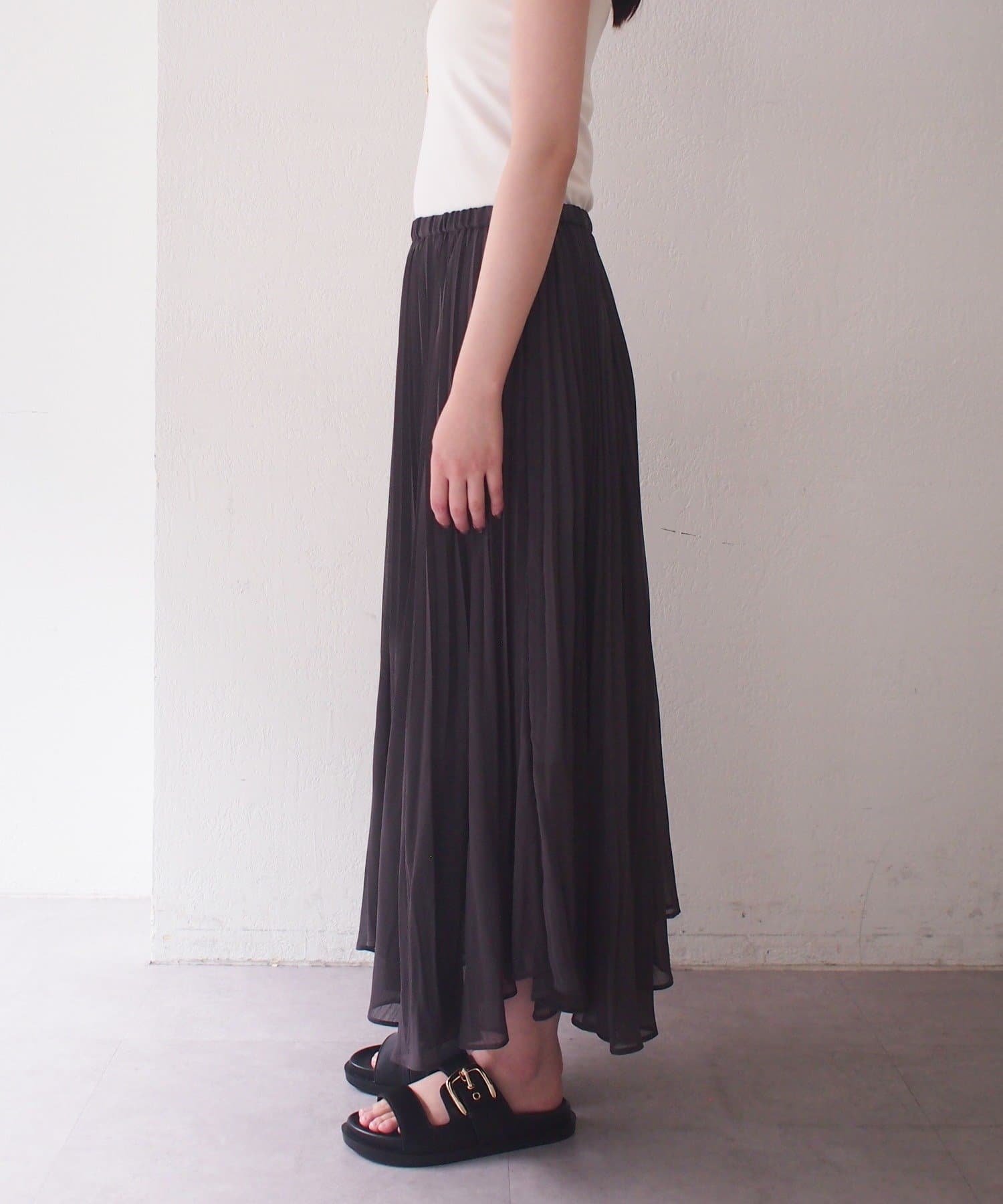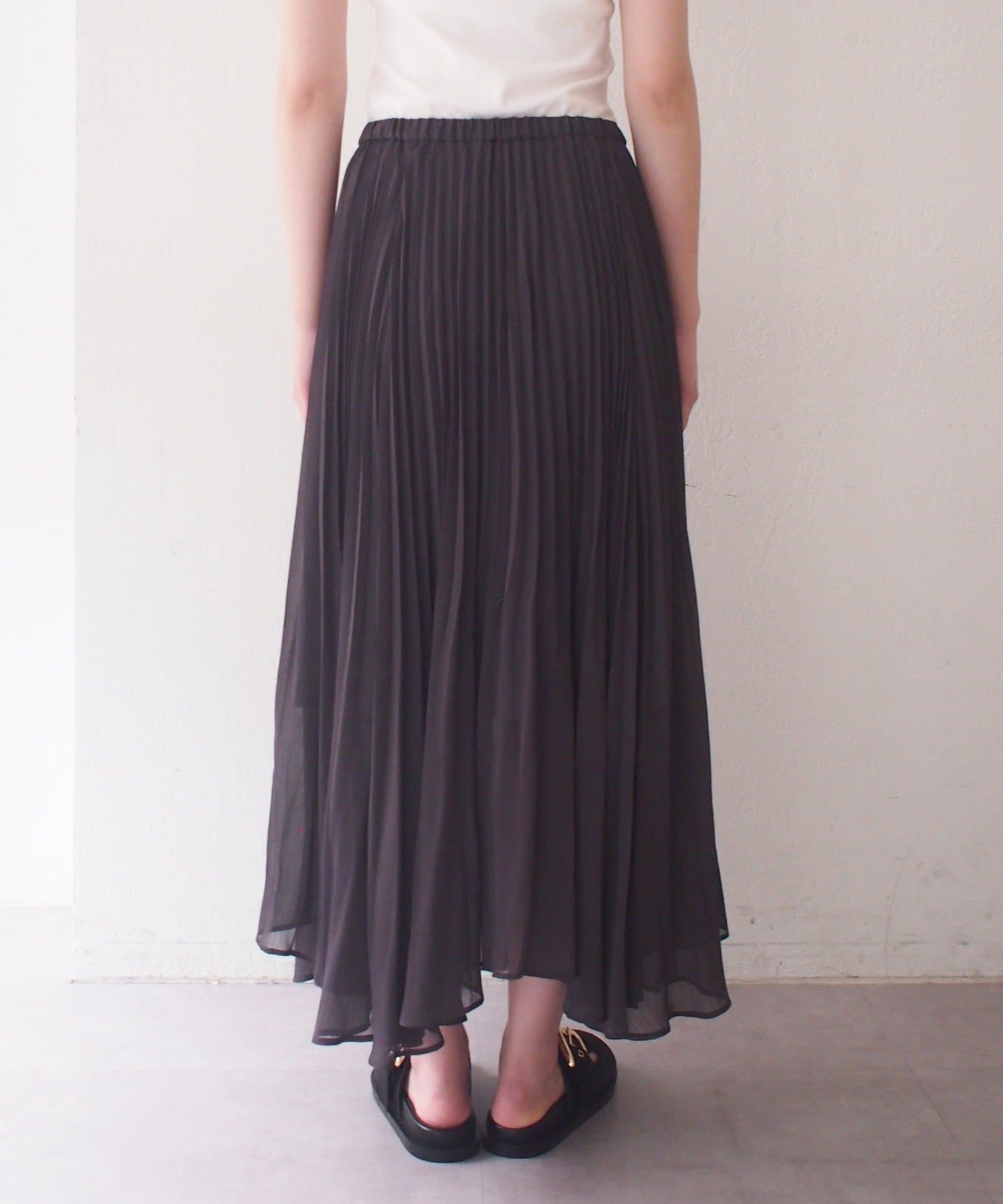 エアリーな素材がロング丈でも軽やかな印象を与え、繊細なプリーツが歩くたびに美しく揺れます。
