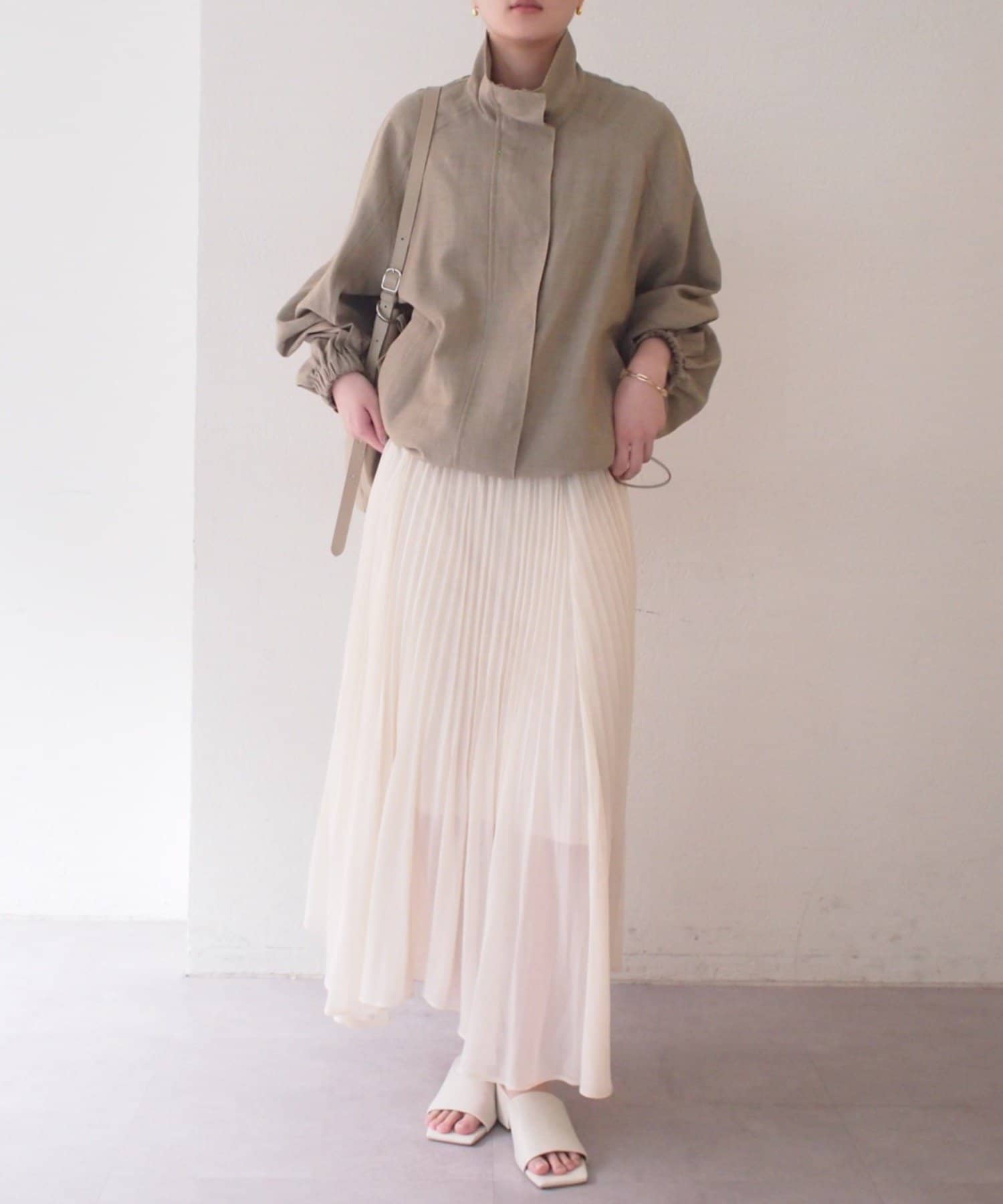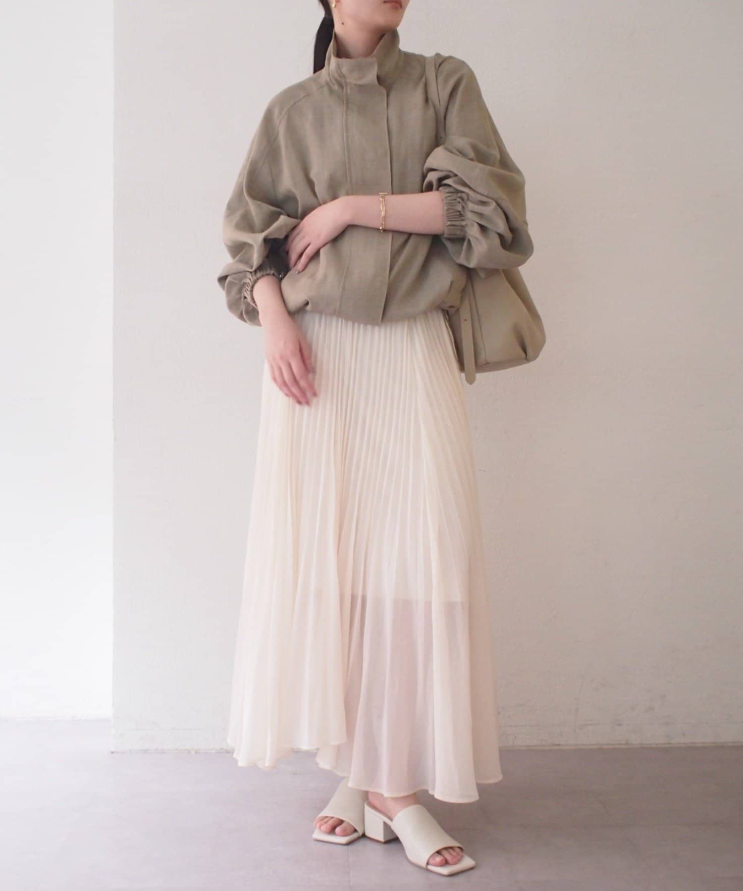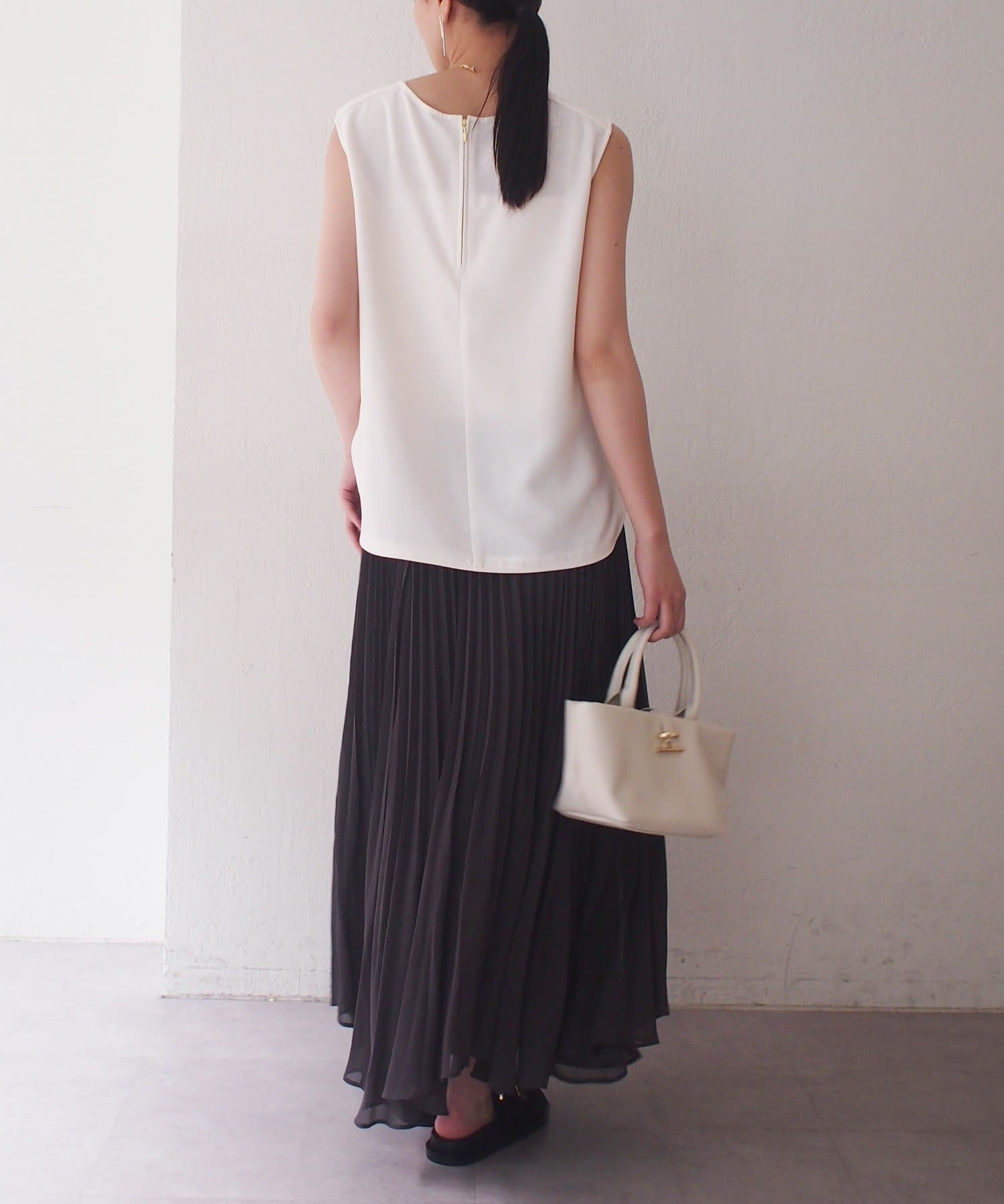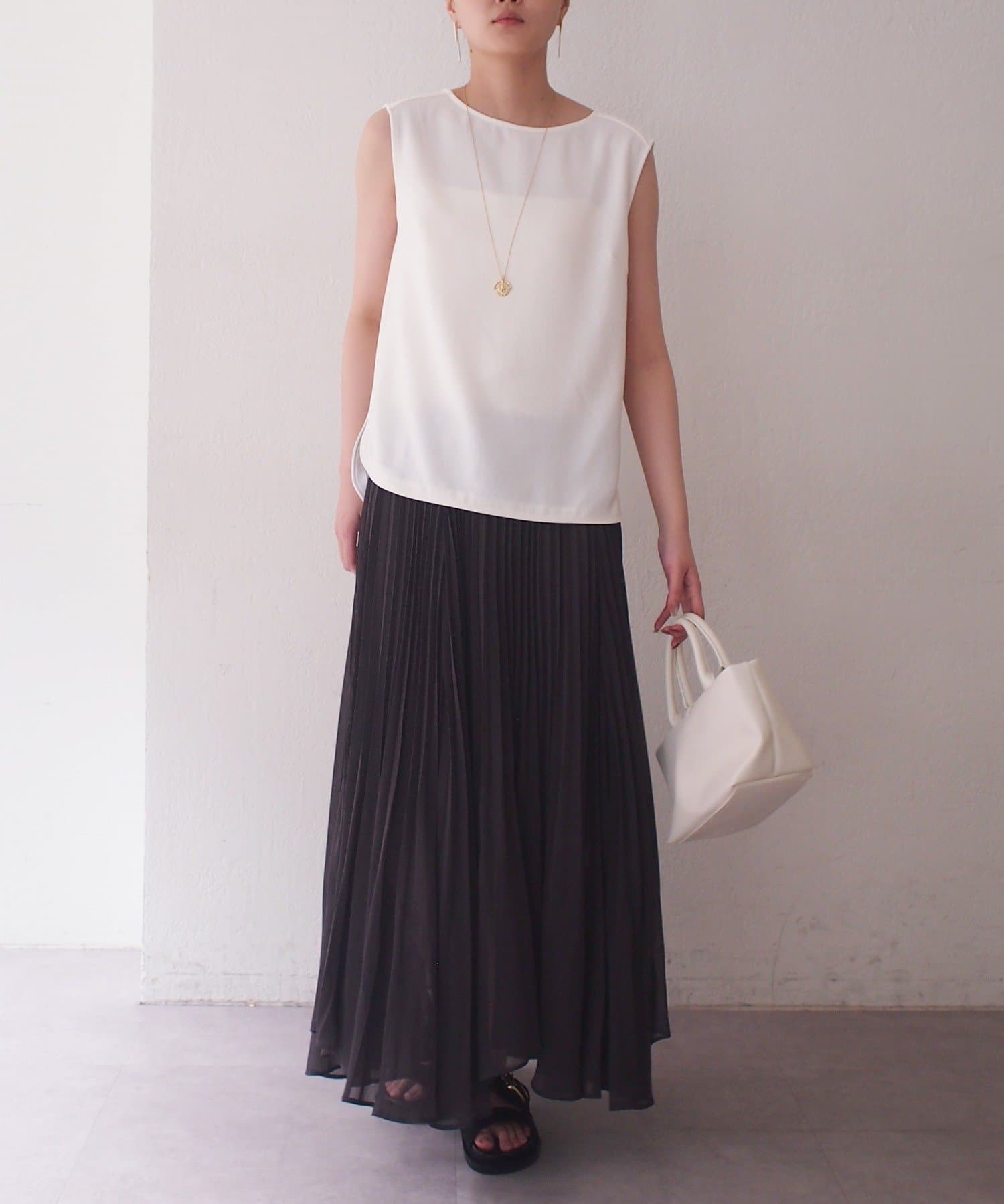 エアリーな素材がロング丈でも軽やかな印象を与え、繊細なプリーツが歩くたびに美しく揺れます。