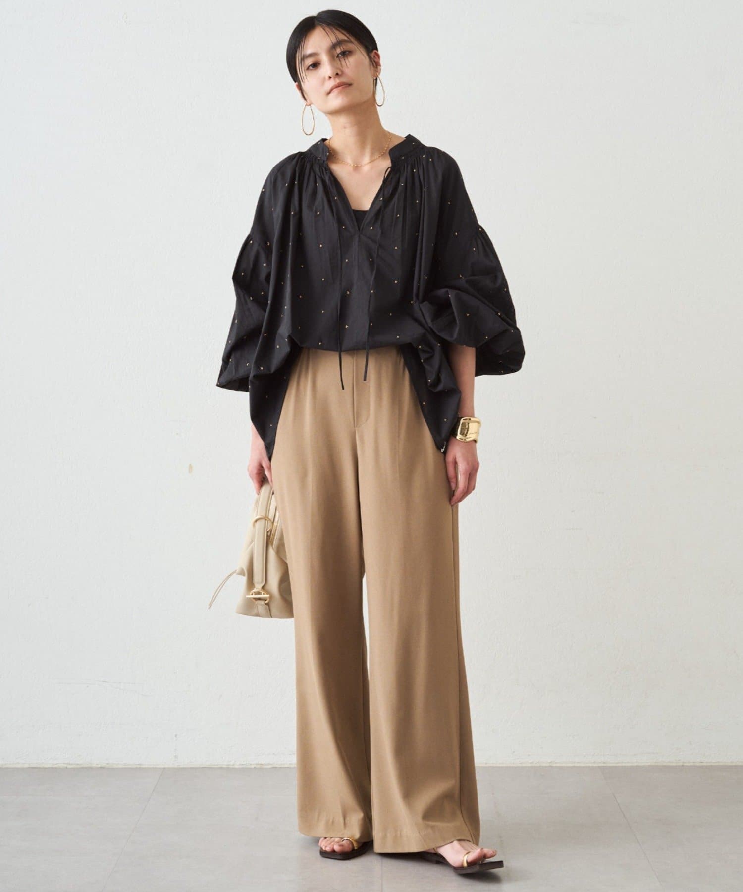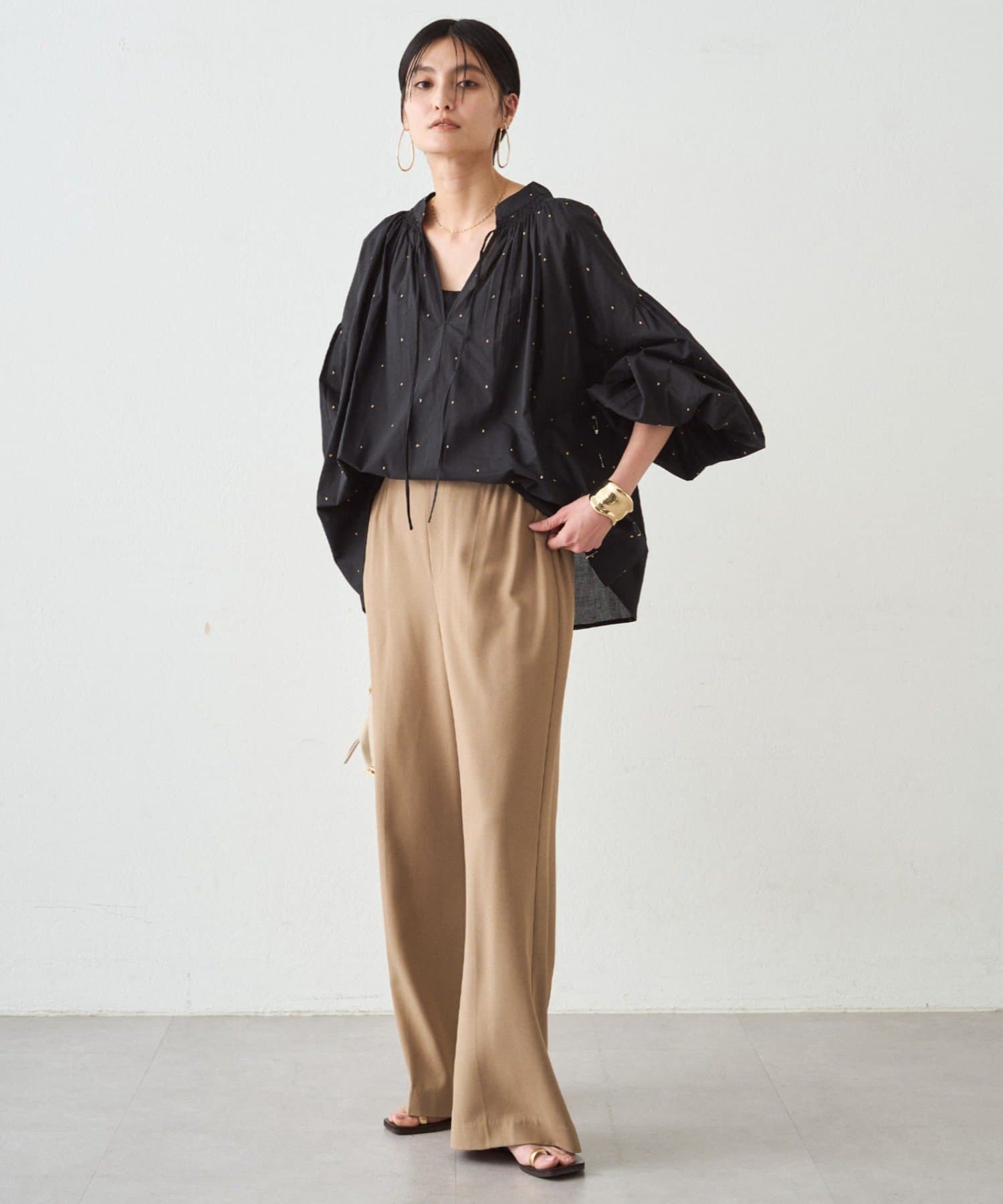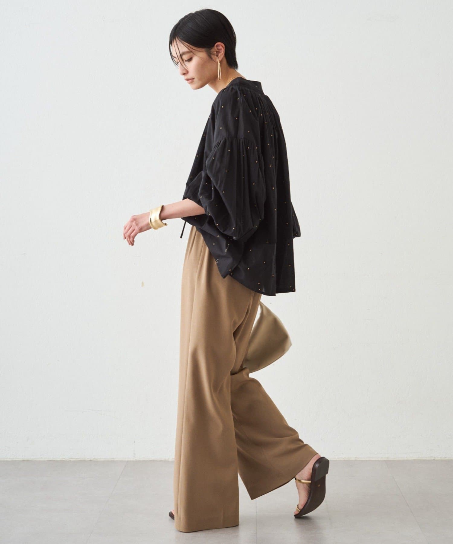 ウエスト一周ゴムで楽な着心地なのに、だらしなく見えないのが嬉しいポイント。